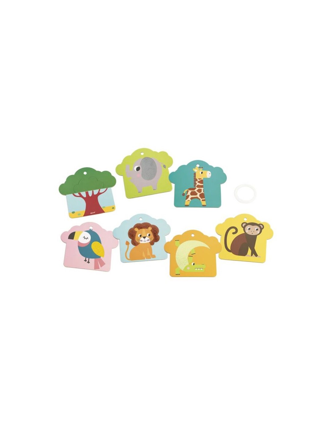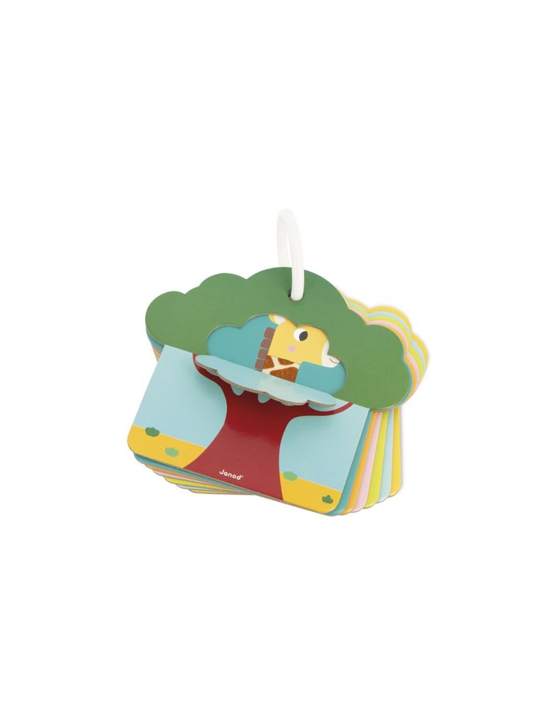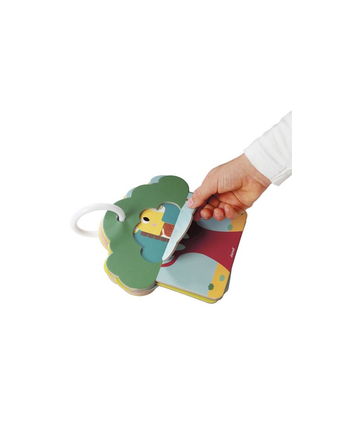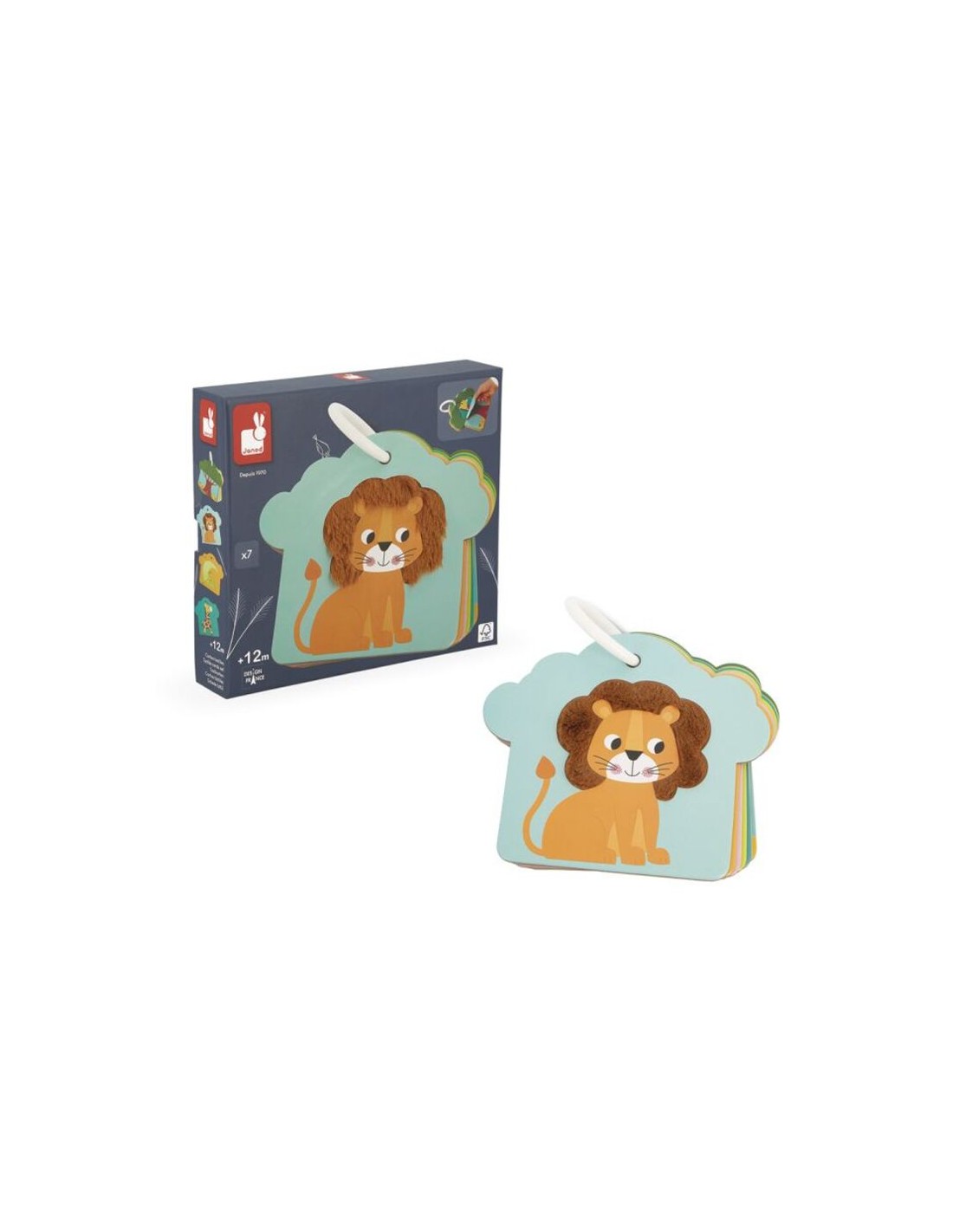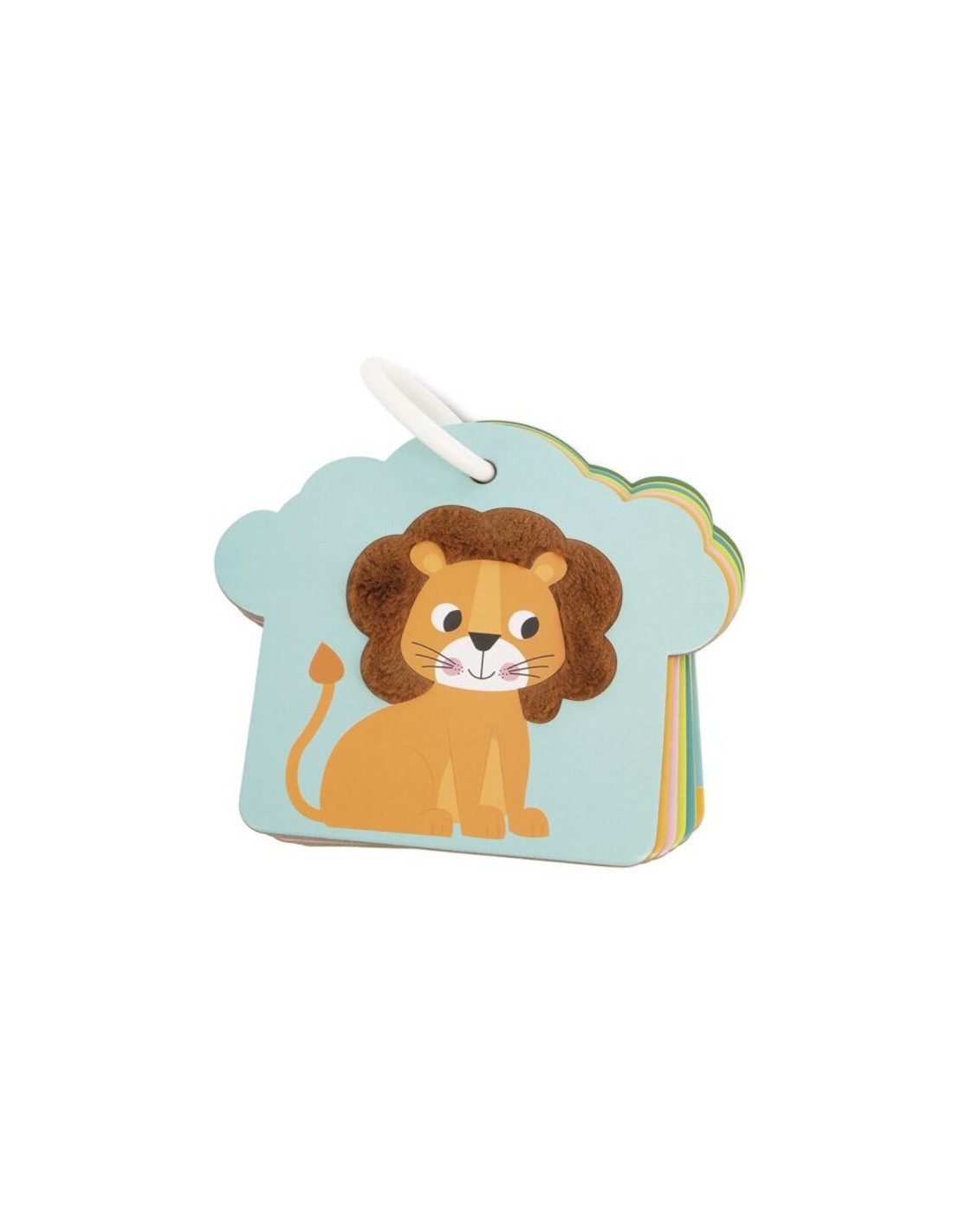 En estas tarjetas de cartón, grandes áreas de diferentes texturas permiten que sus pequeñas manos se familiaricen con los diferentes materiales: la suave melena del león o la piel rugosa del cocodrilo. Este set contiene 6 tarjetas de animales con materiales táctiles que van unidas por un anillo extraíble para sujetarlas y llevarlas a todas partes fácilmente. Una tarjeta de «árbol» con abertura en la parte delantera también permite jugar al escondite con las tarjetas.