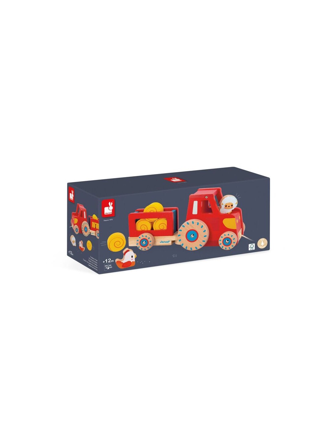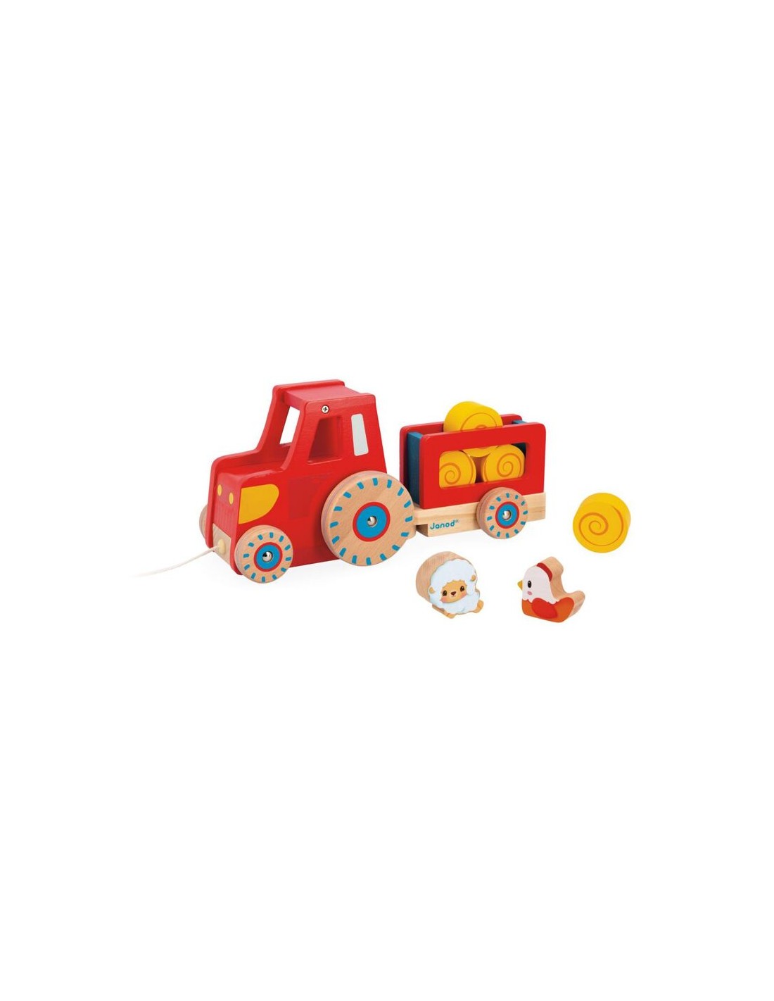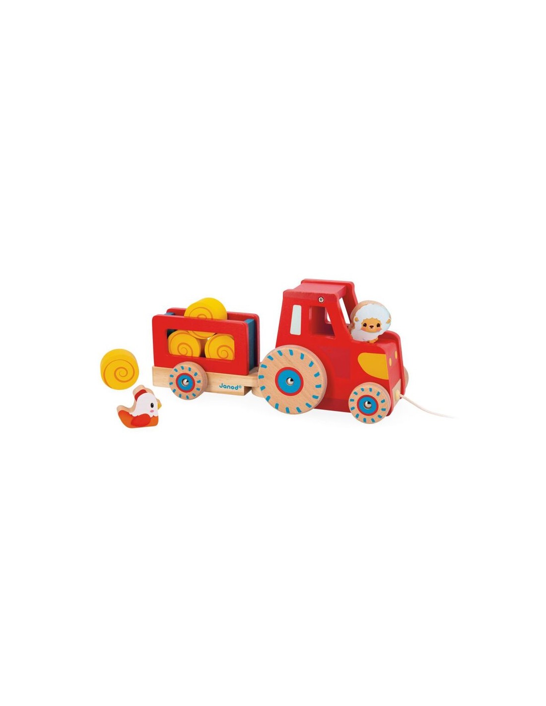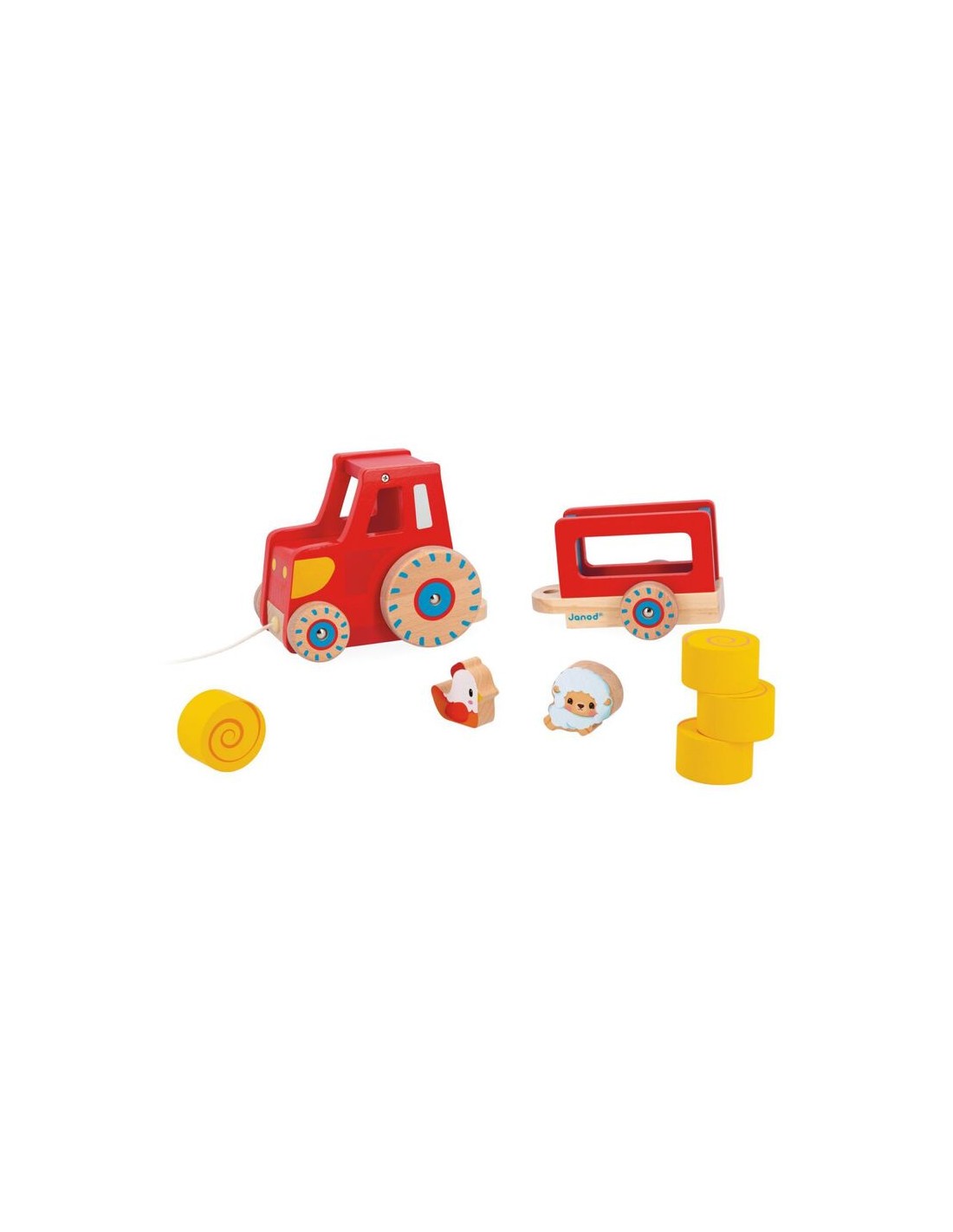¡Estimula la motricidad general del bebé y deja que se imagine las historias más entrañables con este bonito juguete de paseo de madera! Consta de un tractor con su remolque desmontable y 6 accesorios: 4 fardos de paja, 1 oveja y 1 gallina. Ideal para animar al bebé a moverse y seguirlo a todas partes, este juguete de primera infancia tiene las ruedas silenciosas gracias a una parte de silicona. ¡El niño solo tiene que coger el cordel y salir al campo, acompañado por su pequeño tractor de madera!