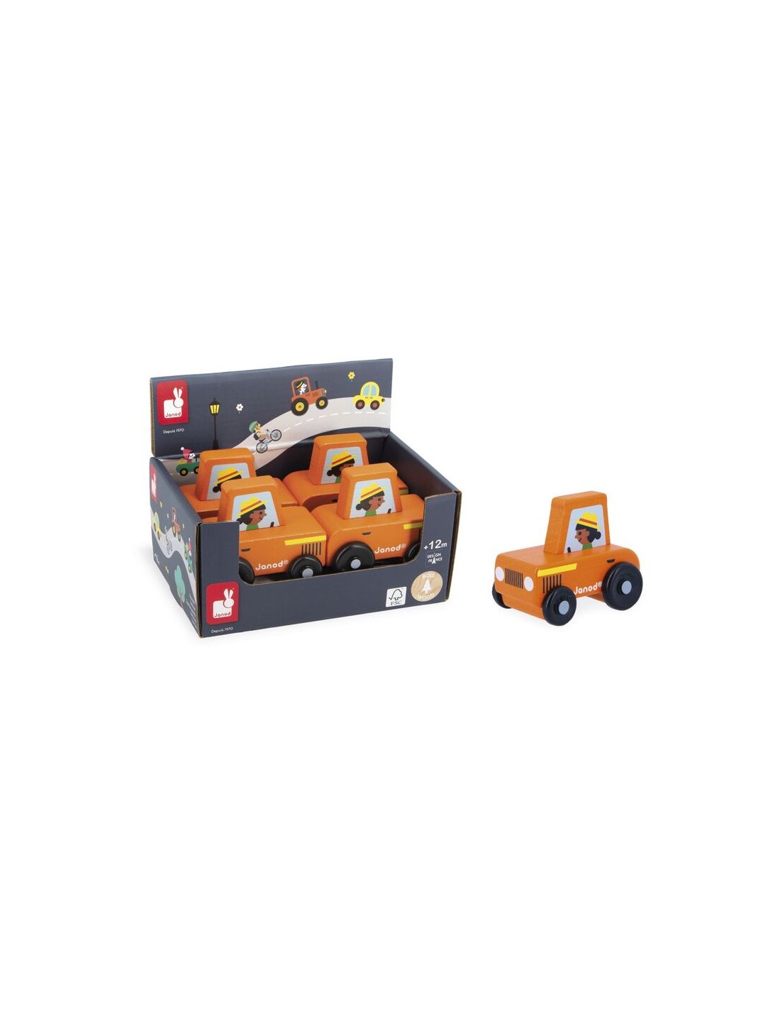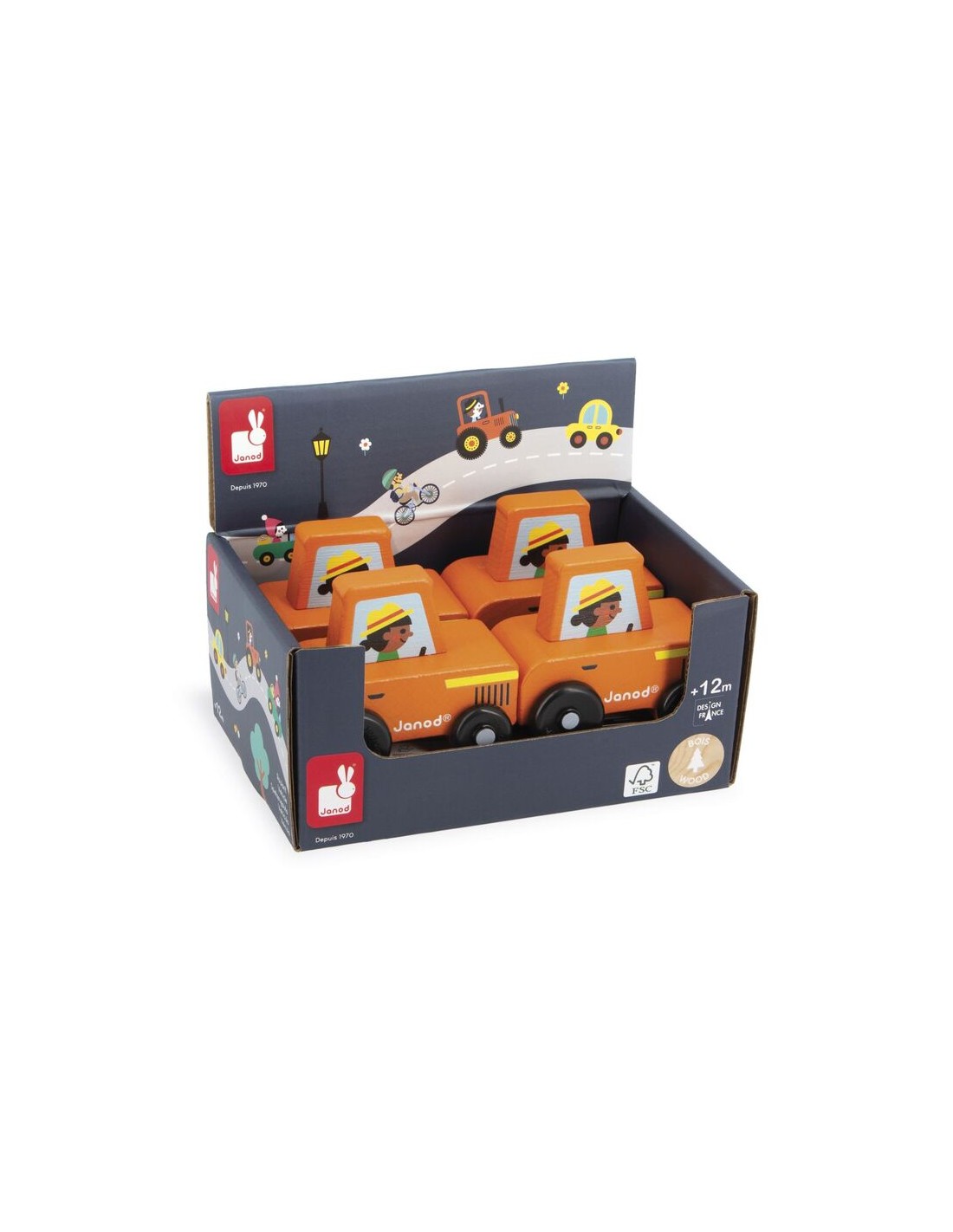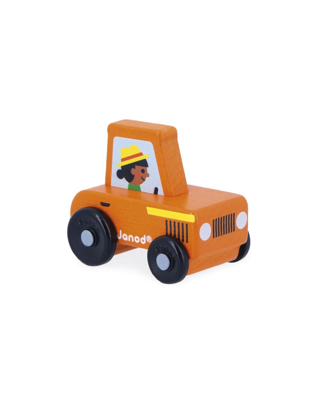 "¡Al huerto! Este cochecito de madera es perfecto para niños a partir de 12 meses. Con su tractor rojo, la granjera se dirige a los campos para cuidar de su cosecha. Su forma ha sido especialmente diseñada para que los más pequeños puedan sujetarlo y hacerlo rodar con facilidad. Los vehículos son perfectos para inventar un montón de historias y desarrollar su imaginación. Primero, los bebés se divierten haciéndolos rodar; después, los niños más mayores pueden contarse todo tipo de aventuras y desarrollar su vocabulario y creatividad.