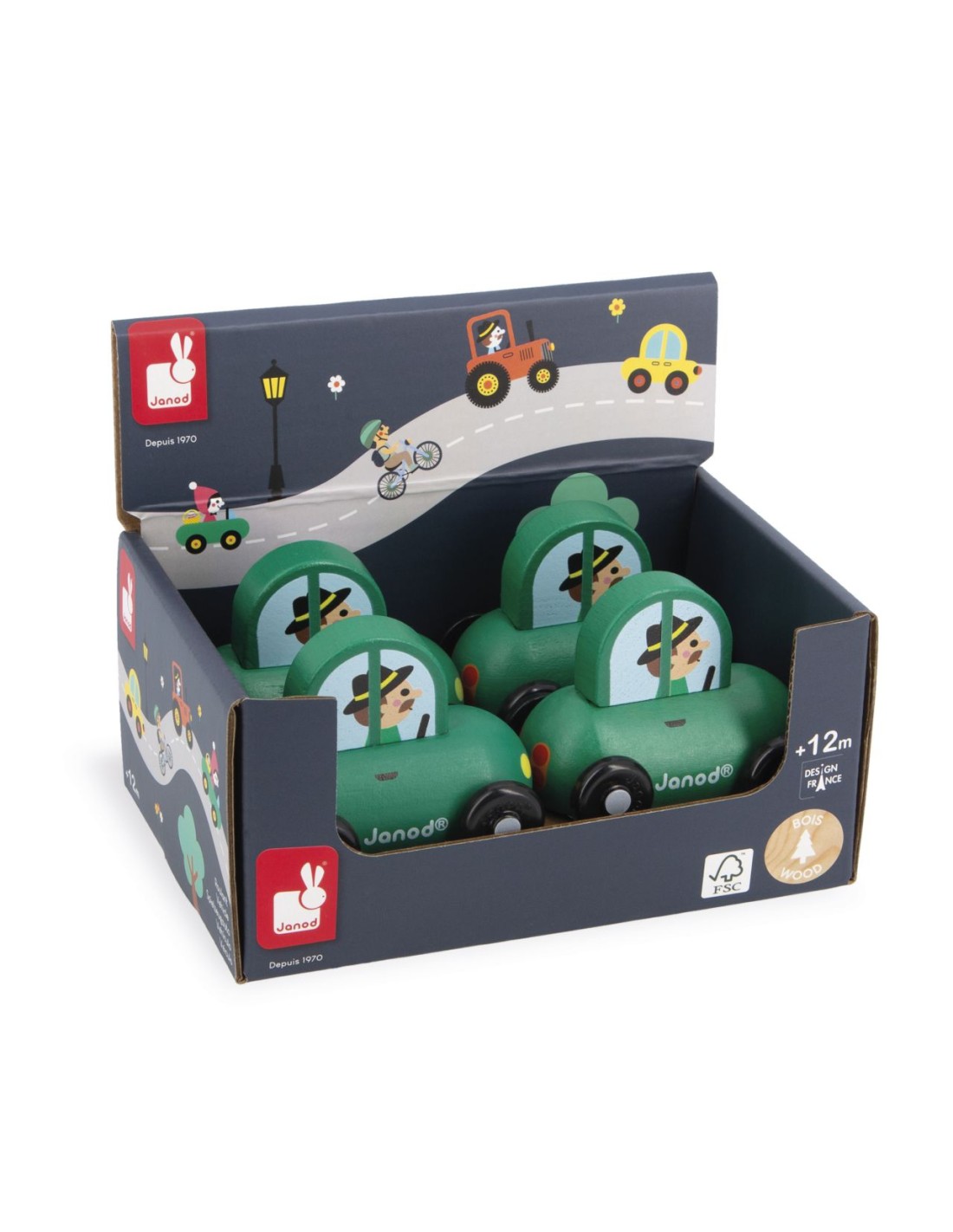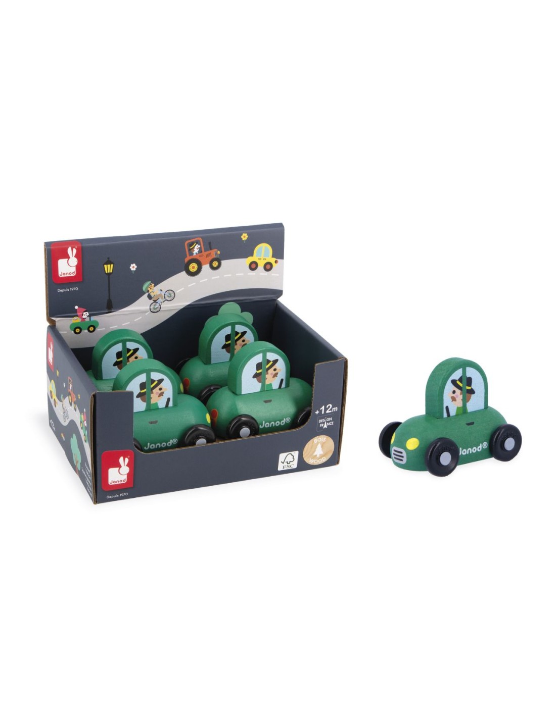"¡Vamos a por el pan con el abuelo! Este cochecito de madera es perfecto para niños a partir de 12 meses. Con su pequeño coche verde, el abuelo podrá disfrutar recorriendo los caminos rurales para visitar a los tenderos locales. La forma del coche se ha diseñado especialmente para que los más pequeños puedan sujetarlo y hacerlo rodar con facilidad. Los vehículos son perfectos para inventar montones de historias y desarrollar su imaginación. Primero, los bebés se divierten haciéndolos rodar; después, los niños más mayores pueden contarse todo tipo de aventuras y desarrollar su vocabulario y creatividad.