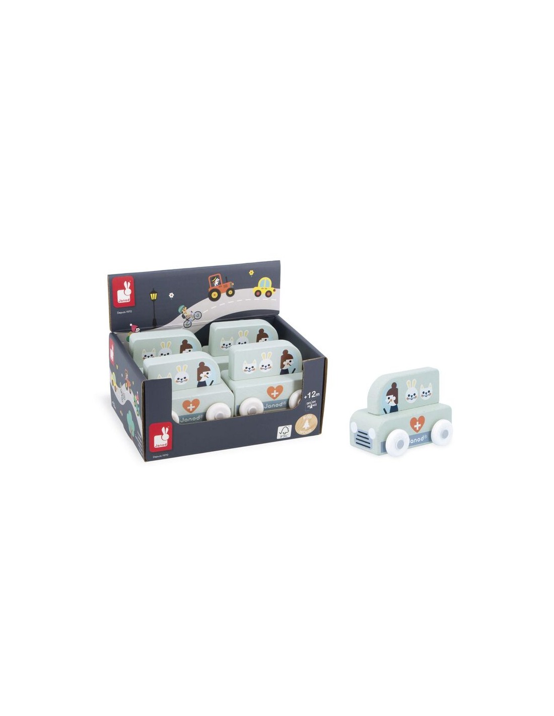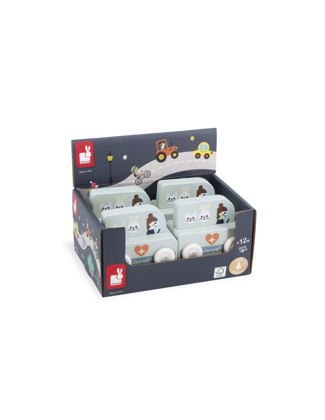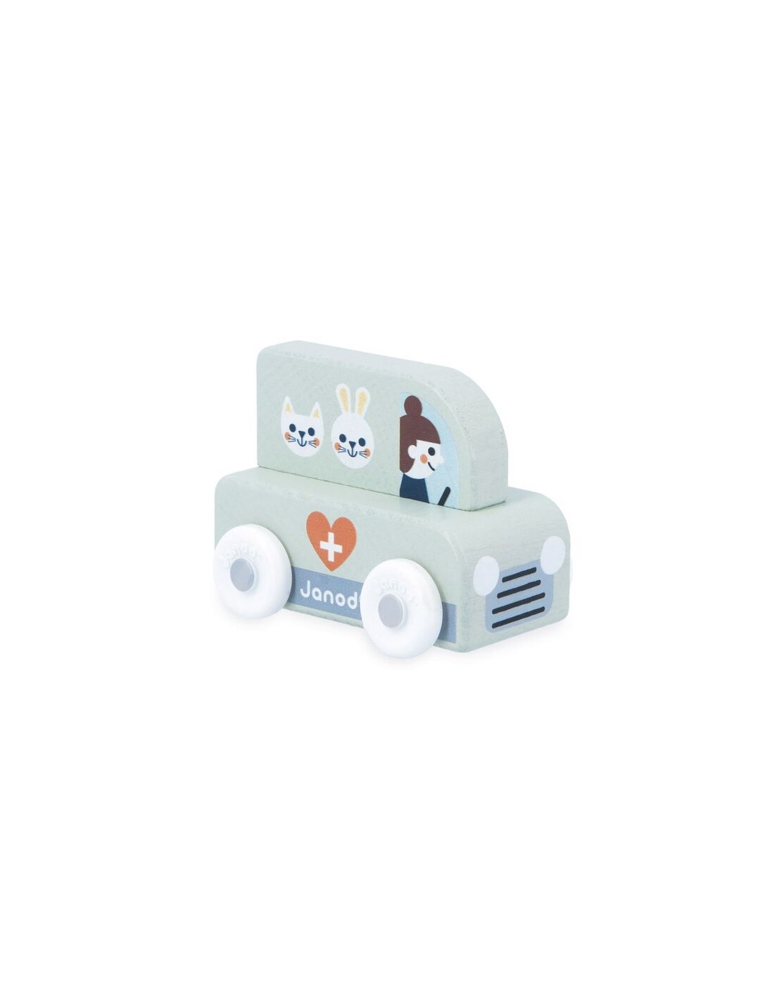 "¿Una emergencia con sus mascotas? ¡Ya voy!" Este cochecito de madera es apto para niños a partir de 12 meses. Con su furgoneta, la veterinaria puede ocuparse tanto de los animales domésticos como de los salvajes. La forma de la furgoneta se ha diseñado especialmente para que los más pequeños puedan sujetarla y hacerla rodar con facilidad. Los vehículos son perfectos para inventar un montón de historias y desarrollar su imaginación. Primero, los bebés se divierten haciéndolos rodar; después, los niños más mayores pueden contarse todo tipo de aventuras y desarrollar su vocabulario y creatividad.