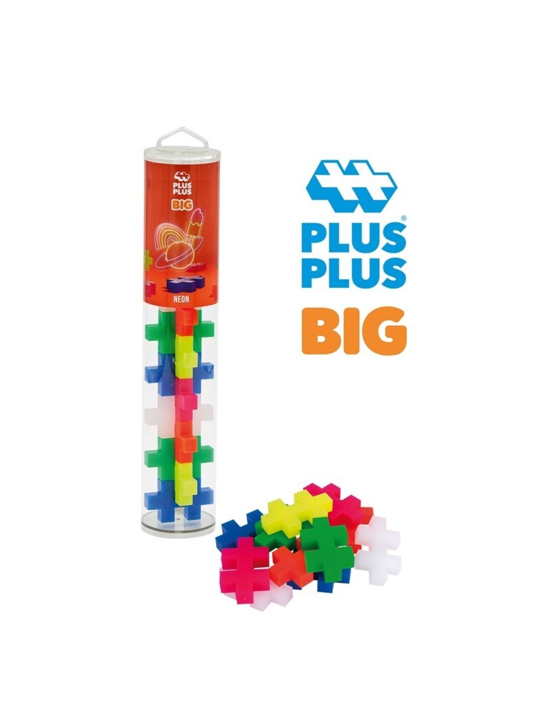 Tubo Plus-Plus BIG Neón 15 pcs: juego educativo con piezas grandes y colores vibrantes para estimular la creatividad infantil desde los 12 meses.
