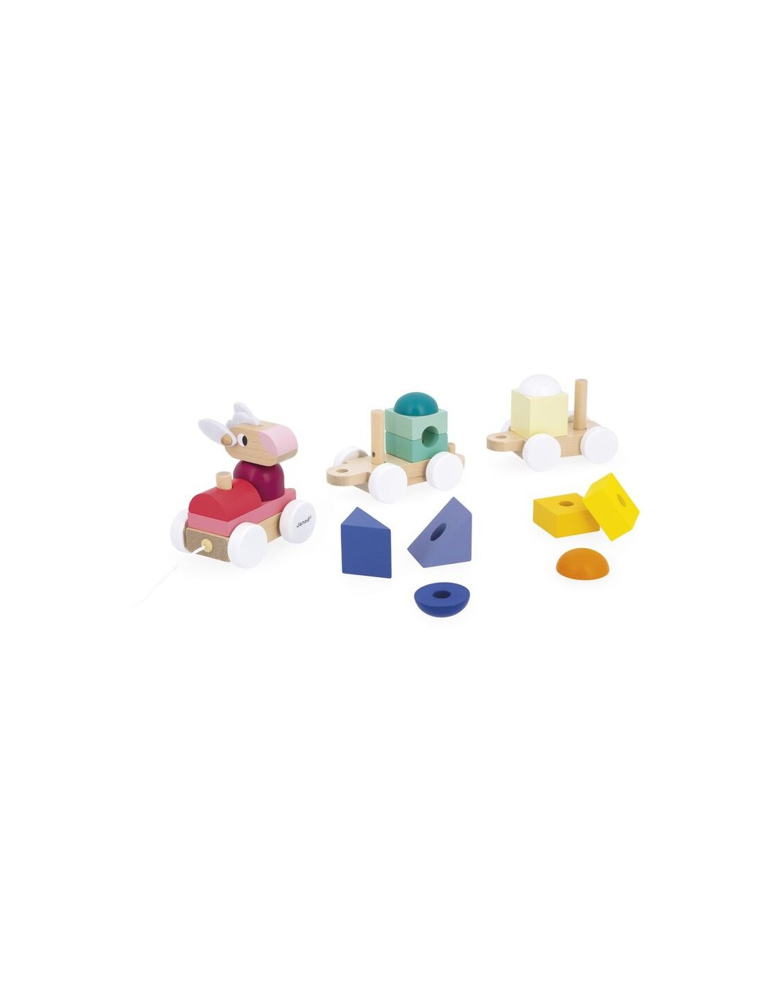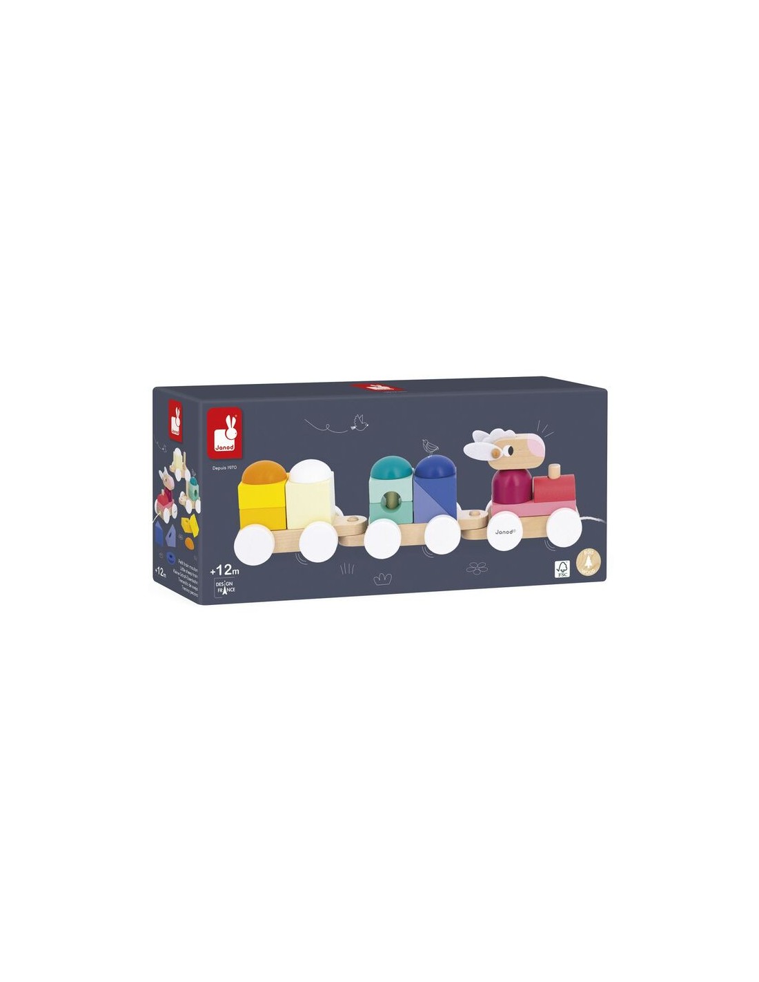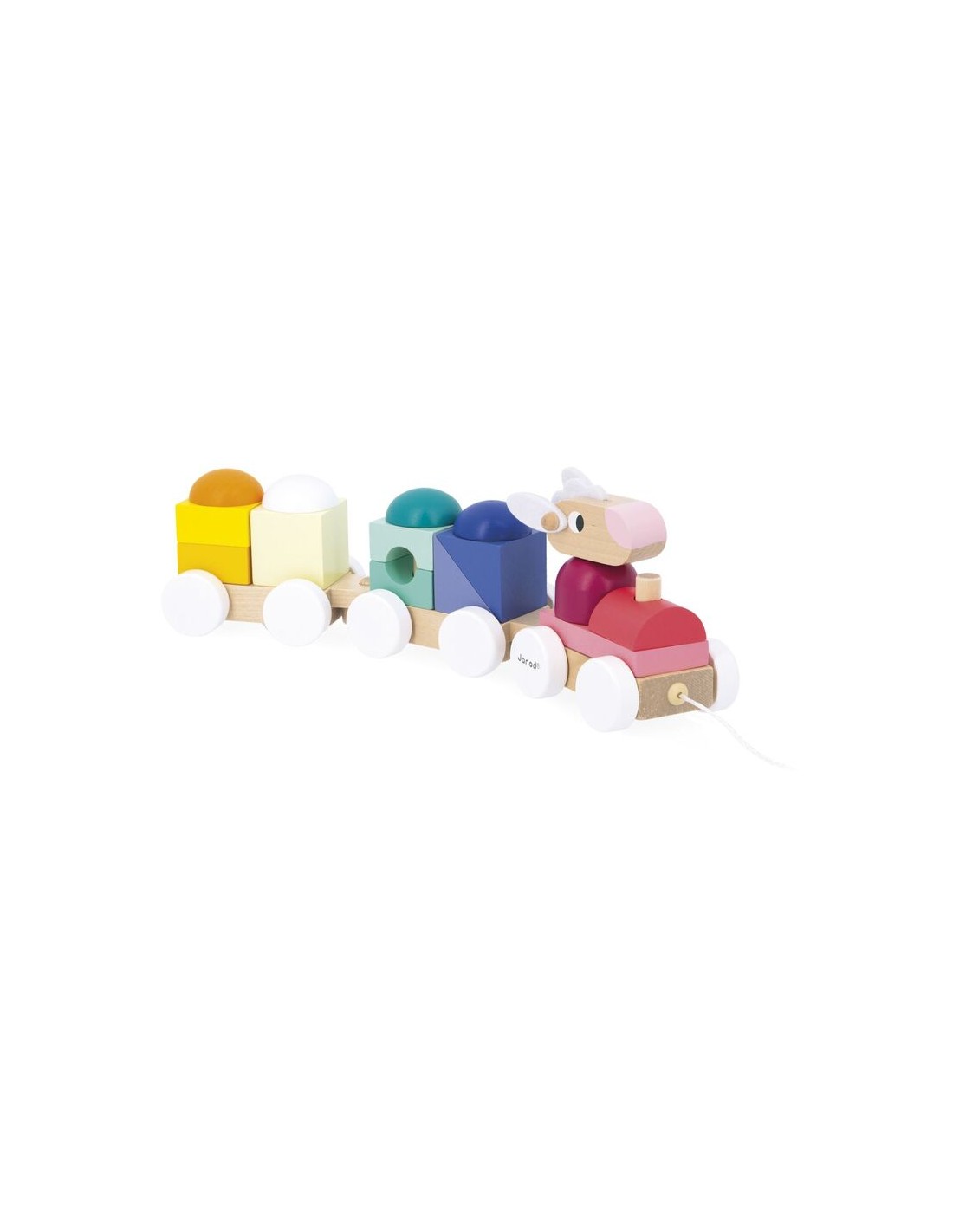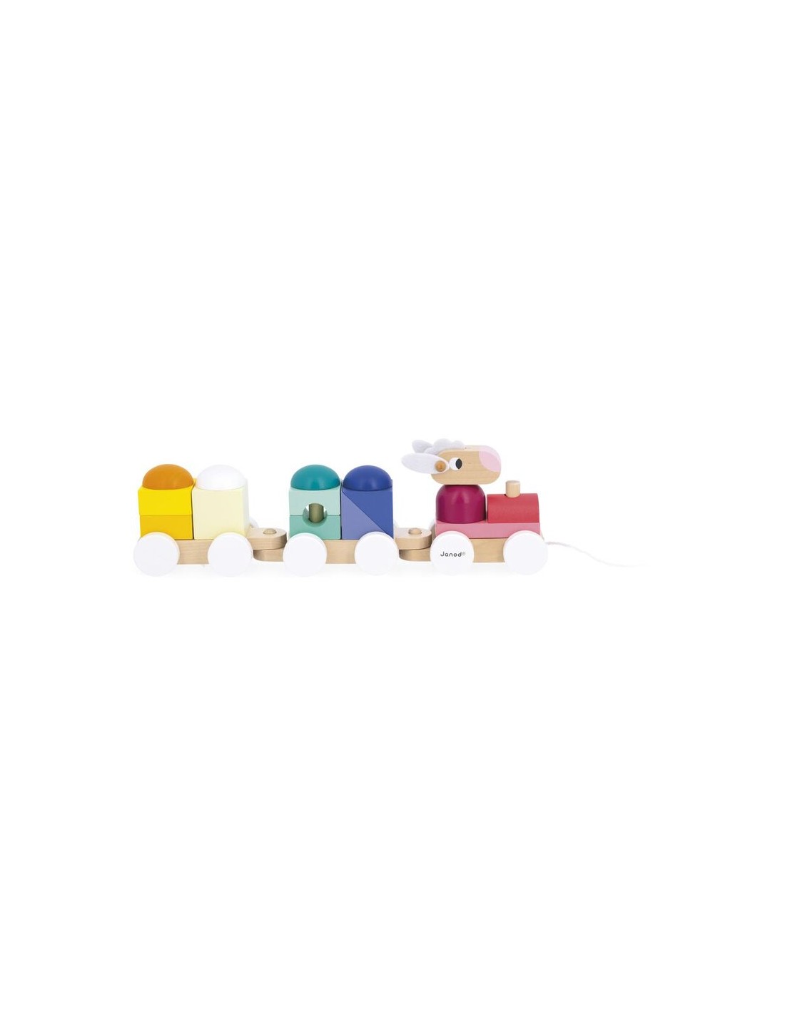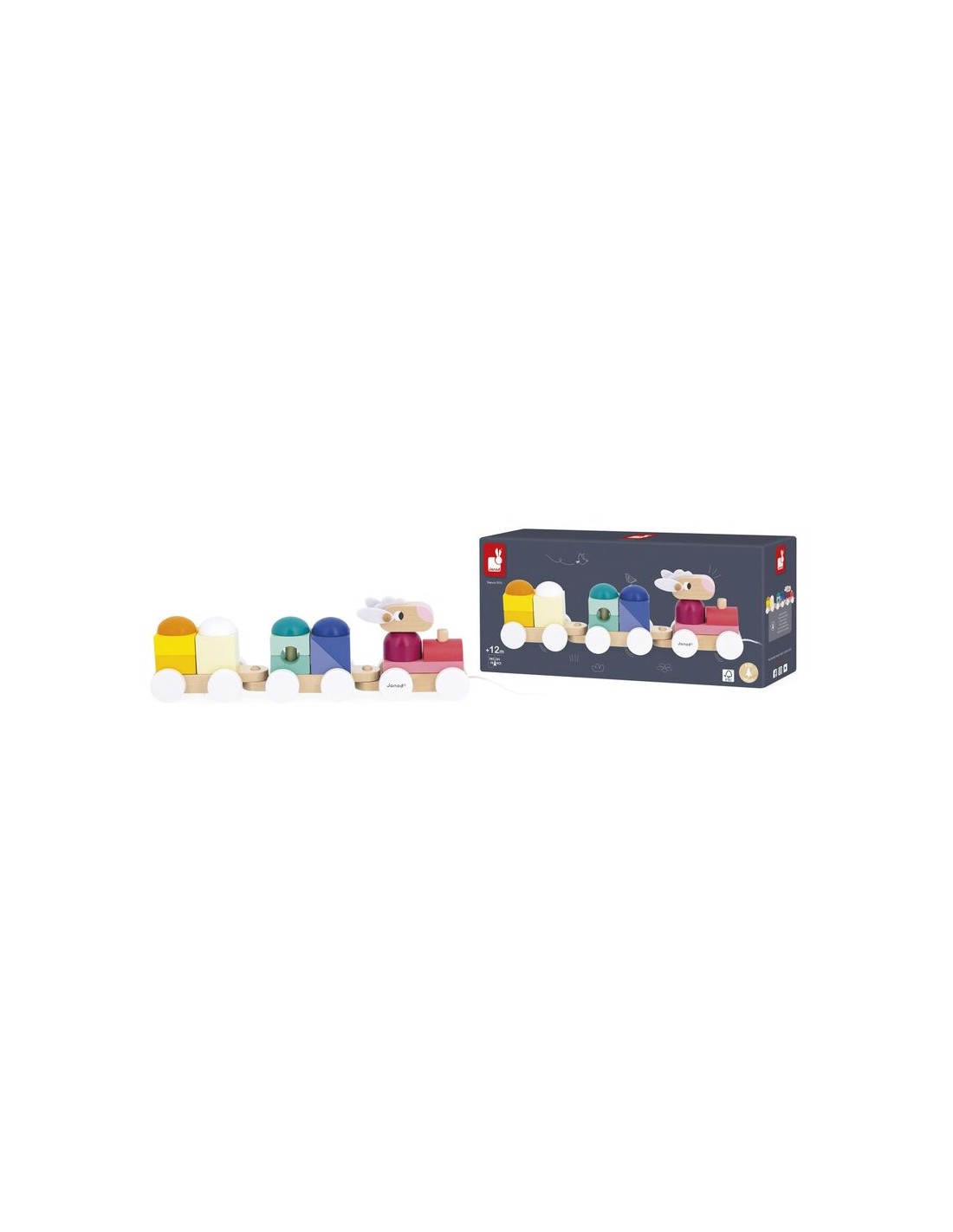 Este pequeño tren de madera pertenece a la gama Zigolos: una colección alegre y colorida con formas divertidas, diseñada para despertar los sentidos y acompañar a los niños en sus primeros descubrimientos. Este juguete de desarrollo está fabricado con madera con certificación FSC™ y pintura al agua. Longitud de la cuerda: 50 cm.