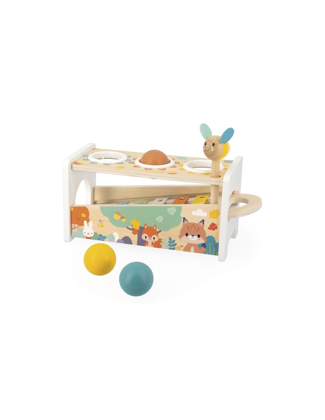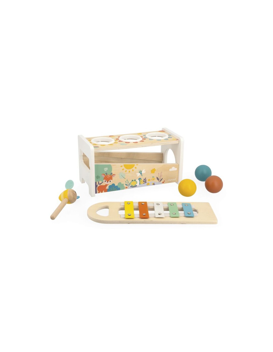 El Xilófono para golpear de la colección Pure es uno de los juguetes educativos más completos de Janod para bebés a partir de los 12 meses. Este juguete "2 en 1" combina la emoción de un banco de martilleo con la sensibilidad de un instrumento musical, todo envuelto en un diseño de inspiración natural con ilustraciones de simpáticos animales del bosque.