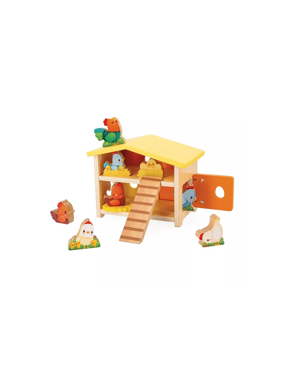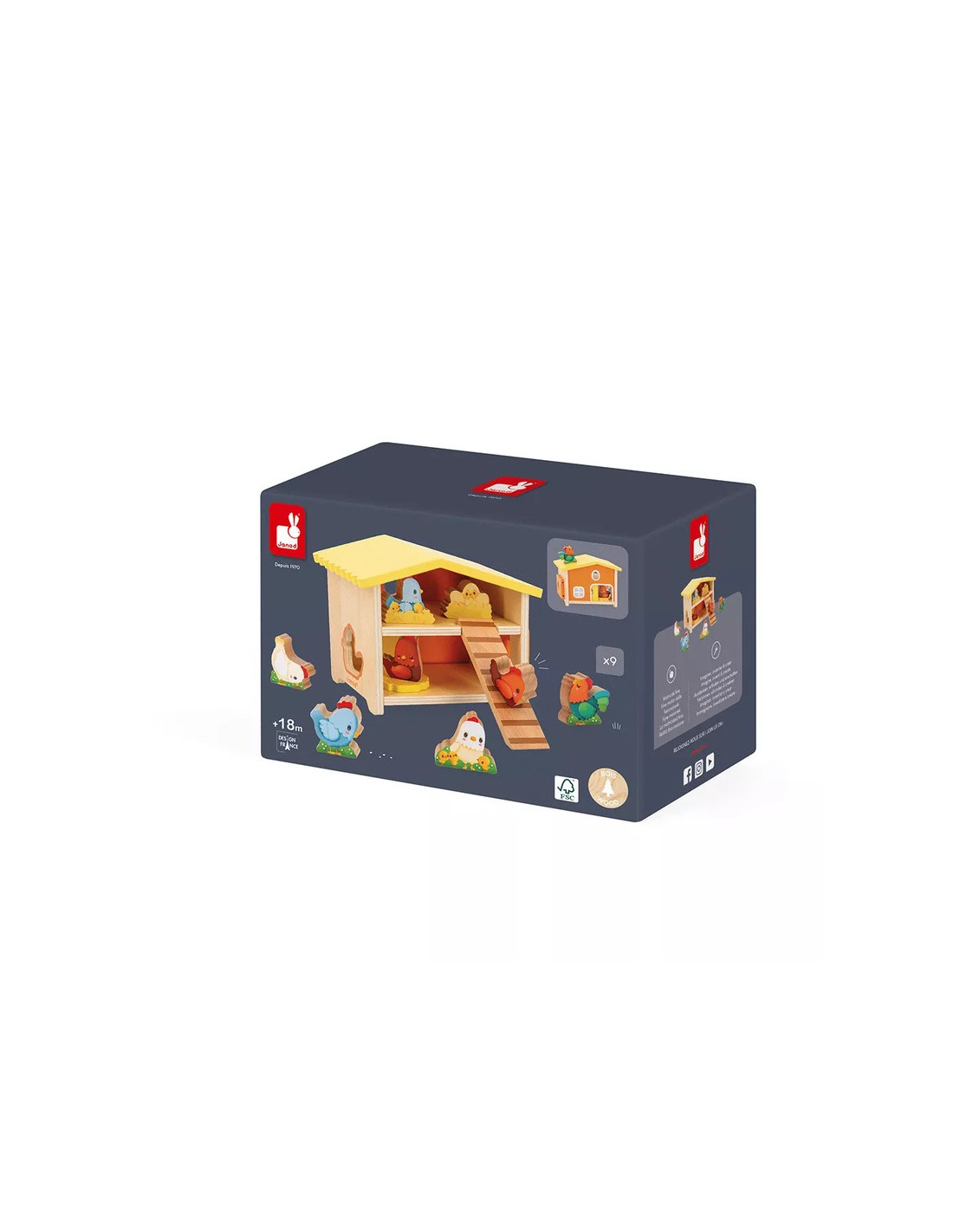 Mi Primer Gallinero de Janod es una precioso juego de madera. El gallinero está compuesto por 6 gallinas, 1 gallo, 1 nido con huevos para incubar y 1 nido con un pollito. El bebé podrá desarrollar su imaginación y psicomotricidad fina de forma segura pues las figuras son de gran tamaño, madera de calidad con certificado FSC™ y pinturas a base de agua.