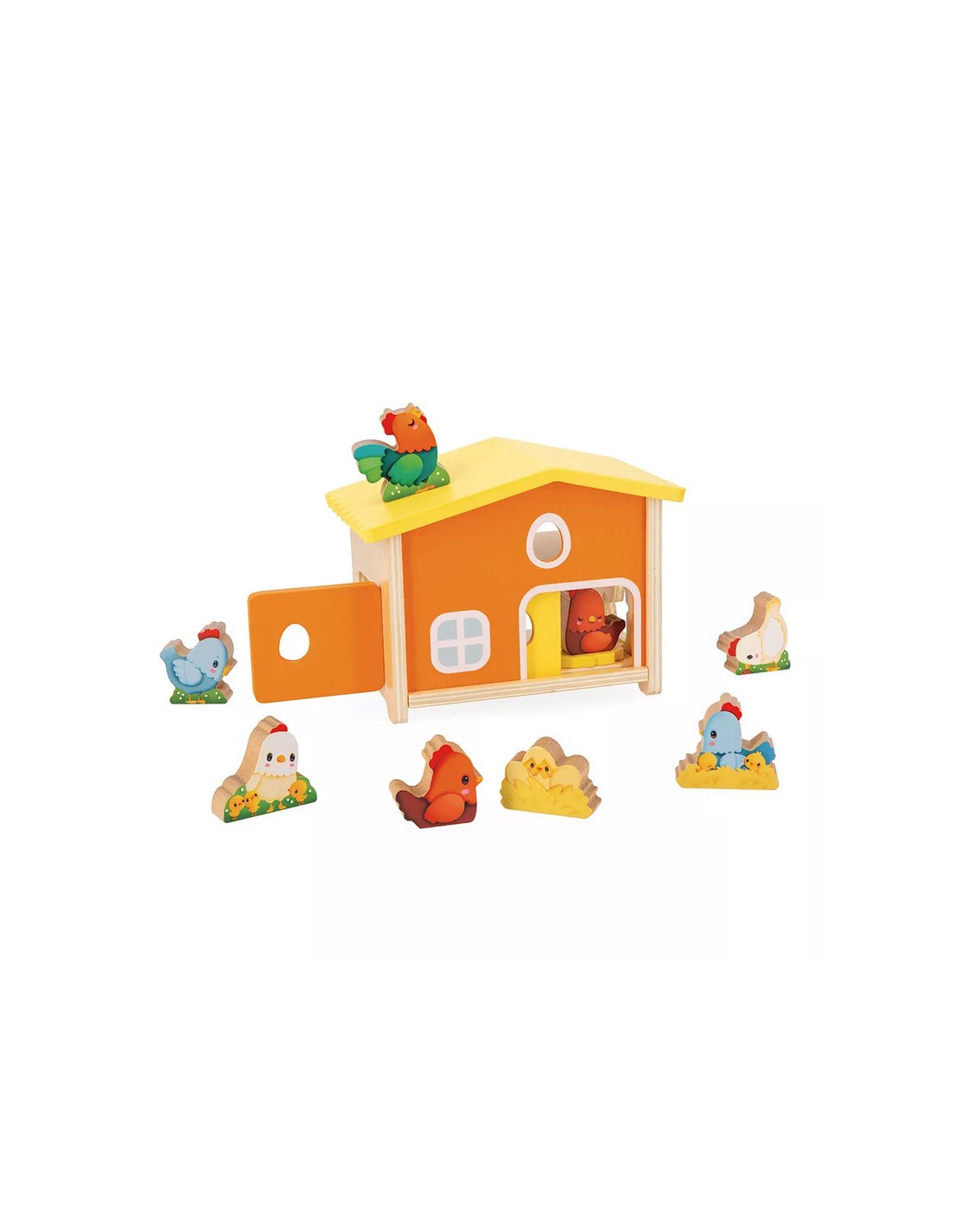 Algo nos dice que habrá mucho revuelo entre nuestras amigas las gallinas… El gallinero está compuesto por 6 gallinas, 1 gallo, 1 nido con huevos para incubar y 1 nido con un pollito. ¡Con este juguete de primera infancia, al bebé le esperan muchas aventuras en la granja! Anímale a encontrar a los pollitos, a colocar las figuras de madera en un lugar concreto del gallinero o incluso a describir lo que hace cada gallina para aprender aún más y pasar buenos ratos juntos.