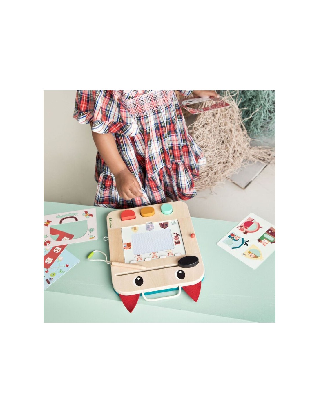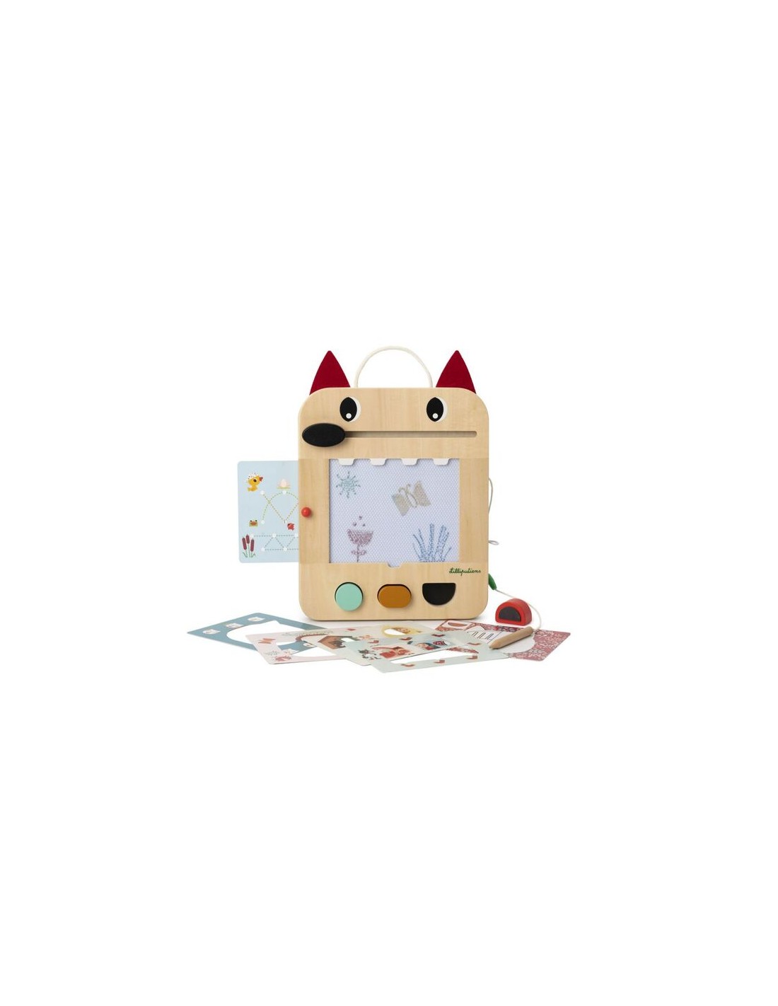 Diseño Exclusivo y Temático: La pizarra no es un objeto plano y aburrido. Con la forma de Louis el perro, el personaje de Lilliputiens, y su estampado de cuadros, atrae la atención de los pequeños desde el primer momento.