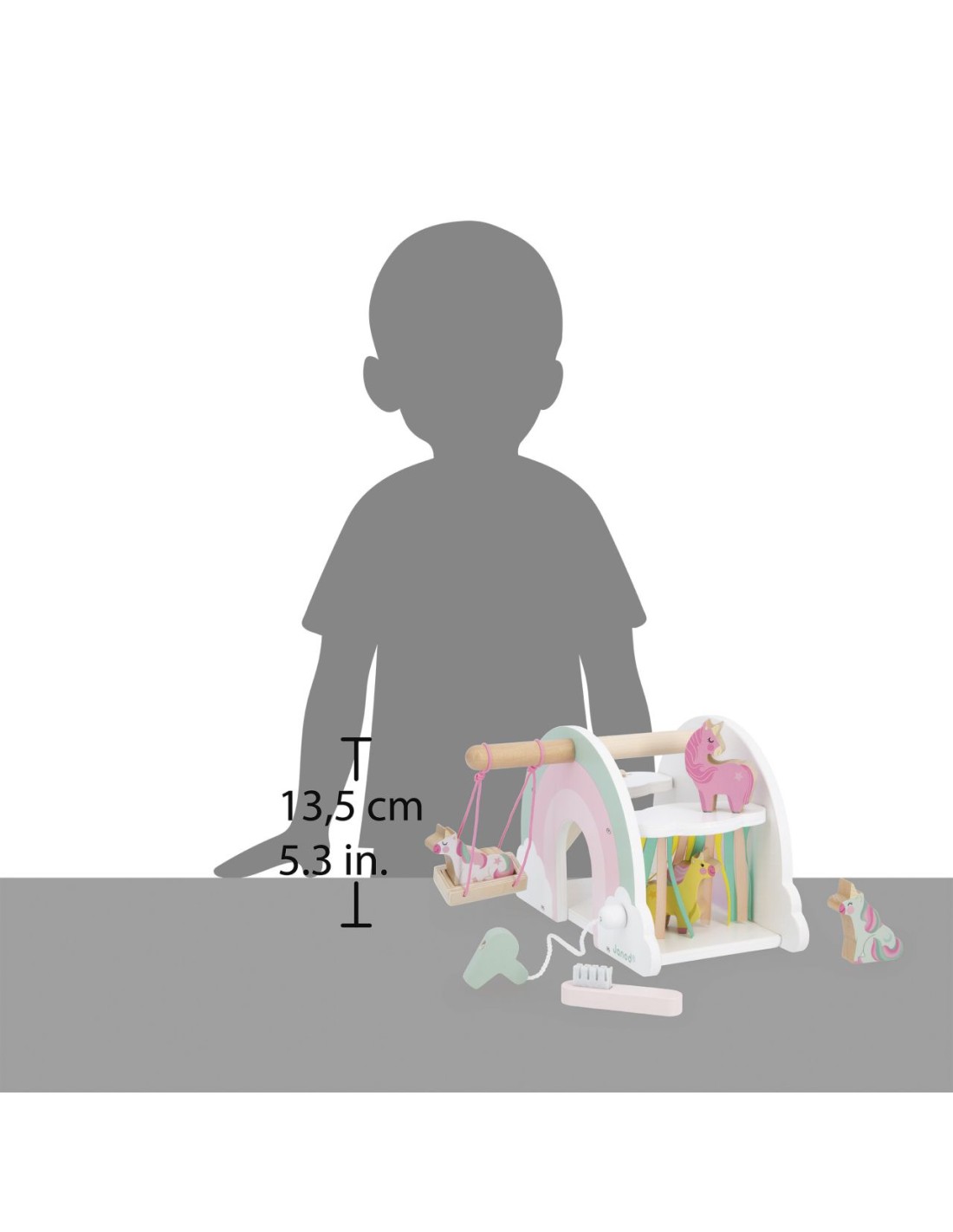 ¡Bienvenido a la casa del unicornio! En forma de arco iris, esta casa de madera es el escenario perfecto para fabulosas historias para niños a partir de 18 meses. Con 4 figuras de unicornio y 2 accesorios de madera, esta casa mágica estimula la imaginación de los más pequeños. ¡No espere más para descubrir todas las sorpresas de las que podrán disfrutar!