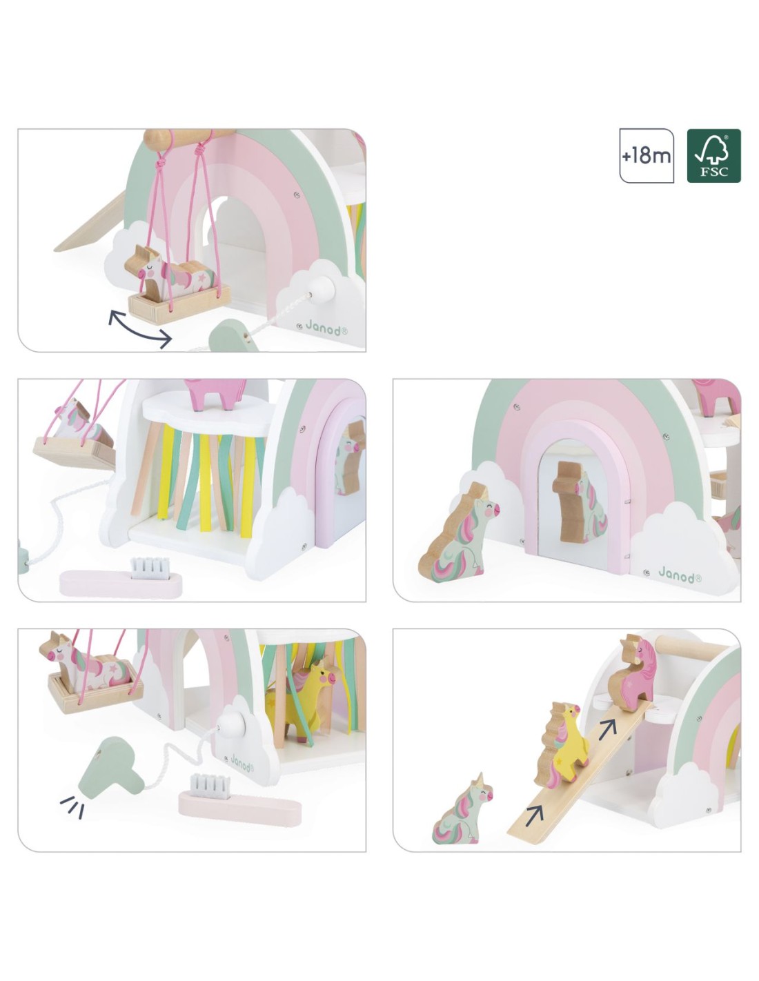 La Casa de los Unicornios de Janod es una encantadora casa de muñecas de madera en forma de arcoíris, diseñada para niños a partir de 3 años. Este juguete educativo y creativo invita a los más pequeños a vivir aventuras mágicas junto a sus 4 figuras de unicornios y 2 accesorios incluidos además de otras muchas sorpresas.