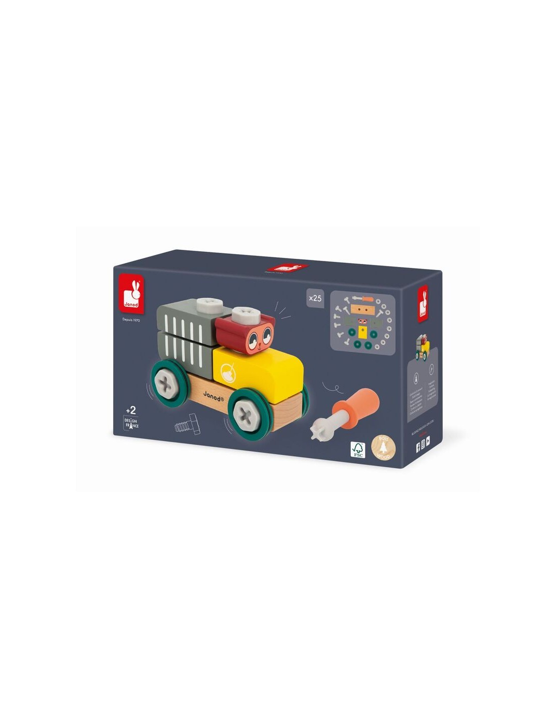Este vehículo de bricolaje oso está hecho de madera con certificado FSC™ y forma parte de nuestra colección de juguetes de imitación de bricolaje: Brico'Kids.