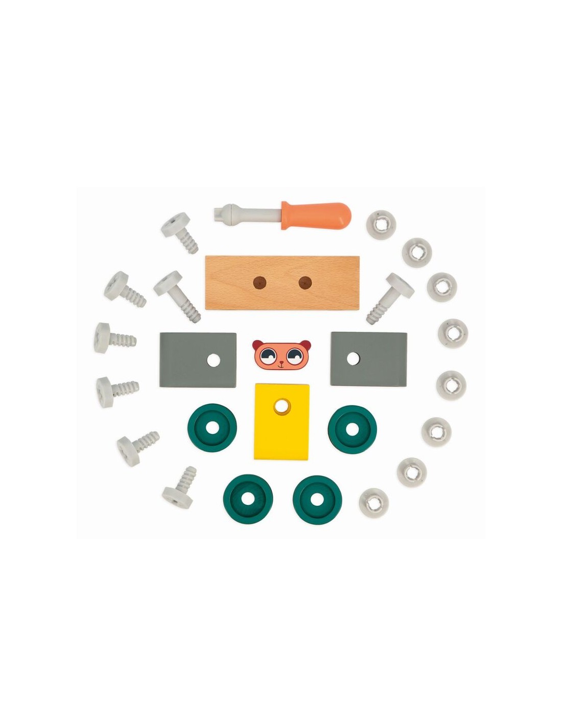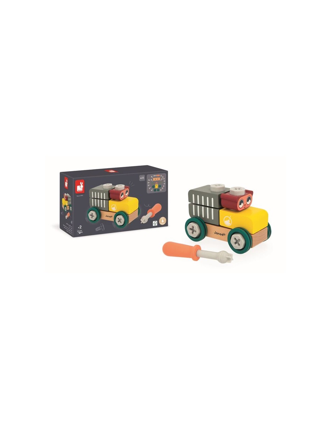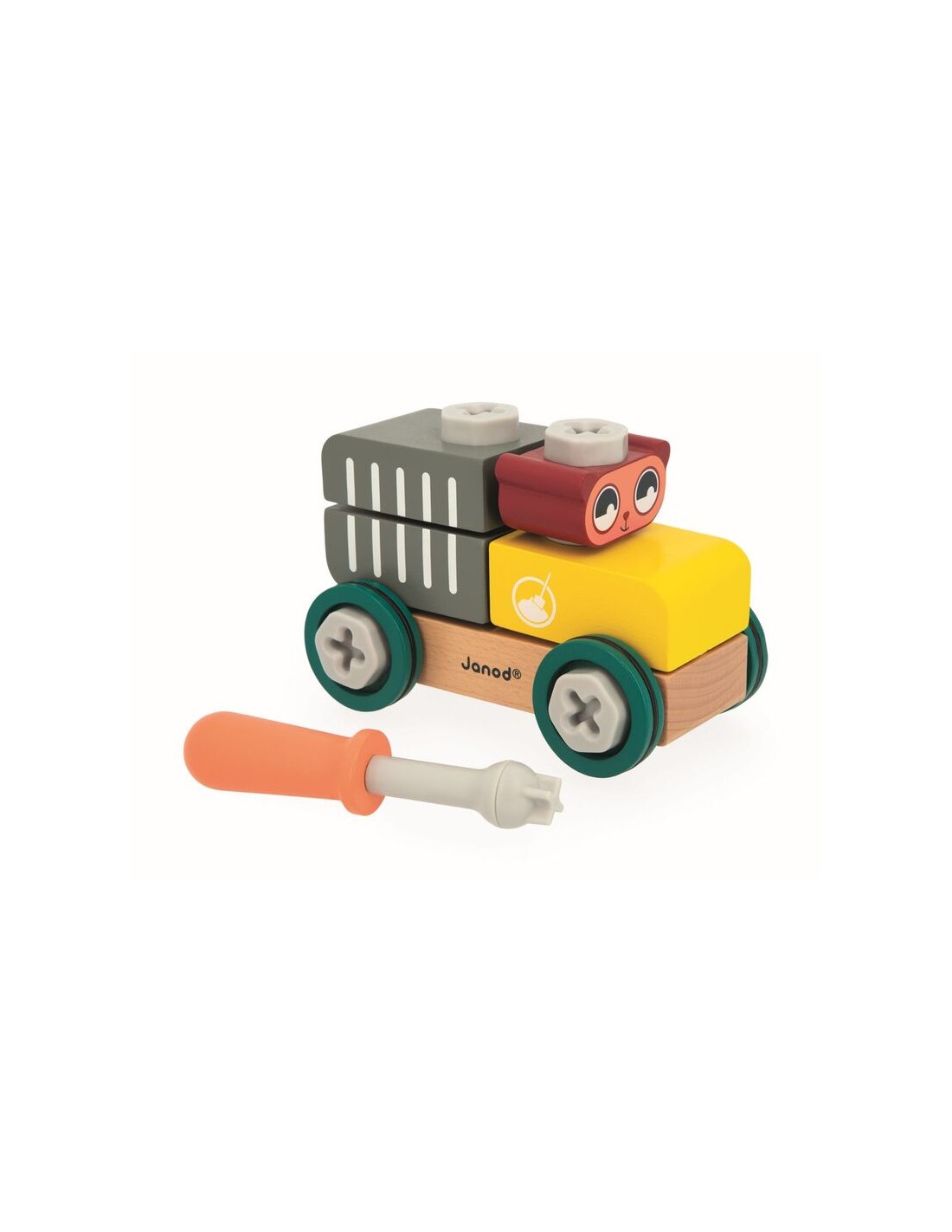 El osito está listo para hacer bricolaje! ¡Este coche de madera para construir invita a los niños a partir de 2 años a desarrollar la imaginación y la motricidad fina ensamblando las piezas para luego echar a rodar! Este juego de construcción consta de 9 piezas de madera y 14 elementos de tornillería de plástico (tornillos, tuercas e inserciones). También incluye un destornillador, así como una tarjeta de ejemplo para ayudar a los aprendices de manitas a montar el vehículo. Los tornillos tienen muescas para que se parezcan todavía más a los de verdad y permitir que los pequeños los manejen con facilidad.