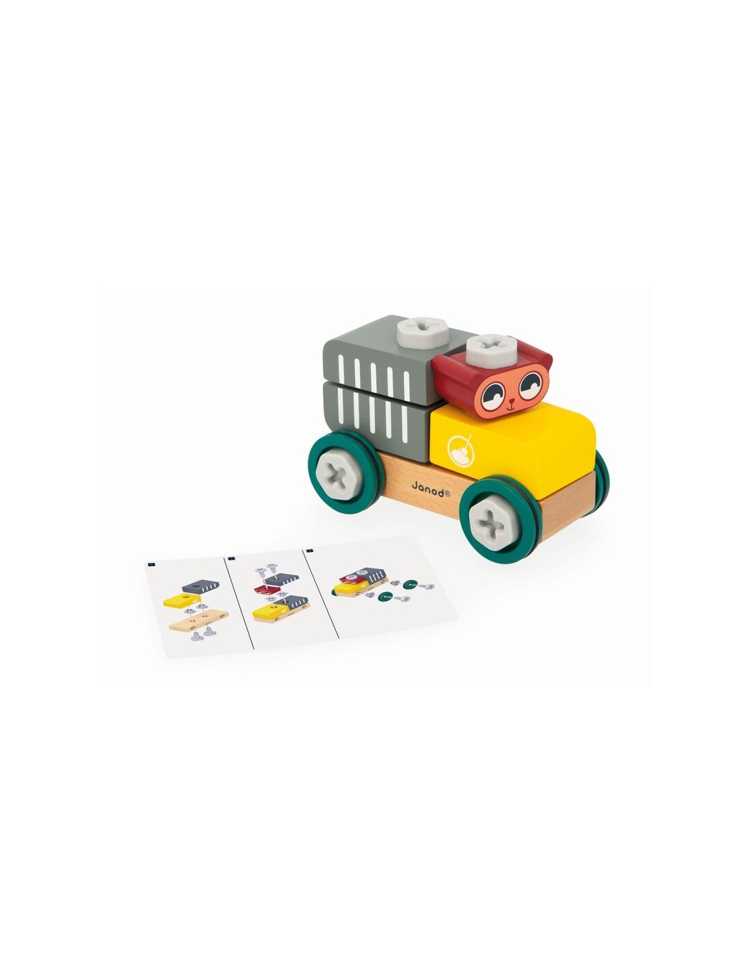¡Qué alegría poder hacer bricolaje como los mayores! ¡Un juego de bricolaje es ideal para ayudarles a desarrollar la motricidad fina, la destreza y la precisión! Y, una vez construido el automóvil, ¡está listo para rodar! ¿Visitará la obra nuestro amigo el oso, en su coche de juguete amarillo y gris, o echará carreras con sus amiguitos? El niño se inventará toda clase de aventuras con este cochecito de construcción.