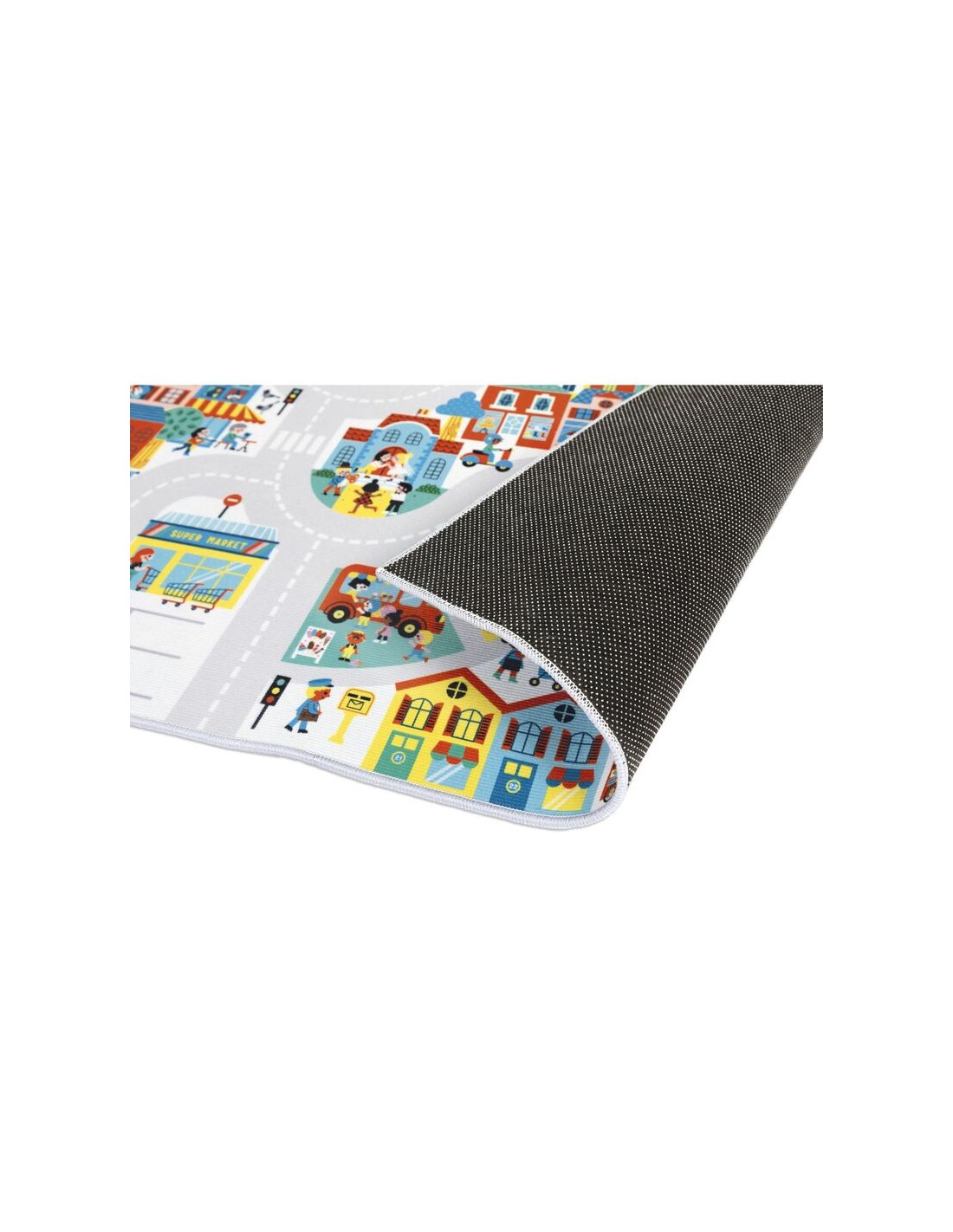 ¡Hay tantos edificios, profesiones y vehículos representados! Una rápida parada en el supermercado para aprovisionarnos, y luego al parque a tomar un tentempié, antes de ir al cine para disfrutar de una divertida proyección en familia. Con su alfombra de tela, los niños desarrollan su imaginación y su vocabulario, así como su sentido de la observación. Los más pequeños pueden incluso descubrir las emociones y los colores. Otra ventaja de esta alfombra de juego infantil es que ¡es antideslizante! Perfecta para hacer rodar los coches de juguete, o simplemente para los pequeños que se ponen inquietos.