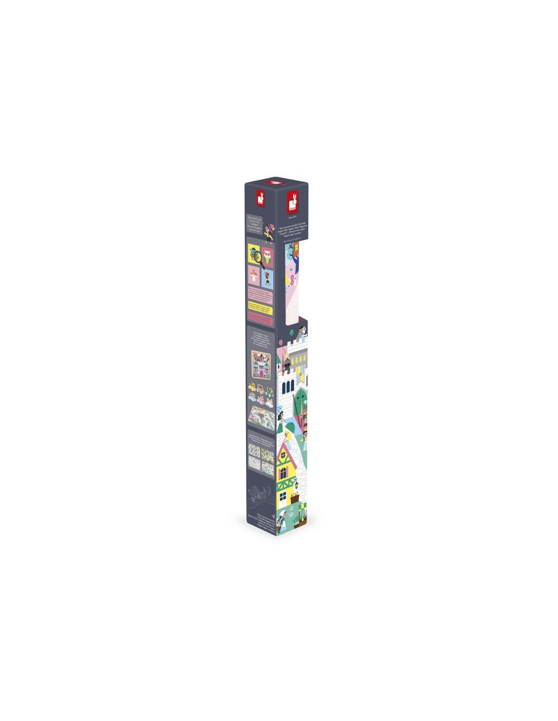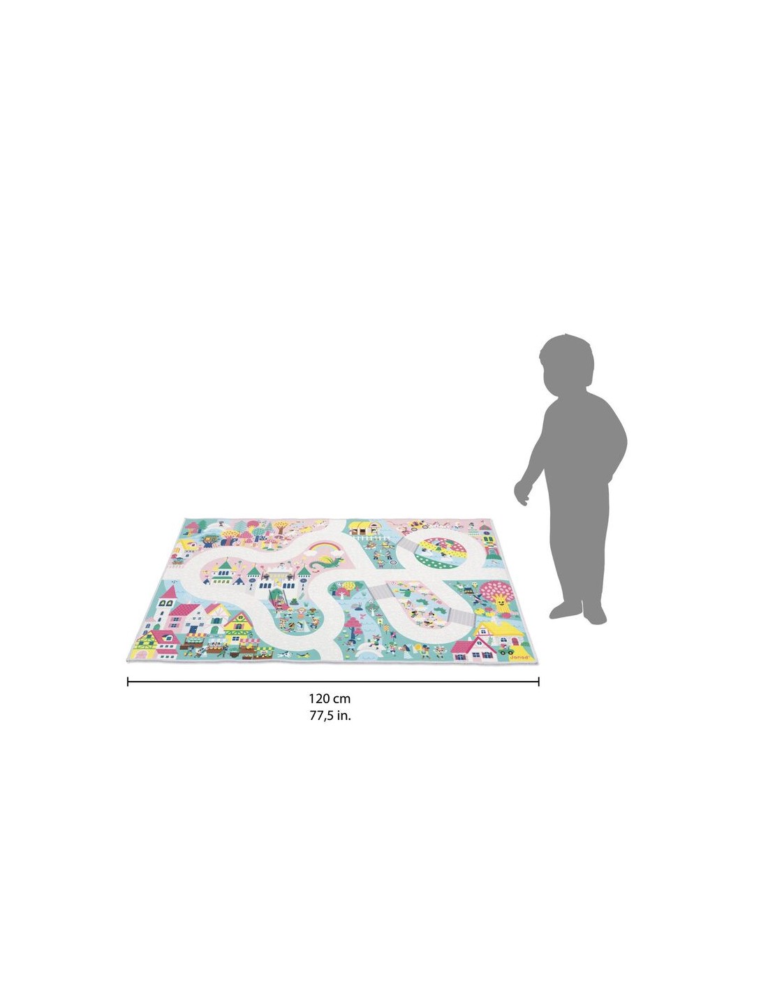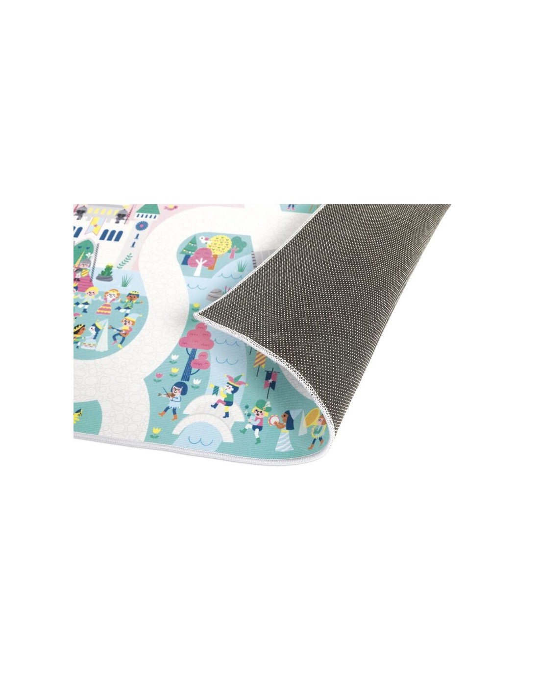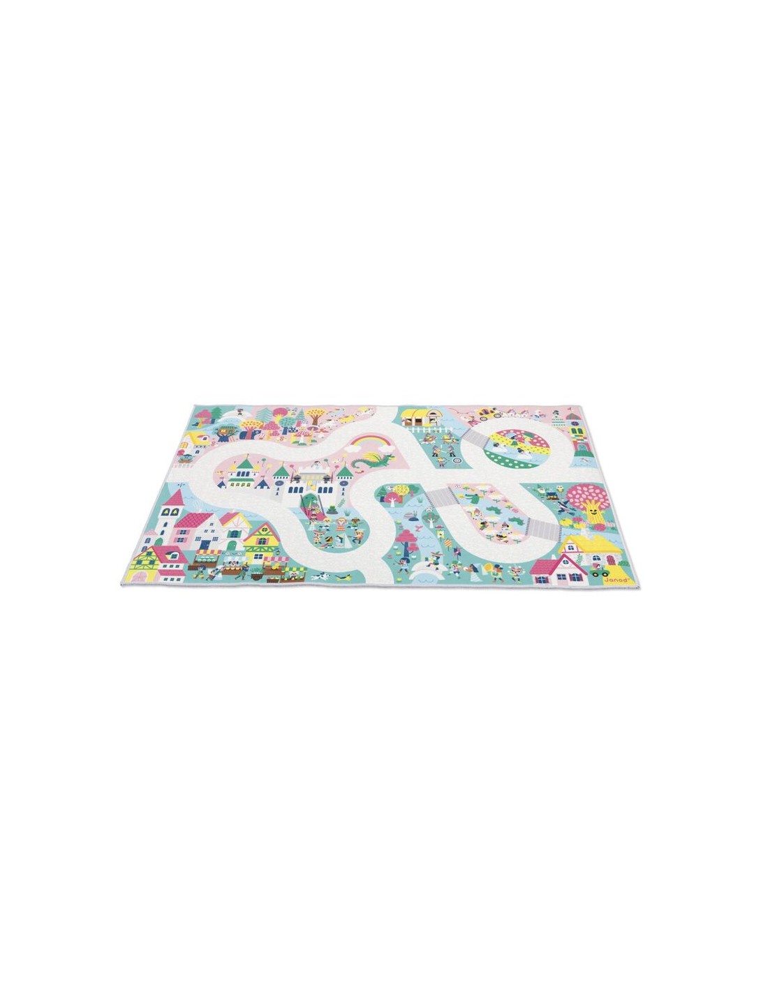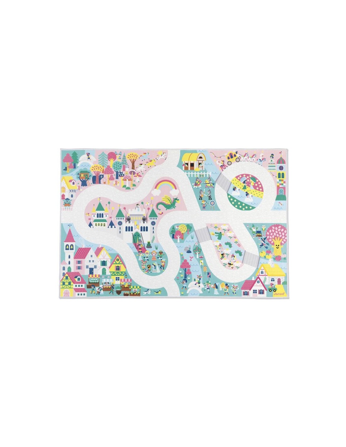 ¡Descubre el reino encantado! La magia de los cuentos de hadas cobra vida en este fantástico y tierno escenario. Esta alfombra de juego de princesas, príncipes, dragones y caballeros es adecuada para niños a partir de 2 años. Tiene un camino largo y ancho, ¡para descubrir todos los rincones del reino e imaginar un sinfín de historias! En su alfombra de juegos con circuito, los más pequeños se divertirán cruzando puentes y caminos en busca de objetos escondidos, a modo de juego de buscar y encontrar. Podrán descubrir dónde está la trompeta del rey, los unicornios galopando por la llanura rosa, y estar atentos al extraño mago que prepara una poción en el bosque... ¡Hay tantos edificios, instrumentos musicales y personajes de cuento representados! Hacemos una visita de cortesía al trol que vive cerca de la casa del árbol, y luego nos dirigimos a ver el torneo de justas, antes de ir al mercado a aprovisionarnos de ingredientes mágicos.