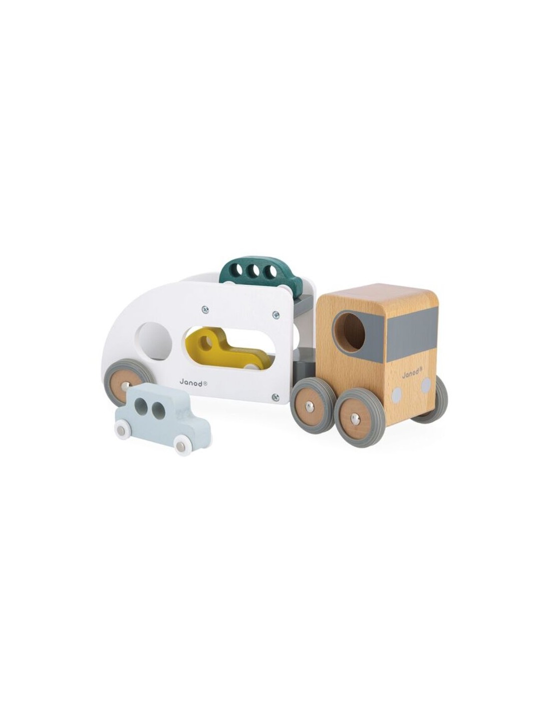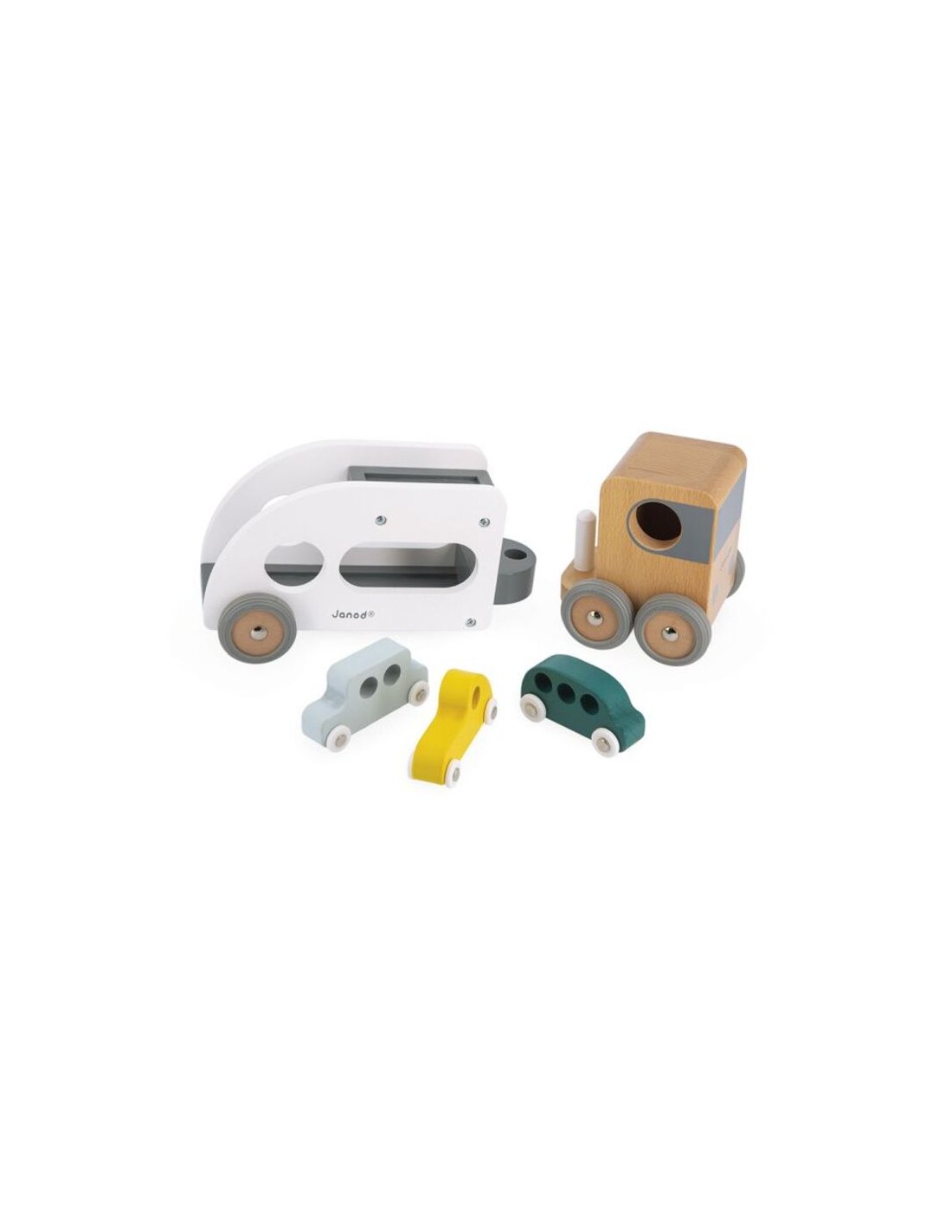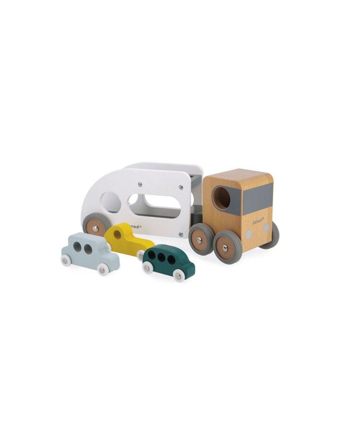 ¡Pi, pi! Los coches deben abordar, ¡el camión está esperando! ¡Este camión de transporte y sus tres pequeños autos azul, verde y amarillo harán las delicias de todos los fanáticos de los vehículos! El camión de transporte de automóviles está equipado con un remolque blanco extraíble, así como ruedas de goma silenciosas. ¡Pasará por cualquier sitio gracias a su extraordinario ángulo de giro! Apto para niños pequeños de a partir de 2 años, este conjunto de camiones y automóviles les permitirá desarrollar su imaginación y motricidad fina. Este juguete está hecho de madera maciza con certificado FSC® y pintado al agua.