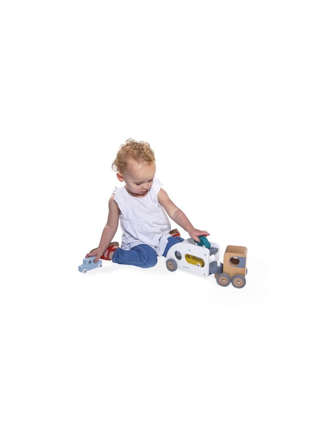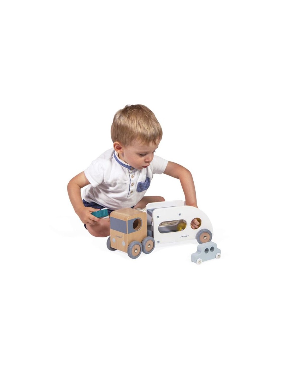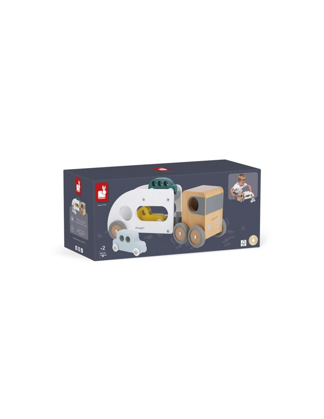 ¡Pi, pi! Los coches deben abordar, ¡el camión está esperando! ¡Este camión de transporte y sus tres pequeños autos azul, verde y amarillo harán las delicias de todos los fanáticos de los vehículos! El camión de transporte de automóviles está equipado con un remolque blanco extraíble, así como ruedas de goma silenciosas. ¡Pasará por cualquier sitio gracias a su extraordinario ángulo de giro! Apto para niños pequeños de a partir de 2 años, este conjunto de camiones y automóviles les permitirá desarrollar su imaginación y motricidad fina. Este juguete está hecho de madera maciza con certificado FSC® y pintado al agua.