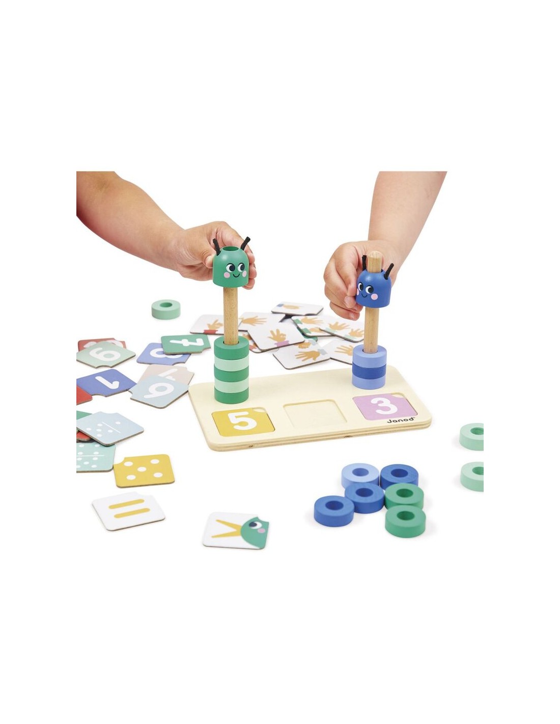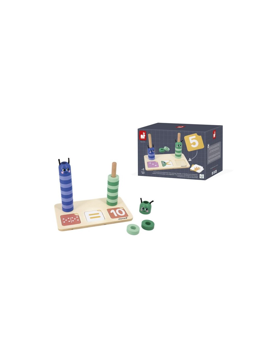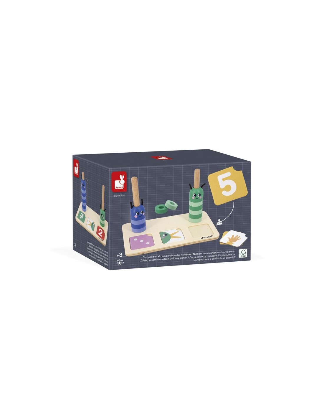 Composición y comparación de números es un juego de madera de la línea pedagógica de Janod. Mediante este juego, padres y docentes podrán ayudar, de forma divertida, a los niños a aprender los números y sus órdenes de magnitud y la composición y la descomposición de un número. También podrá aprender los conceptos "mayor que" y "menor que".