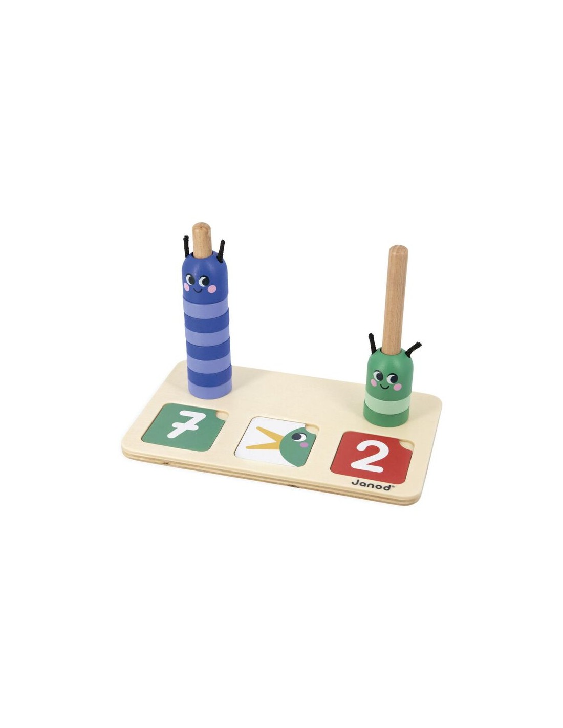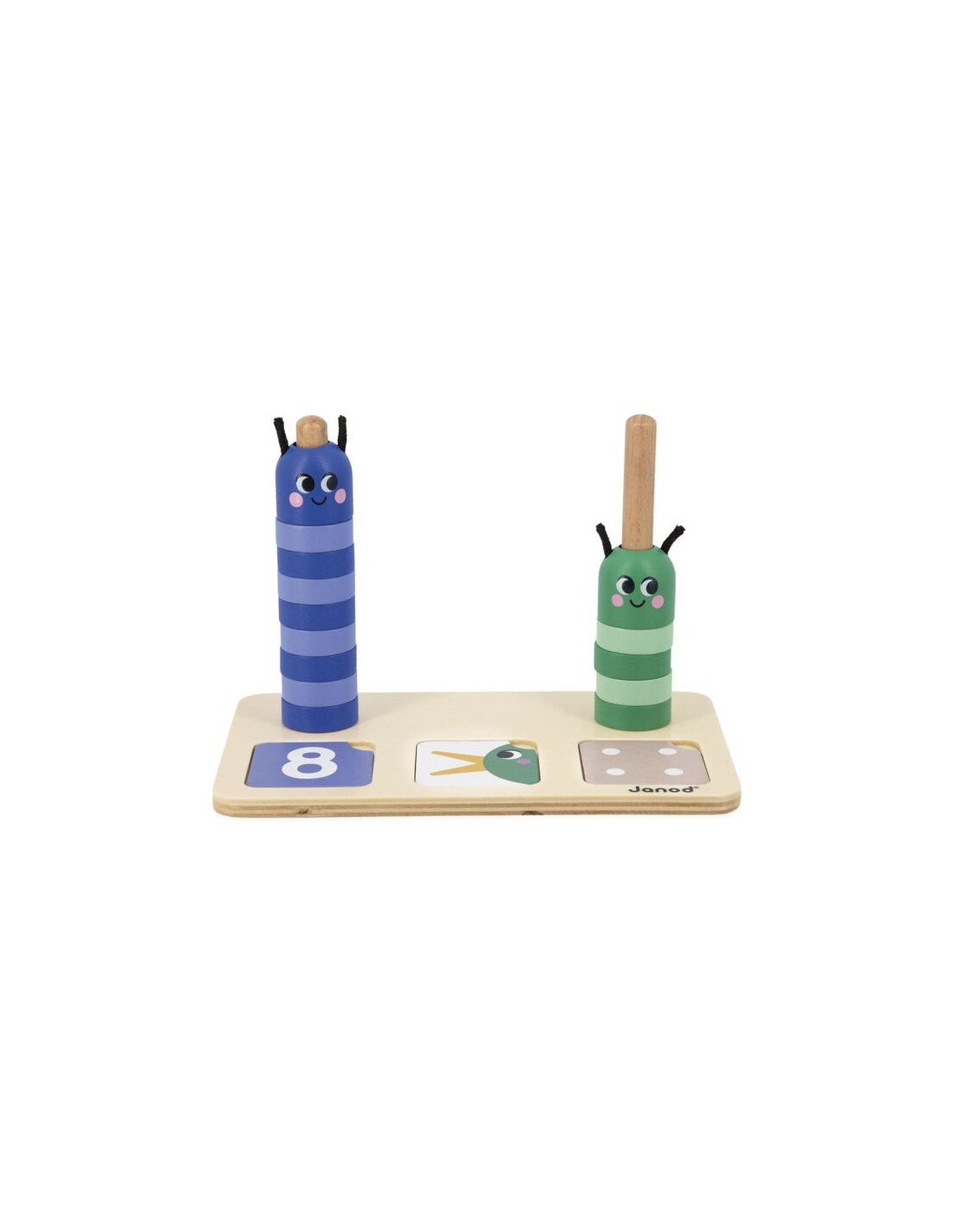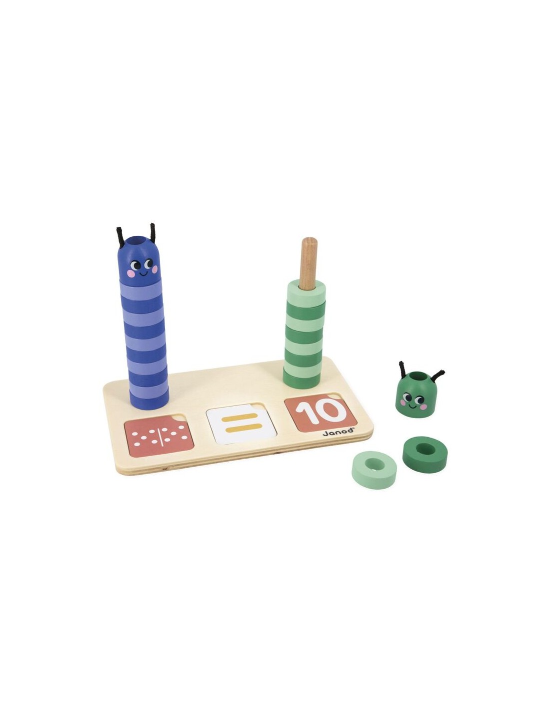 Este bonito juego de madera permite aprender a reconocer las caras de un dado, expresar una cantidad con los dedos e identificar la correspondencia con un número. Al unir las piezas de colores sobre el tablero, su hijo comprenderá cuántas cuentas debe añadir o quitar al cuerpo de la oruga para obtener una cantidad.