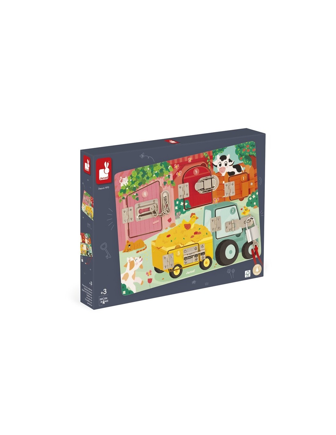 Toc, toc, toc! ¿Quién se esconde detrás de la puerta del granero? Este bonito tablero con cerraduras ilustra la vida cotidiana de los animales de granja y sus crías.