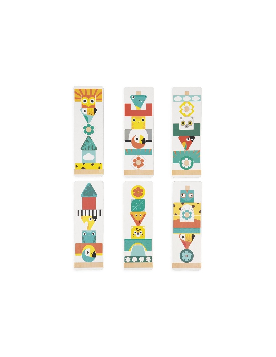 Con 52 piezas de madera y 6 tarjetas impresas por ambos lados, el niño podrá reproducir los 12 modelos propuestos o dar rienda suelta a su imaginación creando sus propios y originales tótems.