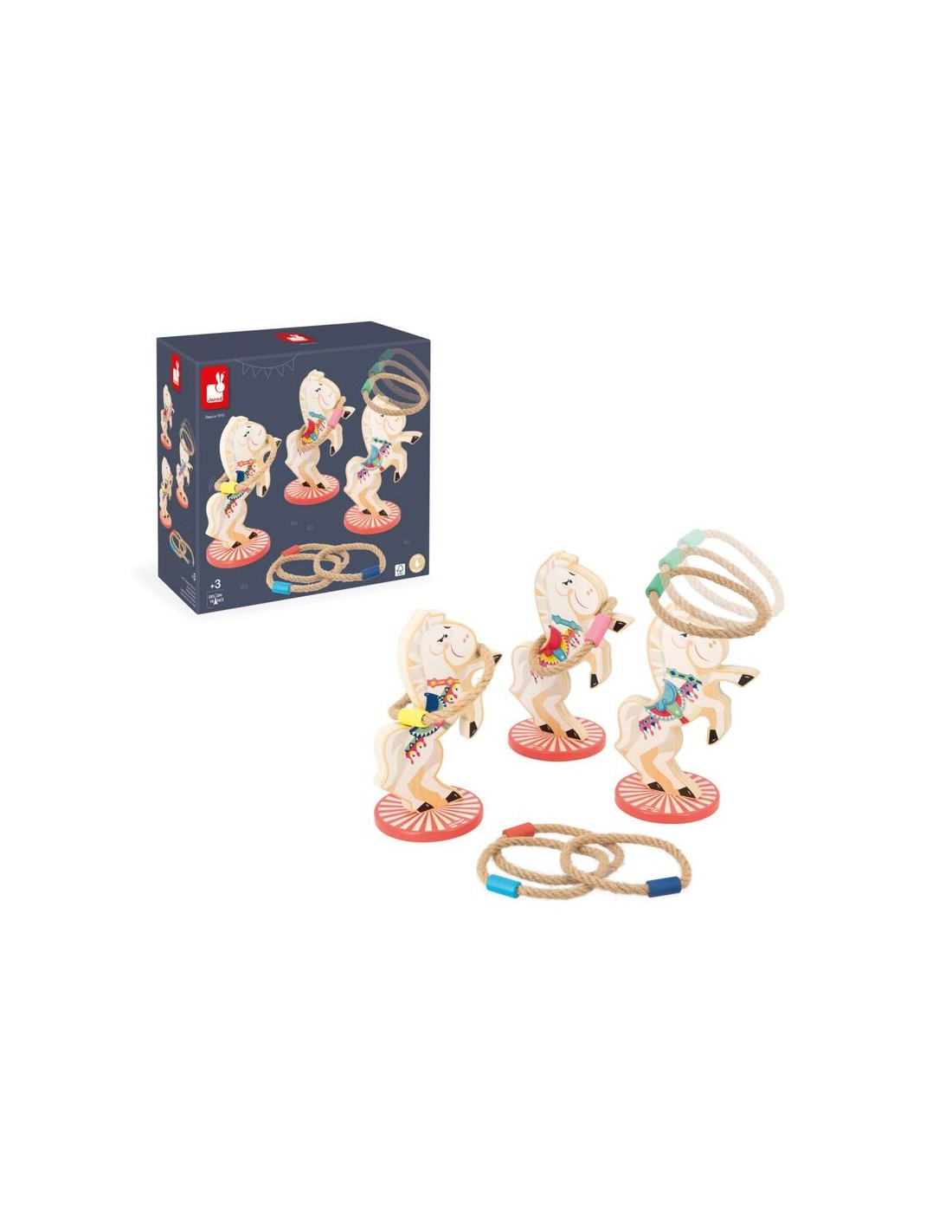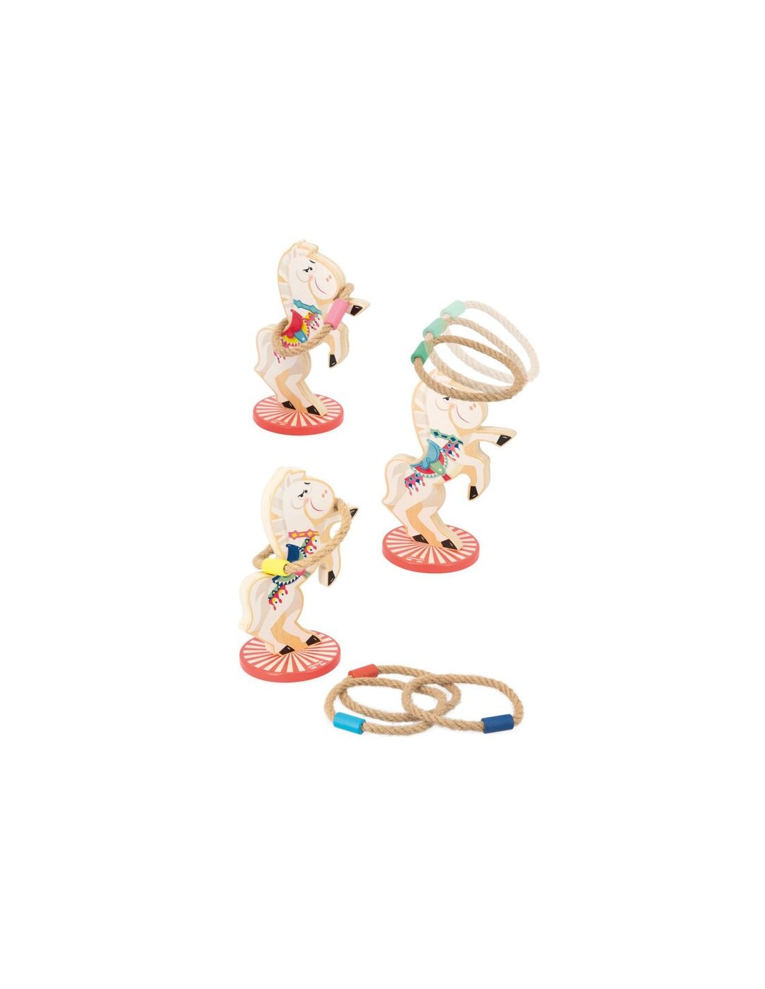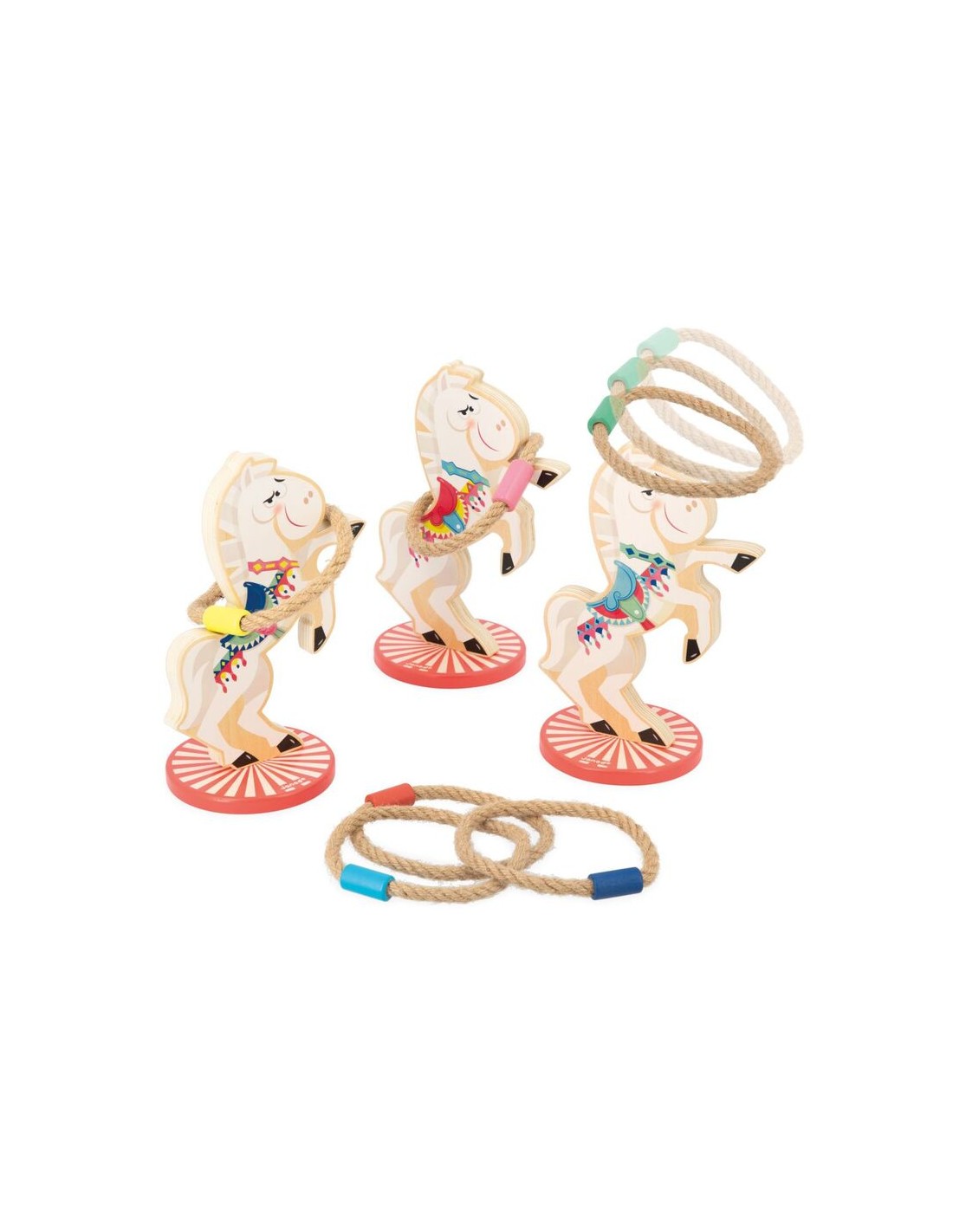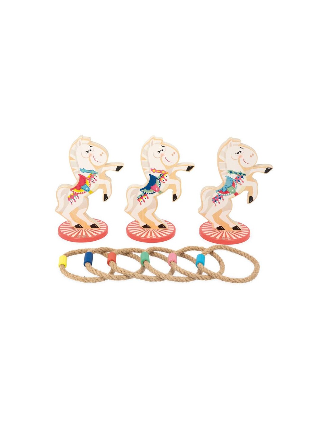 Atrapa a los caballos si puedes! Este juego de lanzar anillas es apto para niños a partir de 3 años. ¿En qué consiste? En medio de la hierba verde, 3 caballos de madera, coloridos y alegres, esperan a que los atrapen. ¡Se han escapado del tiovivo de la feria! ¡Para atraparlos, hay que lanzar los aros y apuntar bien! En total, hay 6 anillas. Los niños se ponen a cierta distancia de los caballos y se turnan para lanzar sus aros: ¡el primero que atrape a un caballo gana!