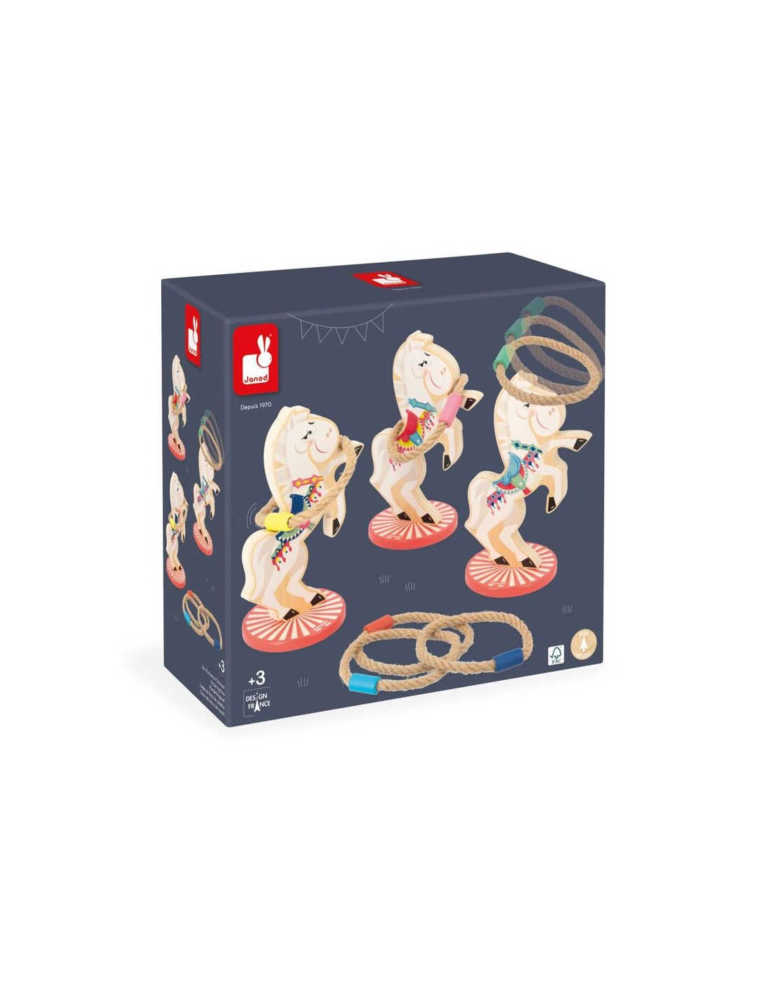 Este juego de lanzar anillas de madera forma parte de nuestra gama APPLEPOP, una colección de juegos divertidos y originales inspirados en el mundo de la feria. ¿Todo listo entonces para elegir montura? ¡Coge tus aros y atrapa a los caballos! Este juego de anillas está hecho de madera con certificado FSC™.