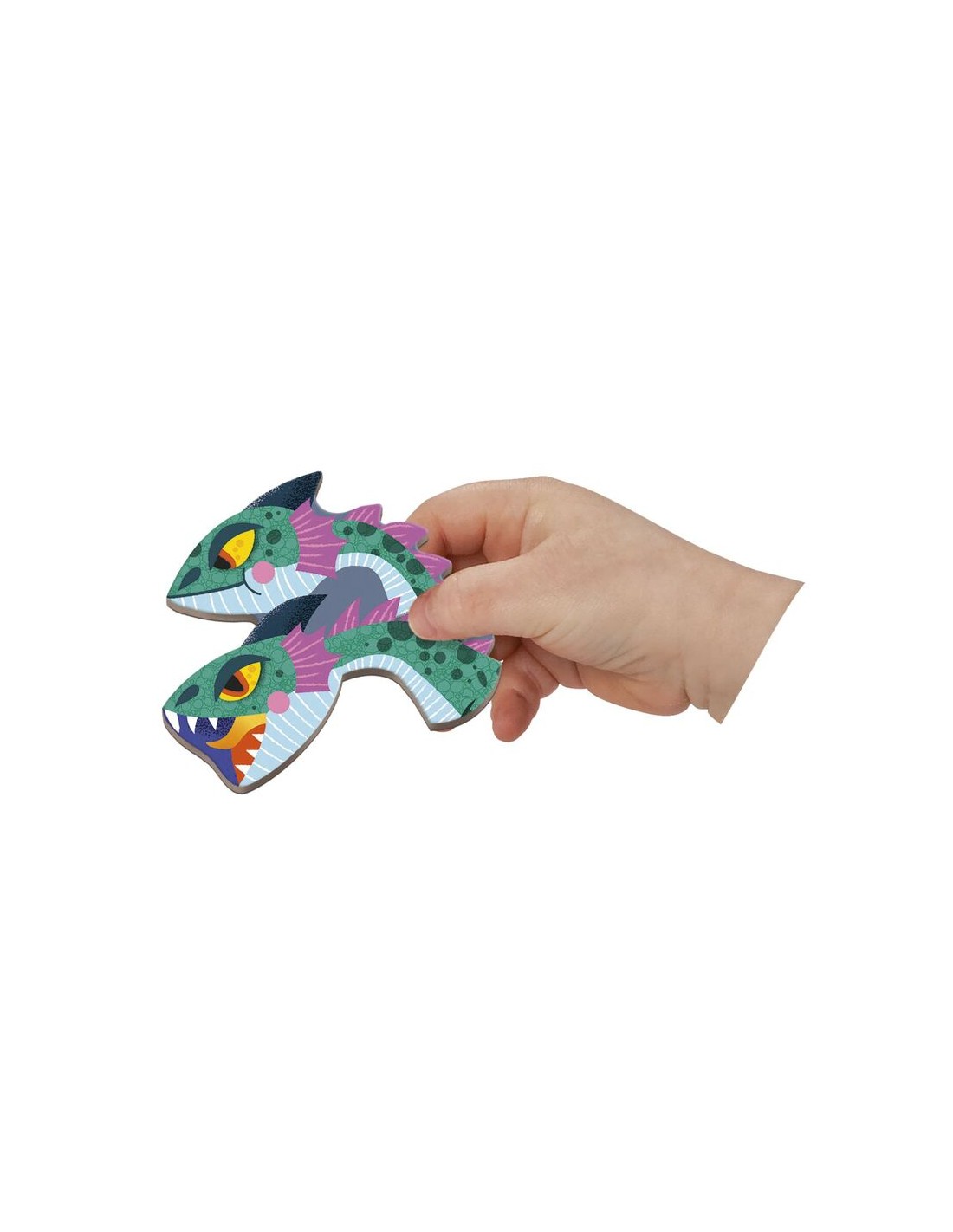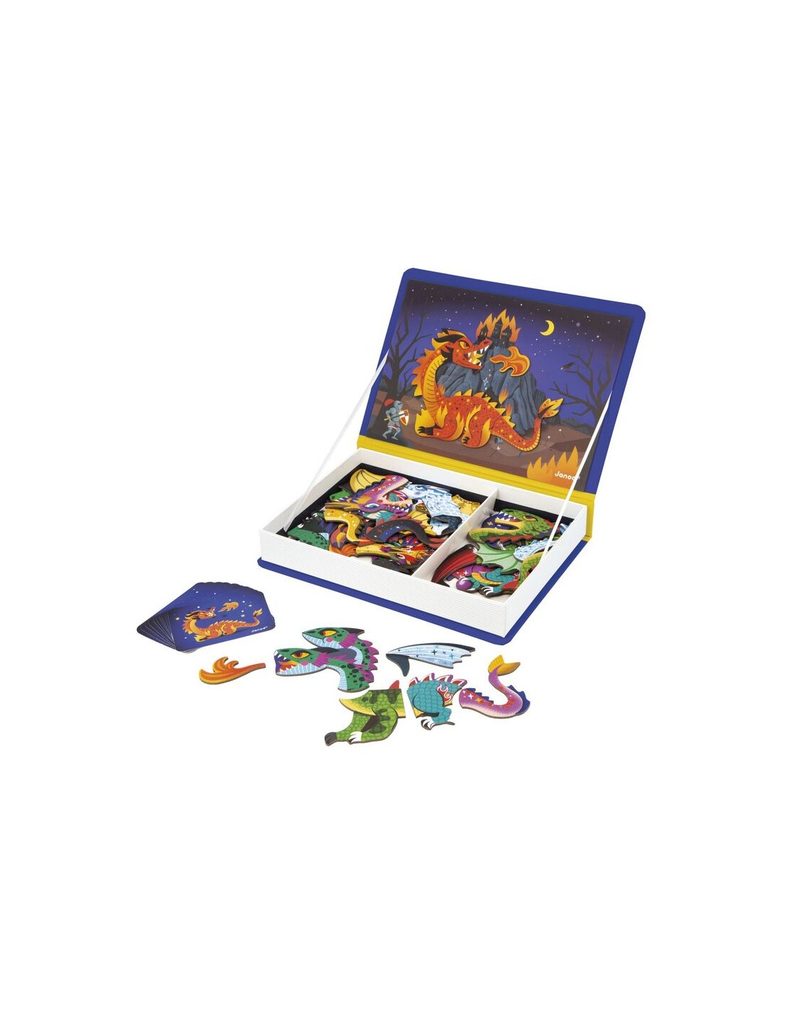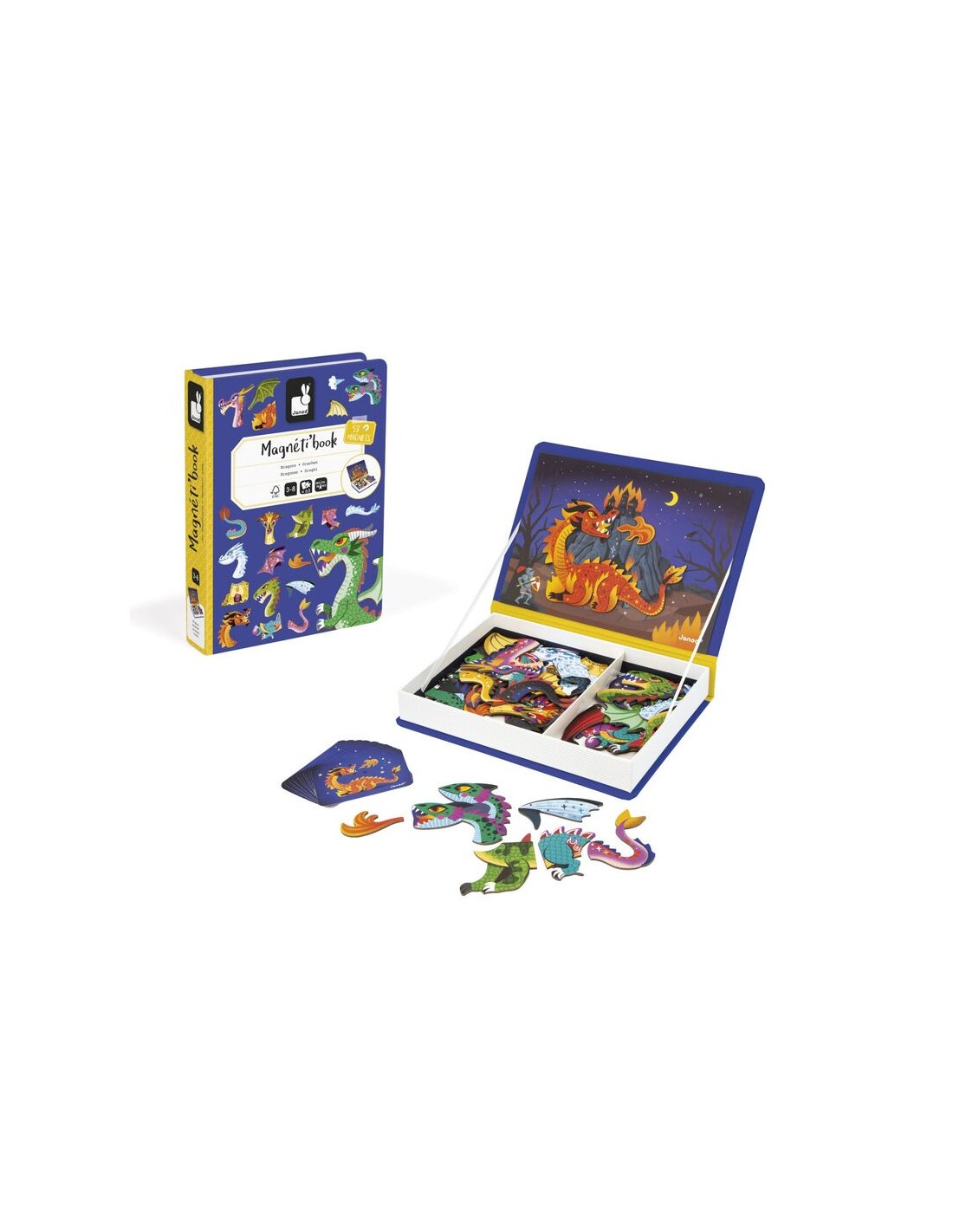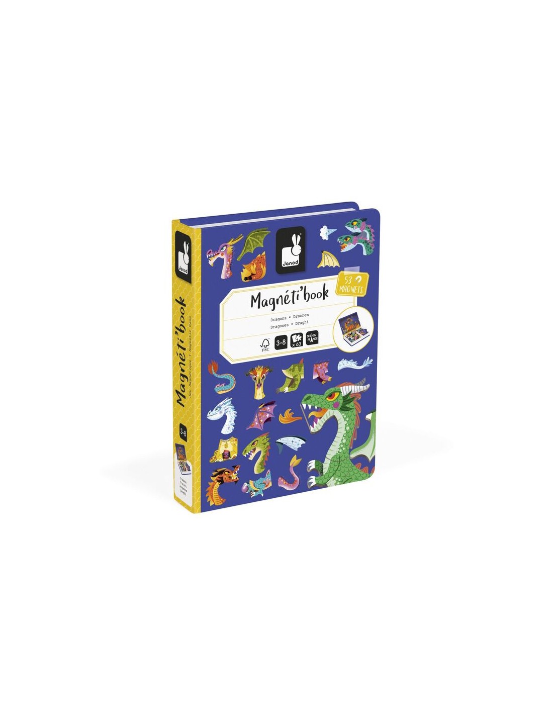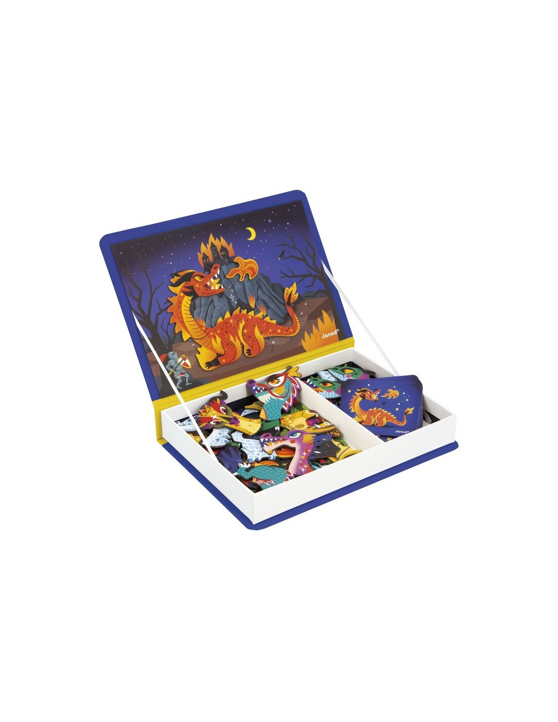 Magneti´Book Dragones de Janod es un juego educativo magnético hecho de cartón sobre el tema de los dinosaurios, compuesto por 53 imanes y 10 cartas para reproducir terroríficos dragones. Una vez abierto el libro, el objetivo del juego es usar los imanes para recomponer en la escena magnética el dragón indicado en la carta. Los peques también se podrá divertir mezclando las diferentes piezas para crear criaturas aún más aterradoras, ya que son intercambiables.