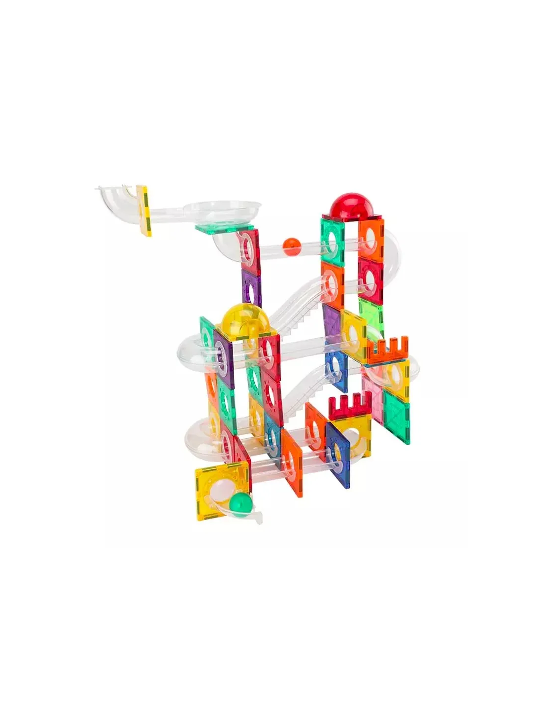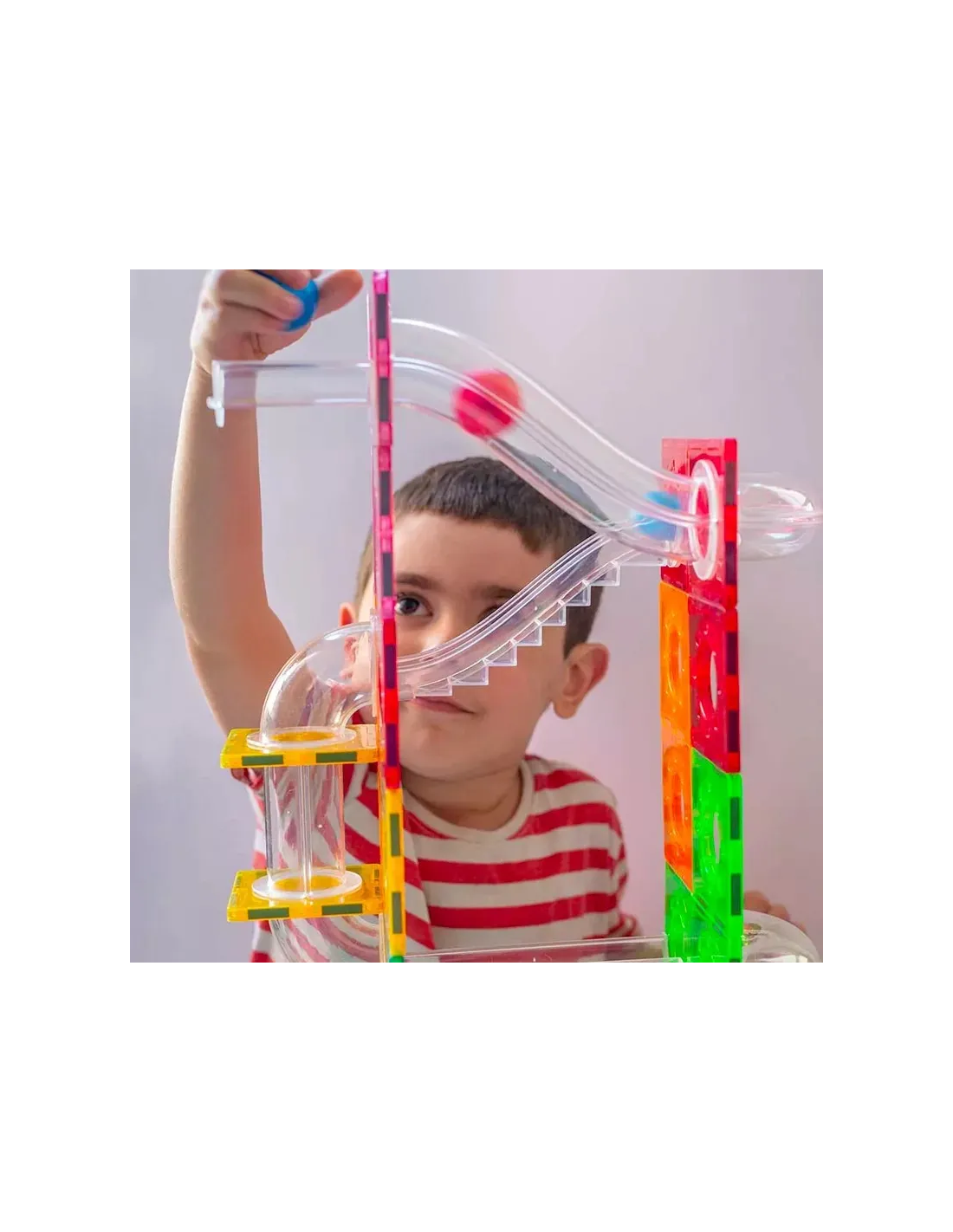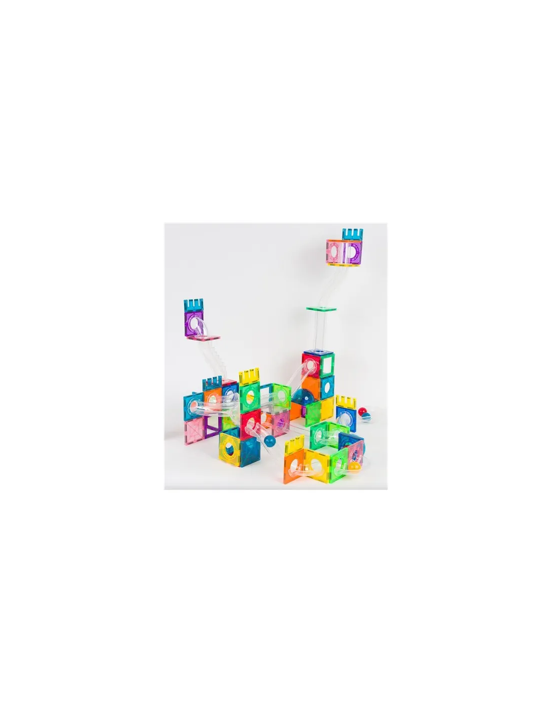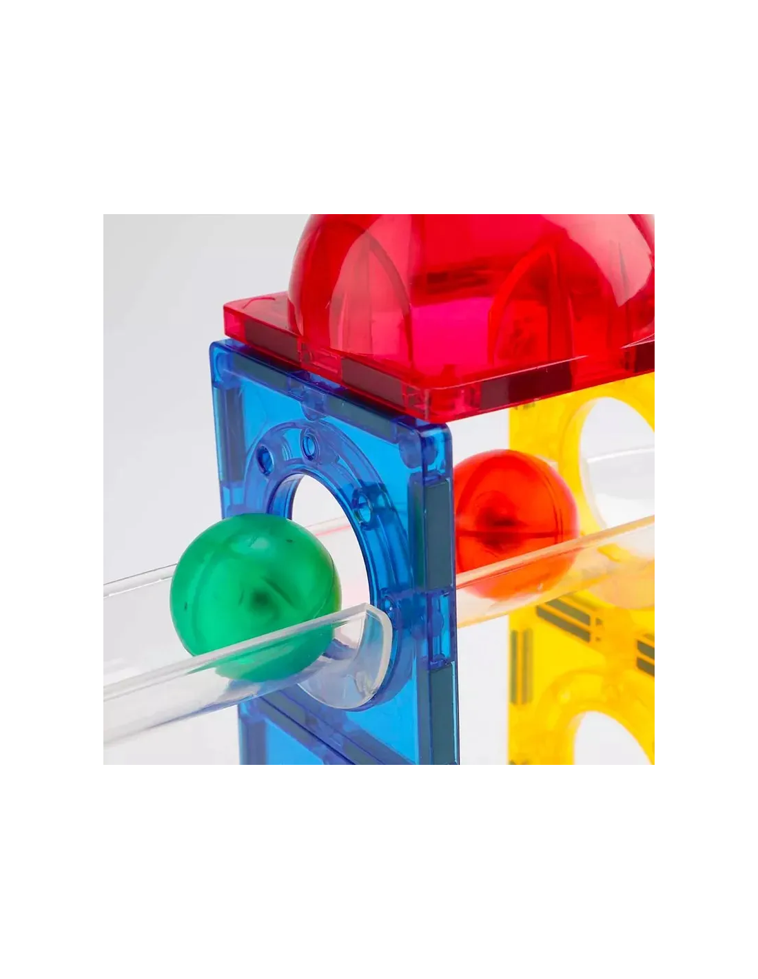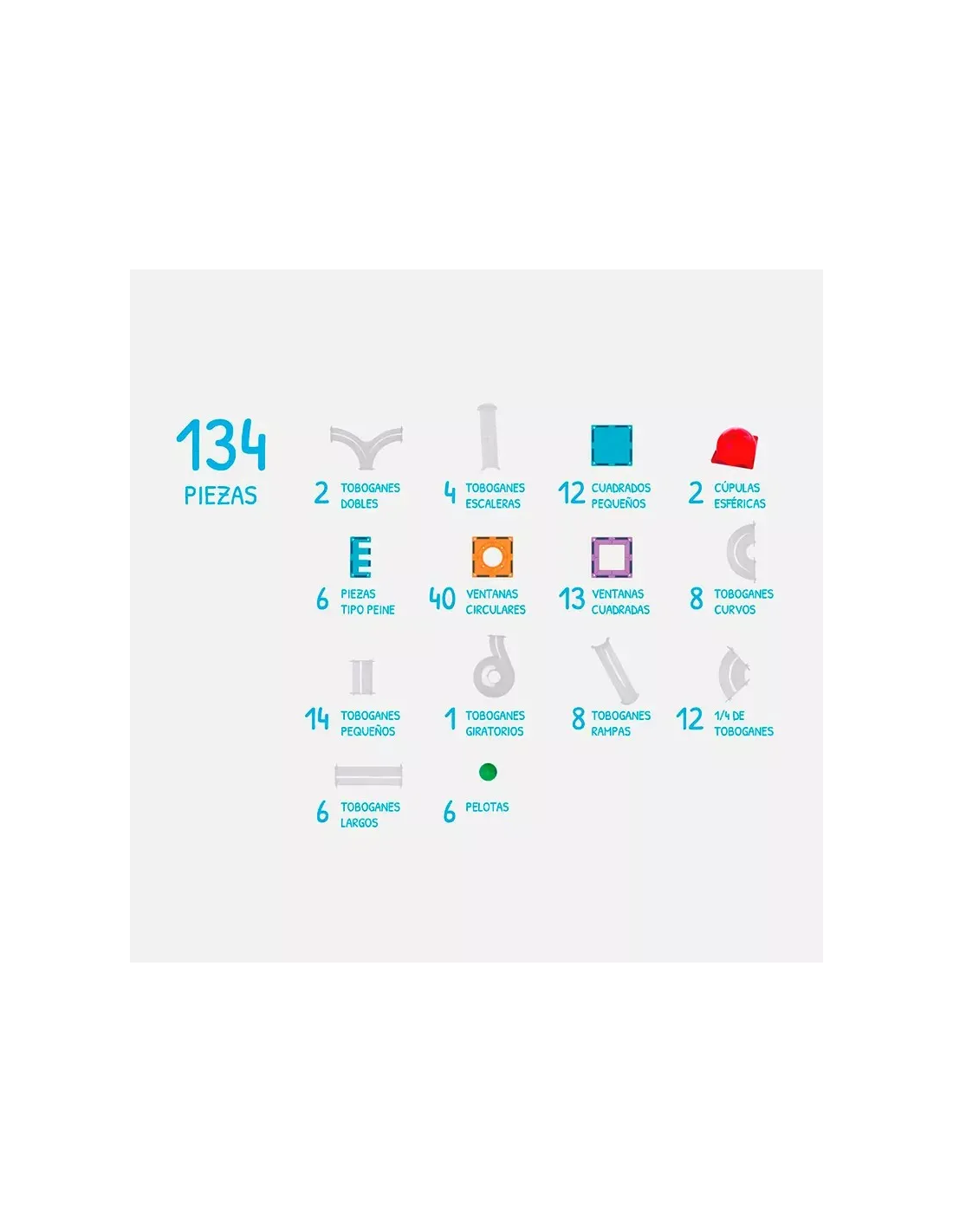 Mega Set de 134 Piezas: Incluye una amplia variedad de bloques magnéticos translúcidos (cuadrados, triángulos) y componentes especiales para el circuito: toboganes, rampas, curvas y pelotas. Es el set ideal para construir la pista de canicas más alta y compleja.