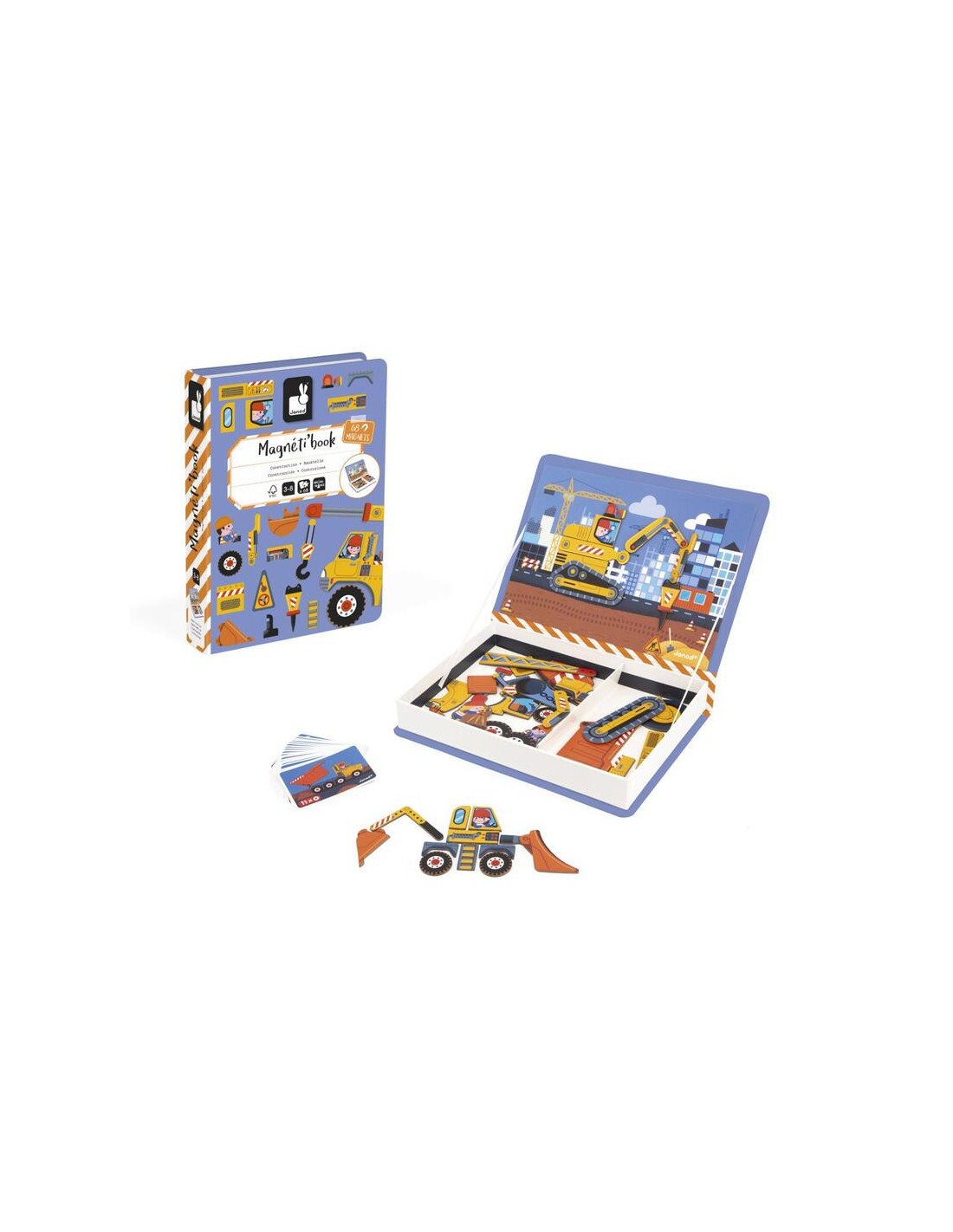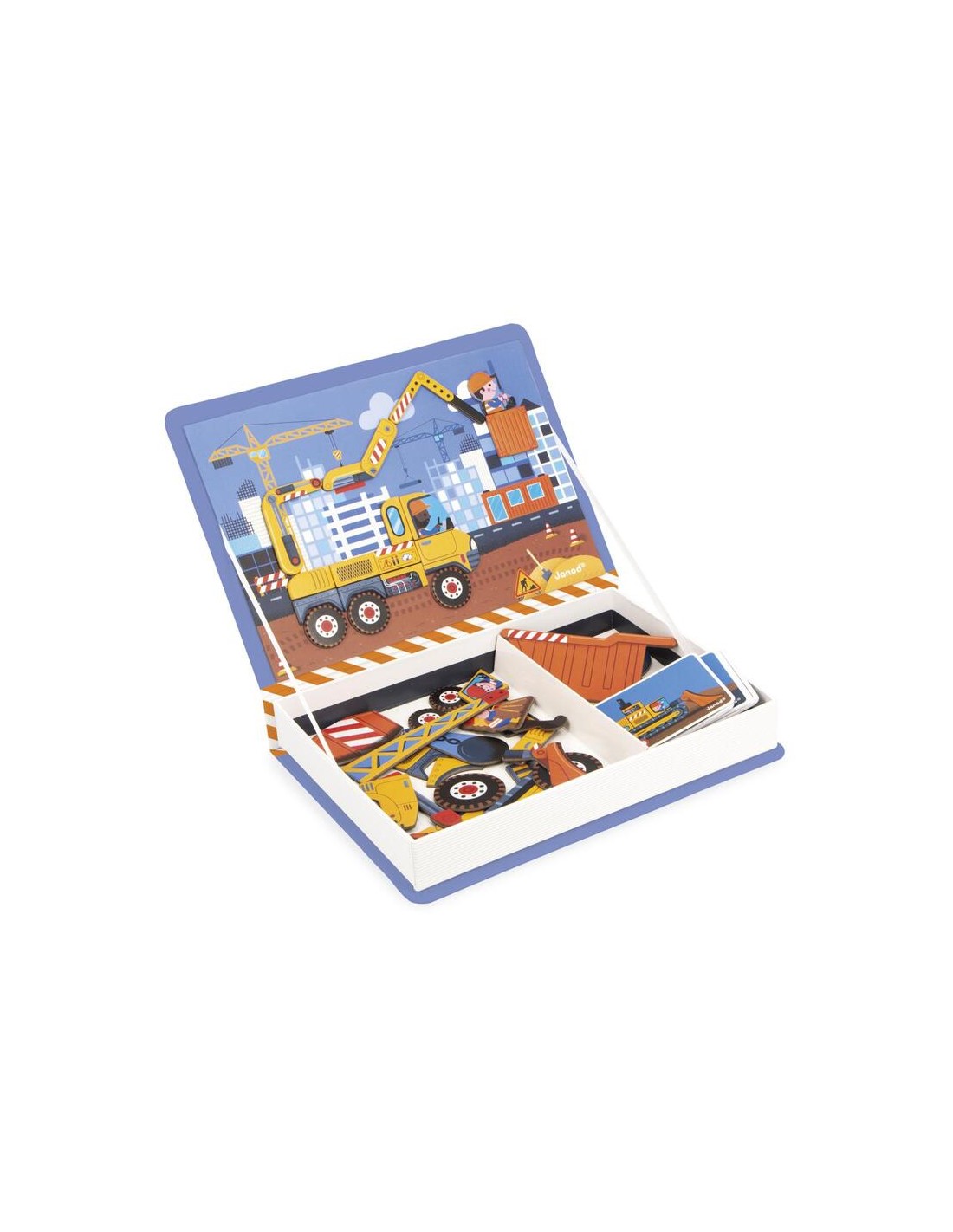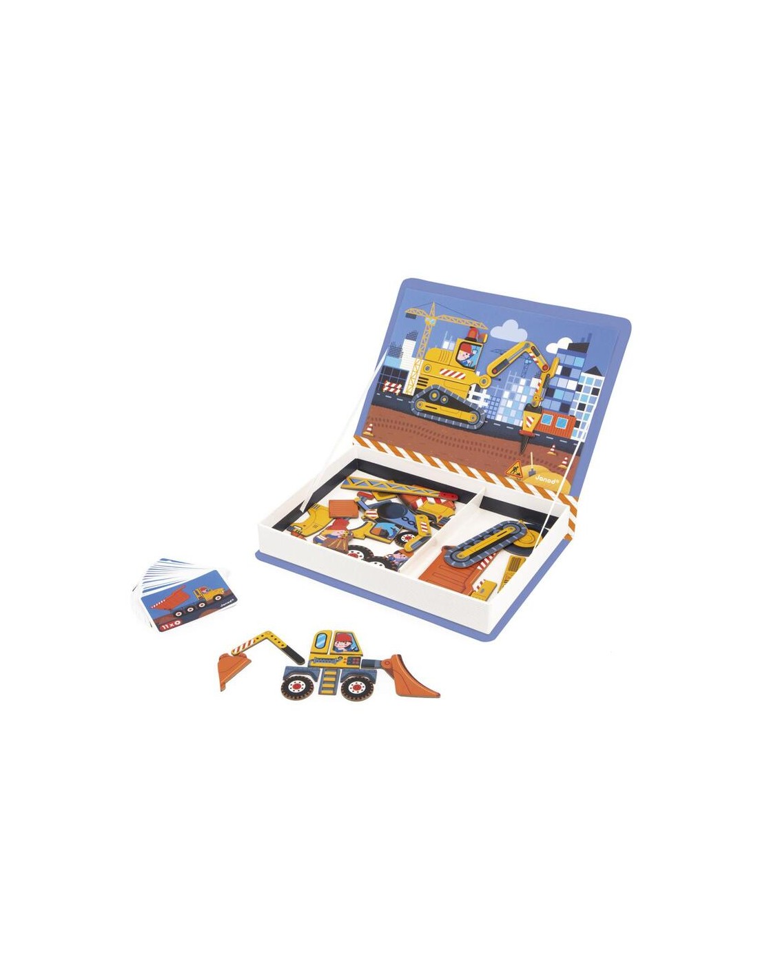 Es un estuche magnético con forma de libro diseñado por la prestigiosa marca francesa Janod. Su objetivo es que los niños creen y reconstruyan diferentes vehículos de obra utilizando piezas imantadas.