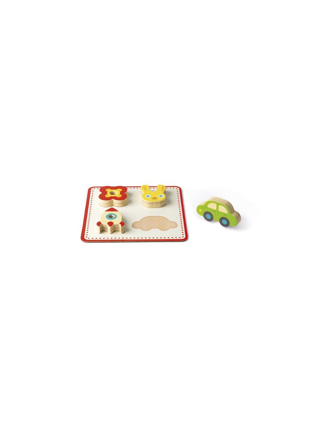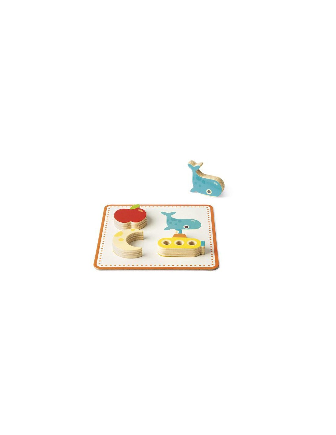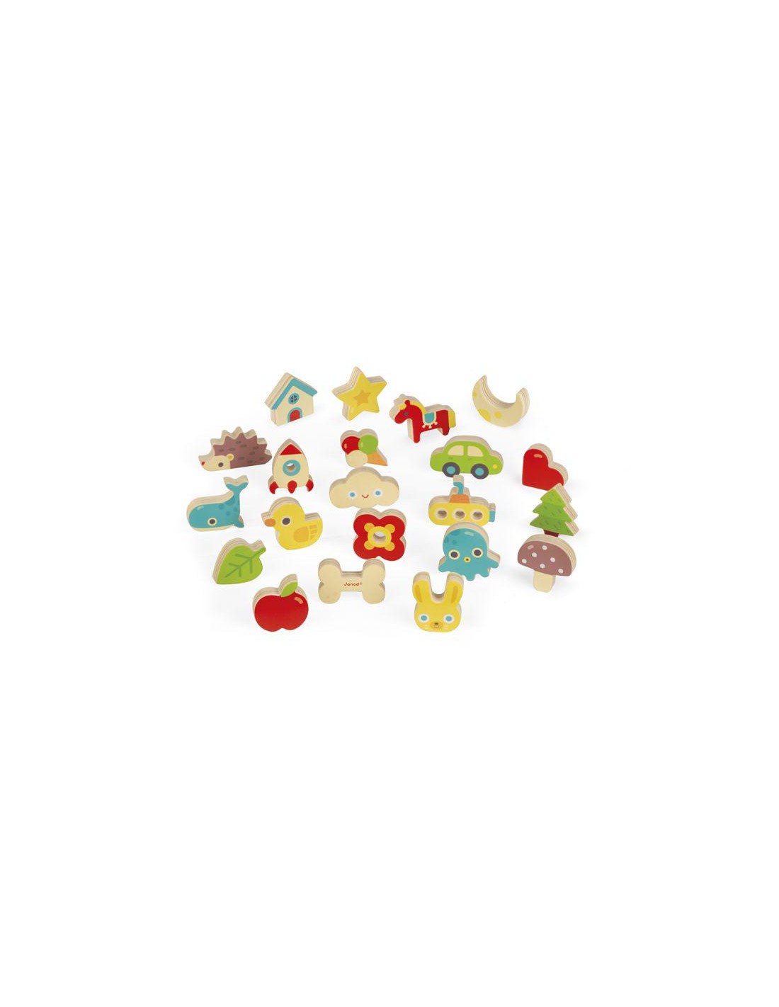 Elegir un cartón de juego, que muestra 4 figuras de las 21 piezas de madera incluidas.