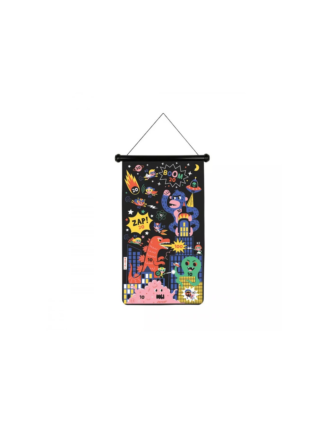 ¡Godzilla, King Kong y muchos más se han juntado para destruirlo todo! ¡Tendréis que armaros con vuestros dardos favoritos y dar en el blanco para detener a los malos luchando como auténticos héroes! Se puede jugar por los dos lados del juego pasando de una ilustración a otra cuando se quiera. Los rivales tendrán 3 dardos cada uno (3 rojos y 3 amarillos) para intentar alcanzar las zonas con los números más altos. ¡Quien más puntos consiga gana! La diana se cuelga fácilmente de la pared con una cuerda.
