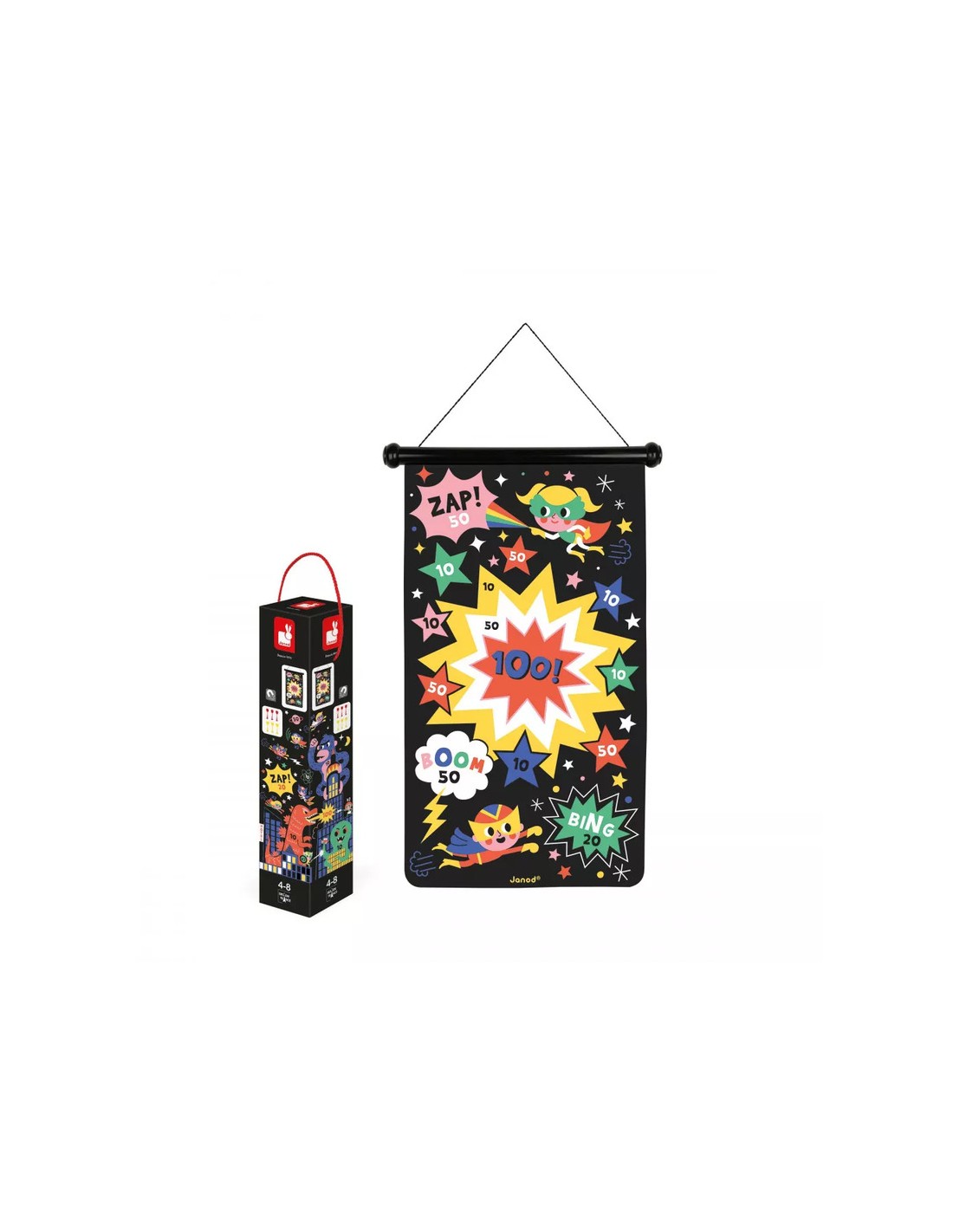 Conviértete en todo un superhéroe de los dardos con este juego magnético de colgar para niños a partir de 4 años! Aprenderás a apuntar con total seguridad gracias a los dardos magnéticos que se pegan como por arte de magia a las dianas de este divertido juego. La punta plana permite jugar sin ningún riesgo incluso a los más pequeños.
