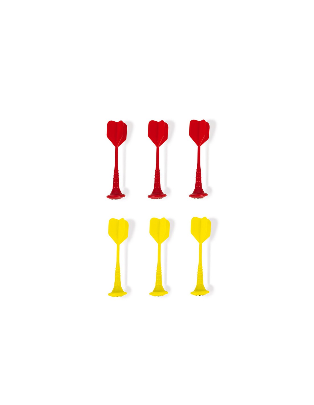 1 diana de doble cara, 6 dardos (3 rojos y 3 amarillos). Es fácil de colgar gracias al cordón y se guarda fácilmente en su caja enrollándolo.