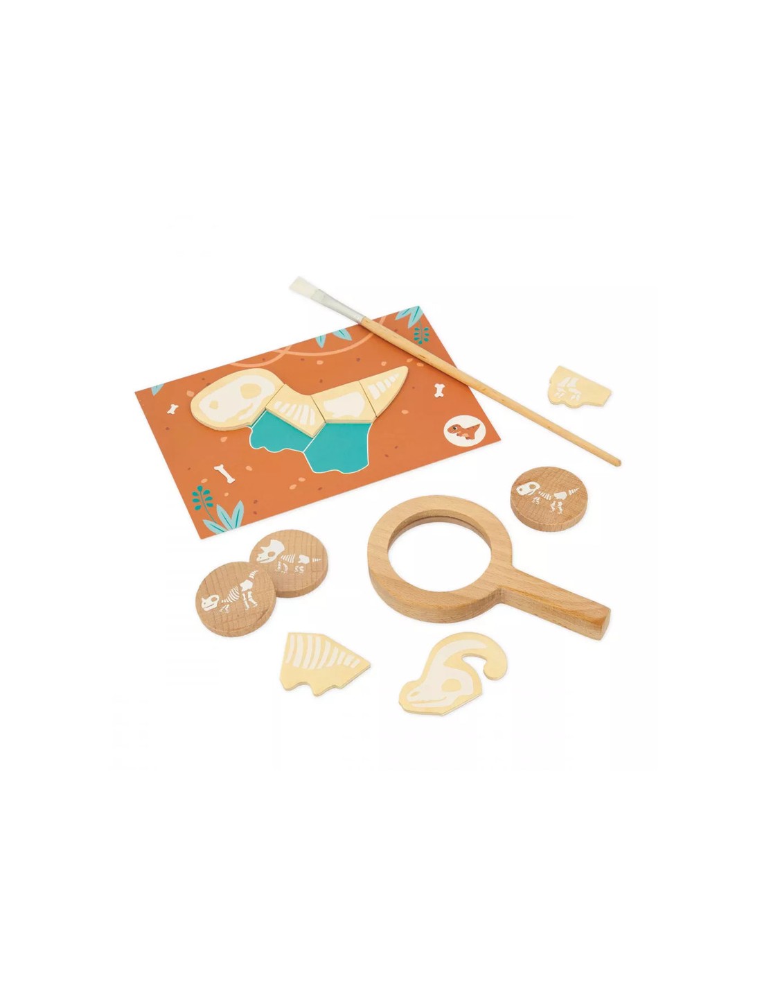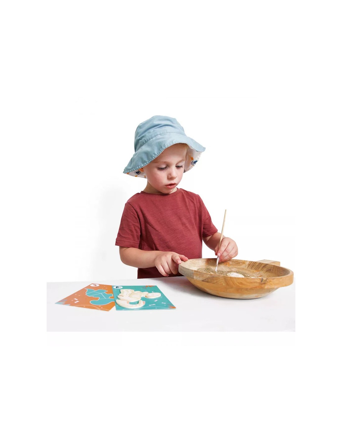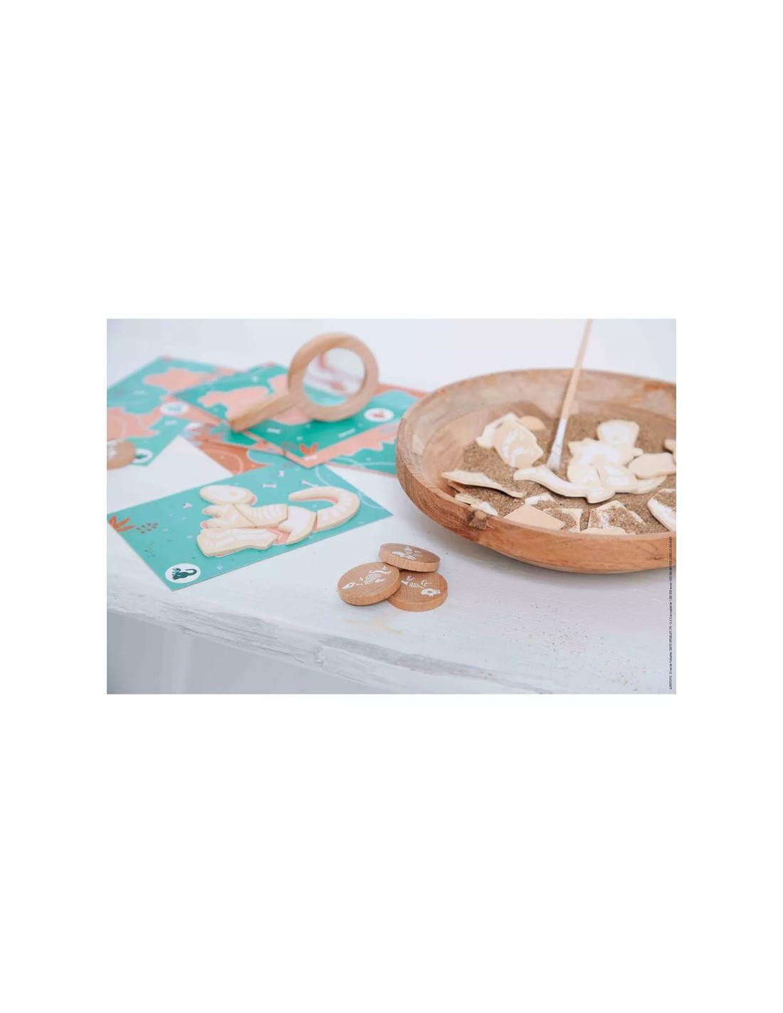 ¿Quién no ha soñado alguna vez con ser paleontólogo y hacer grandes descubrimientos? ¡Con este juego de excavaciones los niños a partir de 4 años se pondrán en la piel de los mejores investigadores y jugarán a encontrar los rastros de los huesos de dinosaurio! Esta actividad lúdica consiste en divertirse encontrando, entre los 64 huesos, los que forman parte de la tarjeta del enigma: ¡hay 10 esqueletos de dinosaurio que reconstruir en este juego de fósiles! ¡Cada enigma tiene su propia carta de respuesta para comprobar si las intuiciones de los pequeños estudiosos del Jurásico son correctas! Para reproducir las condiciones de una auténtica excavación, el juego incluye arena y una lupa. ¡Solo falta un poco de concentración y observación para llegar hasta el final y resolver el misterio! En las bonitas tarjetas de los enigmas, hechas de cartón FSC®, hay una pista visual sobre el dinosaurio en cuestión, ¡pero en carne y hueso!