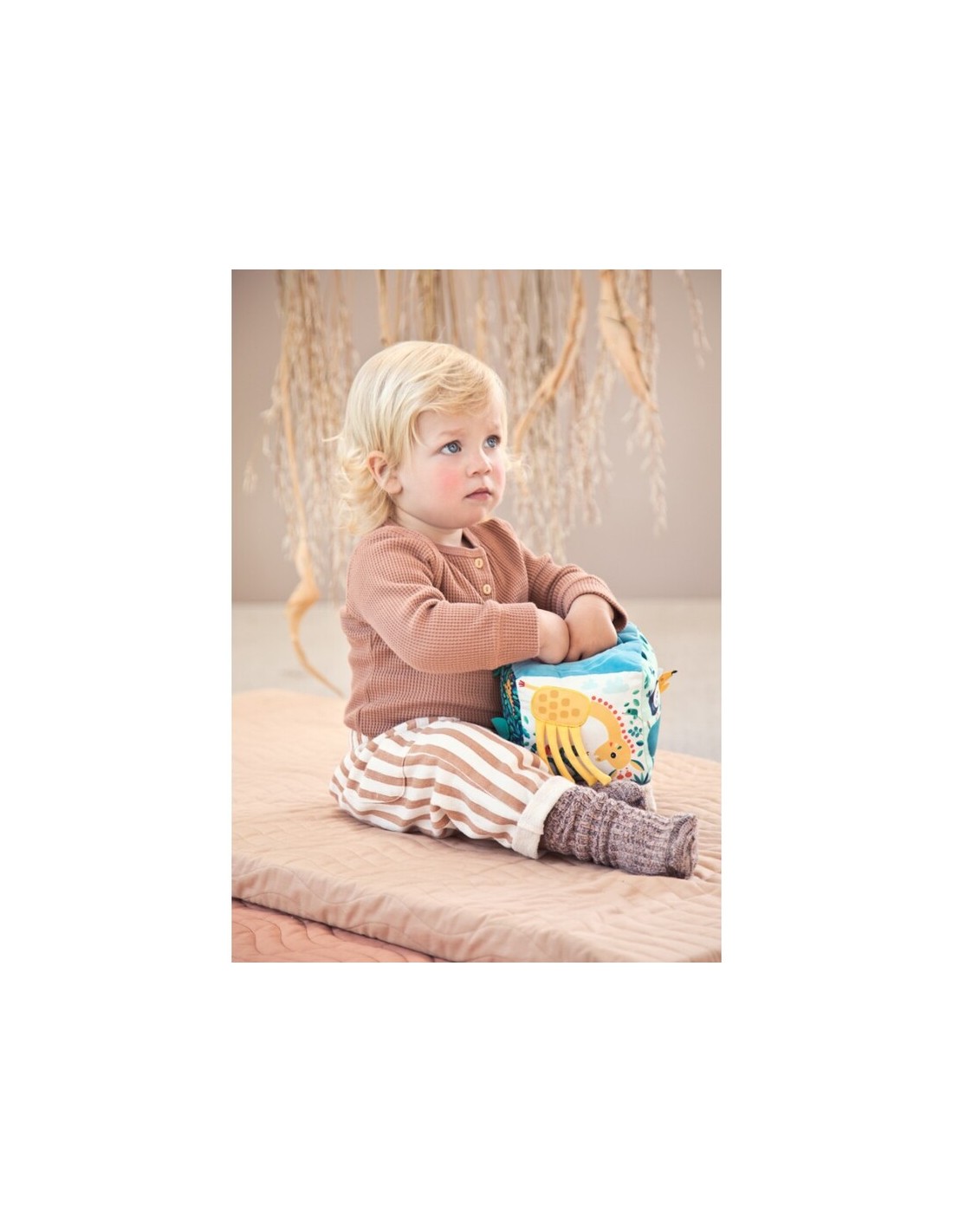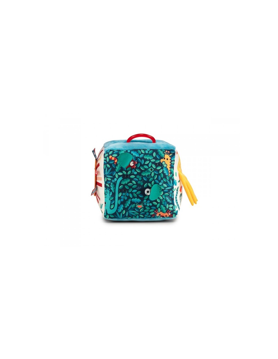 Marius el rinoceronte, Pablo el tucán, Zia la jirafa y muchos más viven en la selva tropical, ¡un peligroso entorno en el que solo se atreven a aventurarse los exploradores! Pero dentro esconde un montón de sorpresas. El pequeño podrá sumergirse en el mundo de la jungla gracias a este cubo de actividad de tela. Hay un montón de experiencias que descubrir en las caras de este cubo blandito con distintos dibujos y texturas, además de los sonidos de los animales de la selva gracias a la cajita de música integrada. Una fuente de inspiración y de estímulos para los pequeños exploradores.