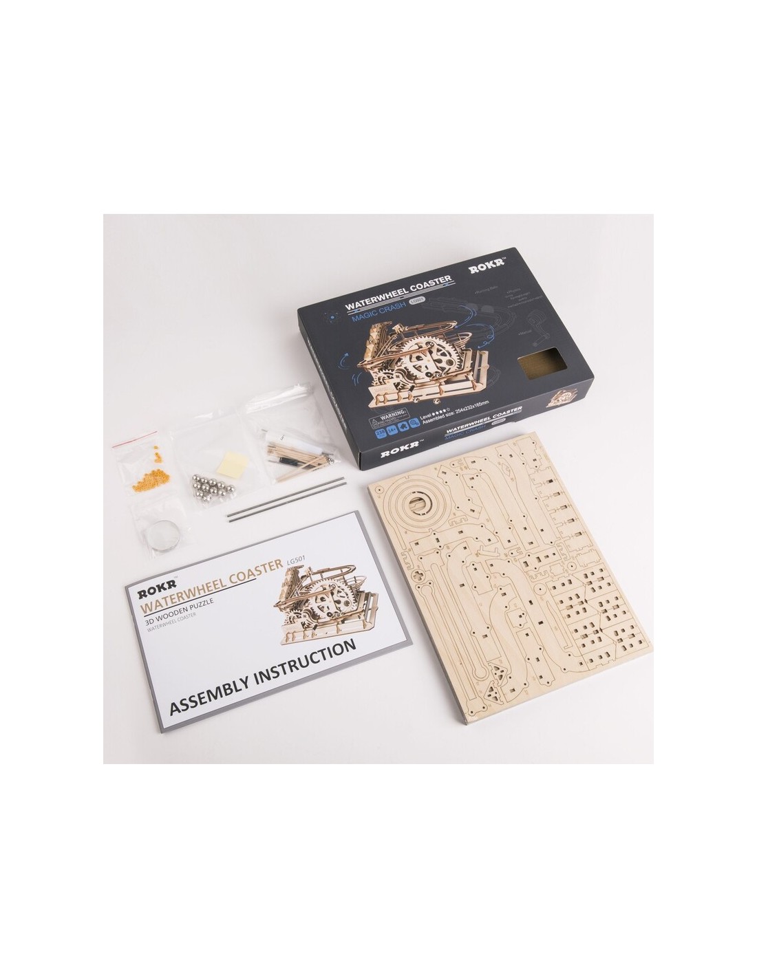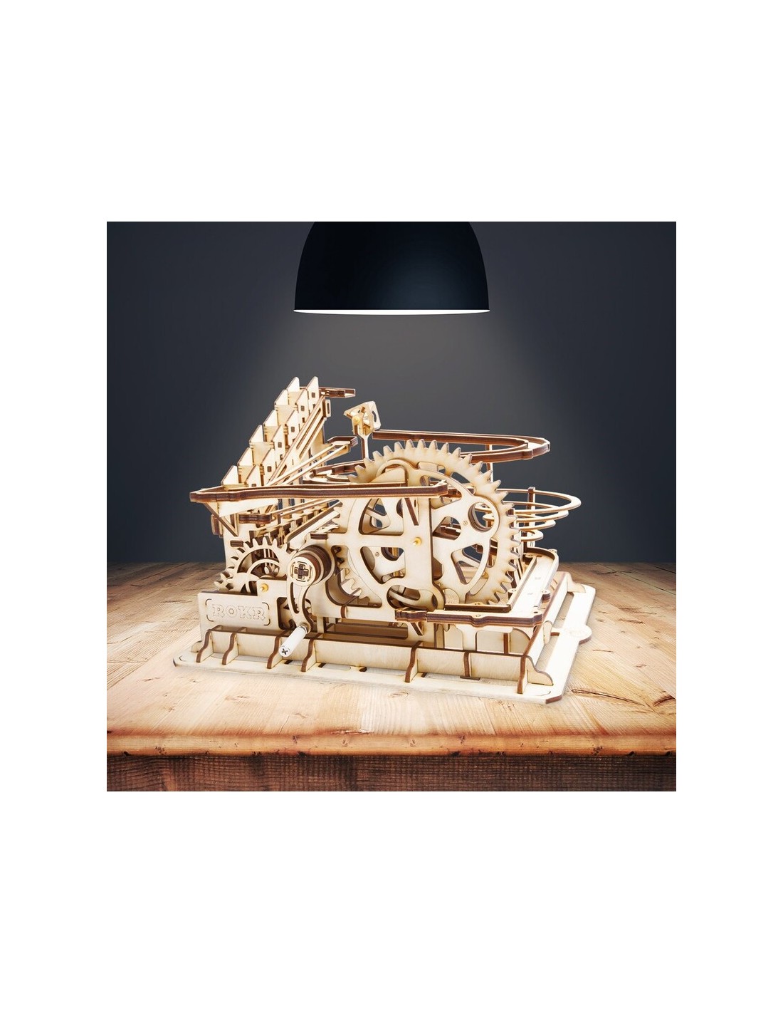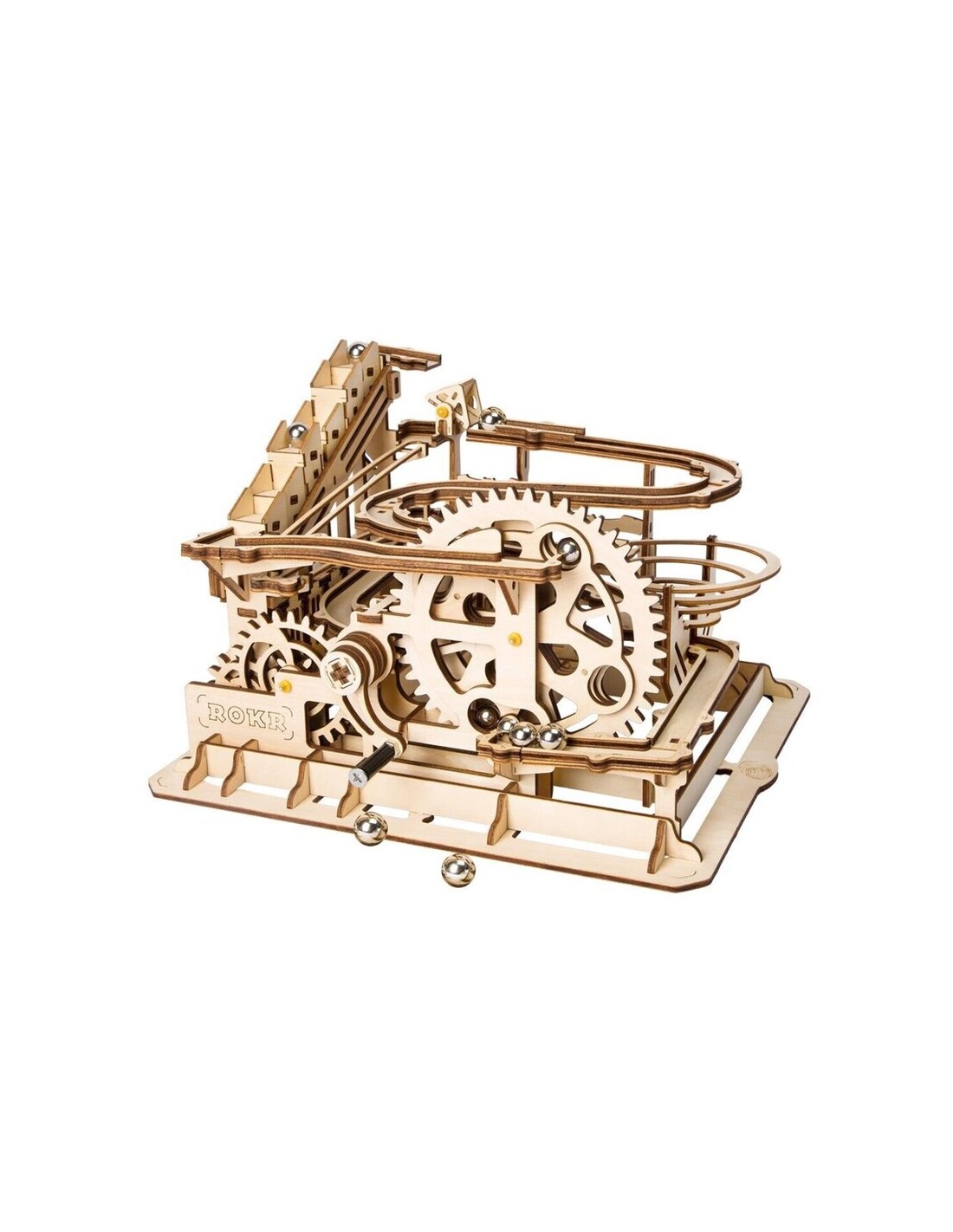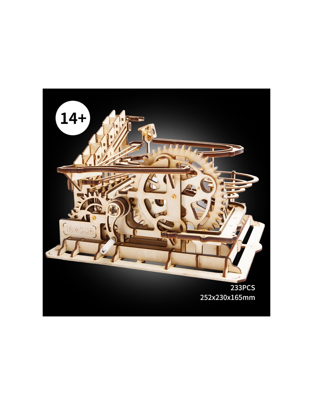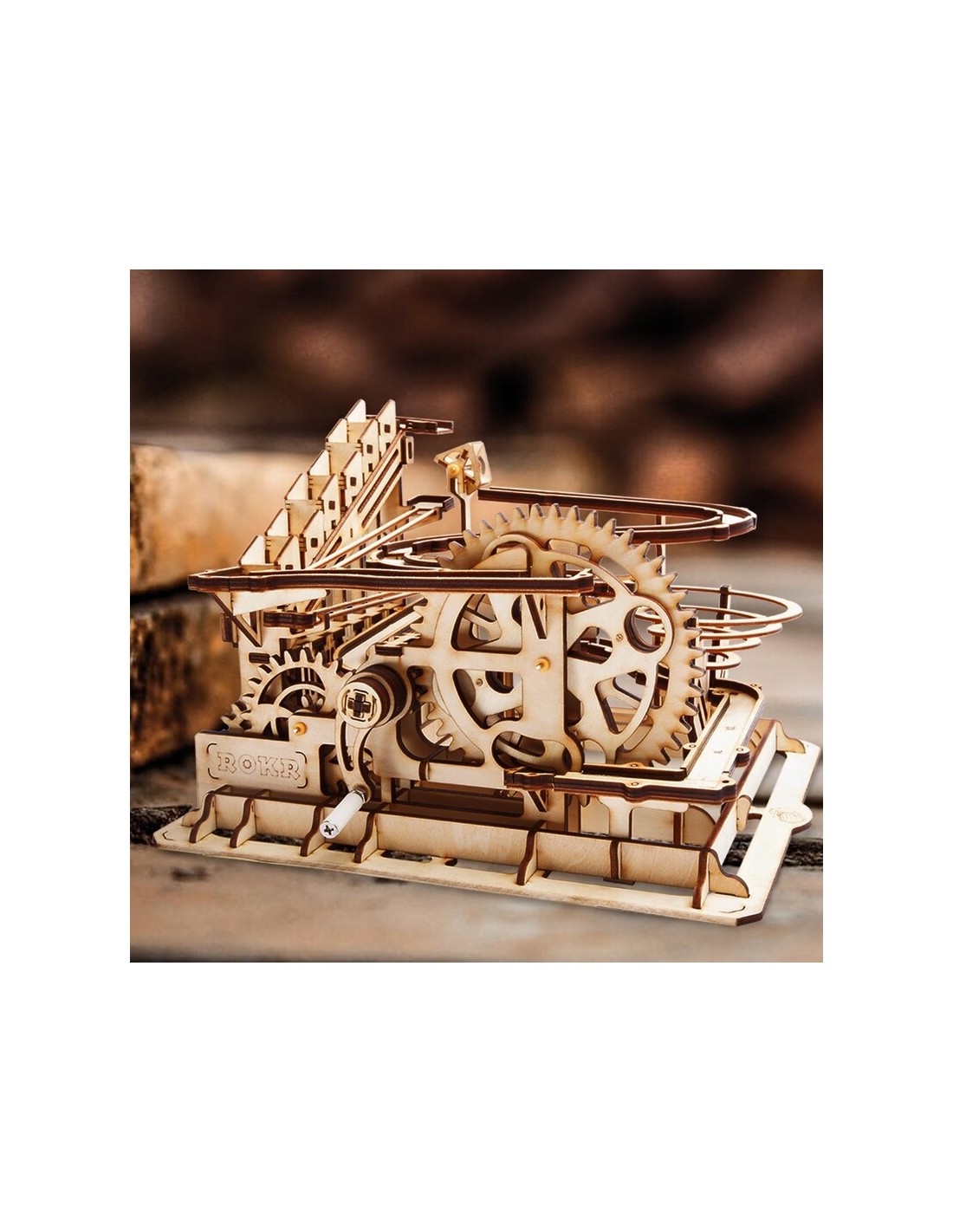 Descubre el poder del movimiento con WATERWHEEL COASTER, una maqueta DIY en madera que simula una montaña rusa mecánica con una elegante rueda hidráulica decorativa. Este modelo combina engranajes, rampas y gravedad para hacer circular canicas en un circuito dinámico, ideal para quienes disfrutan de la ingeniería, el diseño y las manualidades creativas.