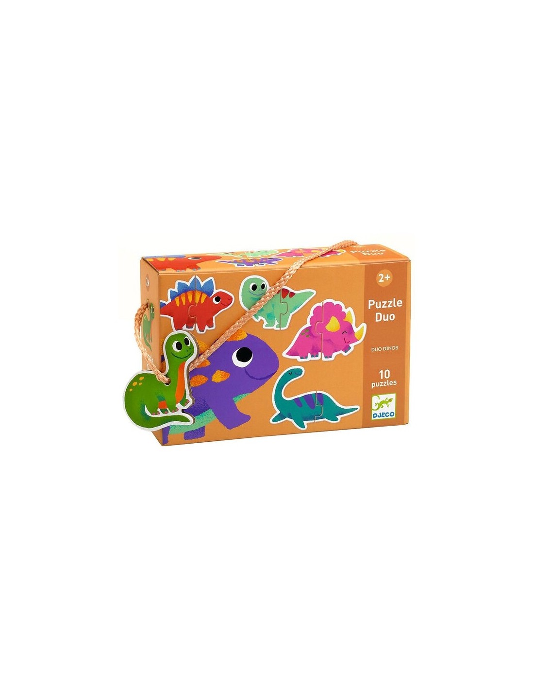 Puzzle duo Dinos de Djeco es un primer puzzle de asociación a partir de 2 años. Se trata de 10 puzzles de 2 piezas cada uno que el peque tendrá que recomponer. Ideal para desarrollar la motricidad y el pensamiento lógico en los más pequeños. La caja tiene un cordón que sirve de asa para fácil transporte.