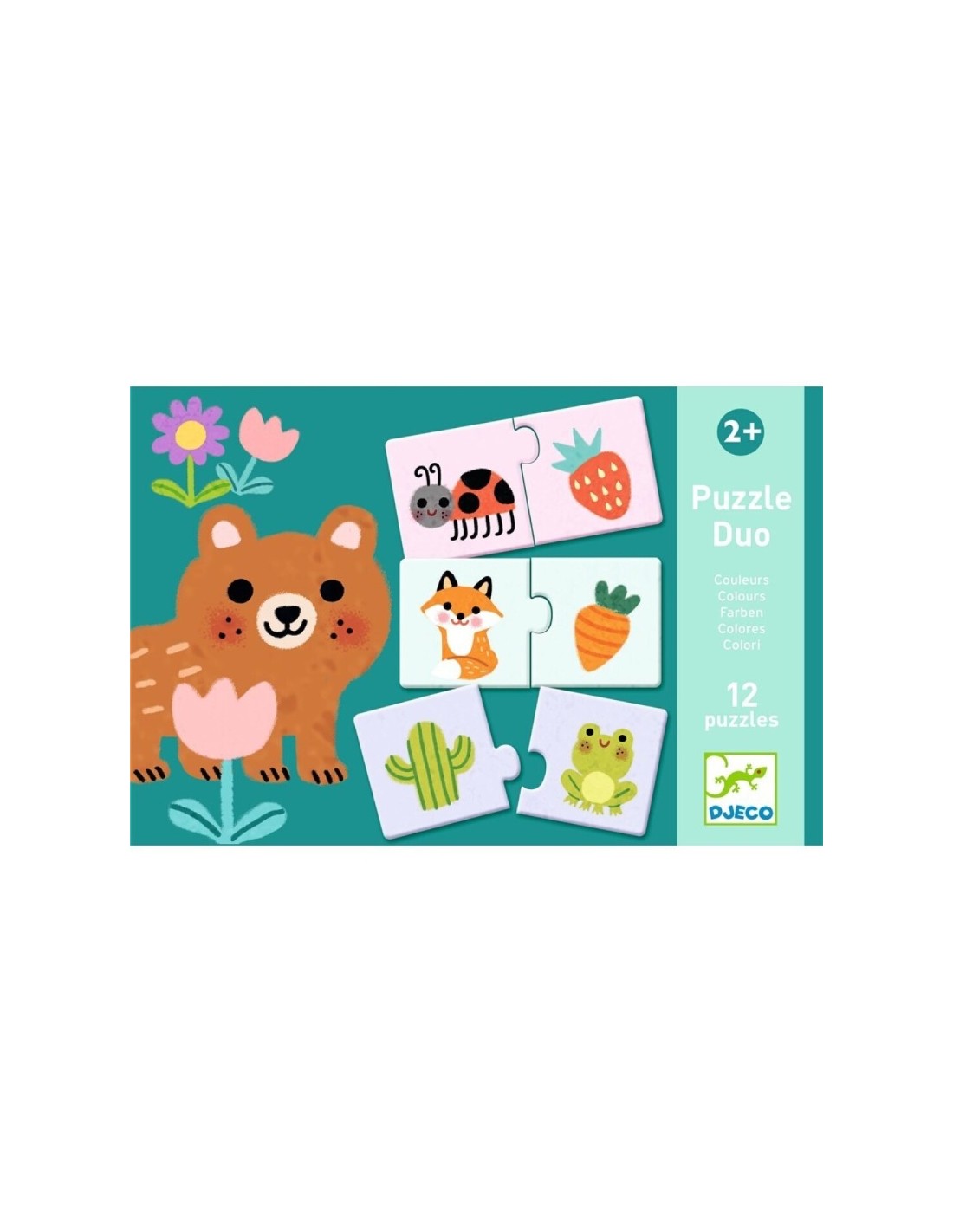 -Puzzle duo Colores es un rompecabezas lúdico en el que el niño reconstruye animales con silueta ensamblando 2 piezas. A partir de 2 años.