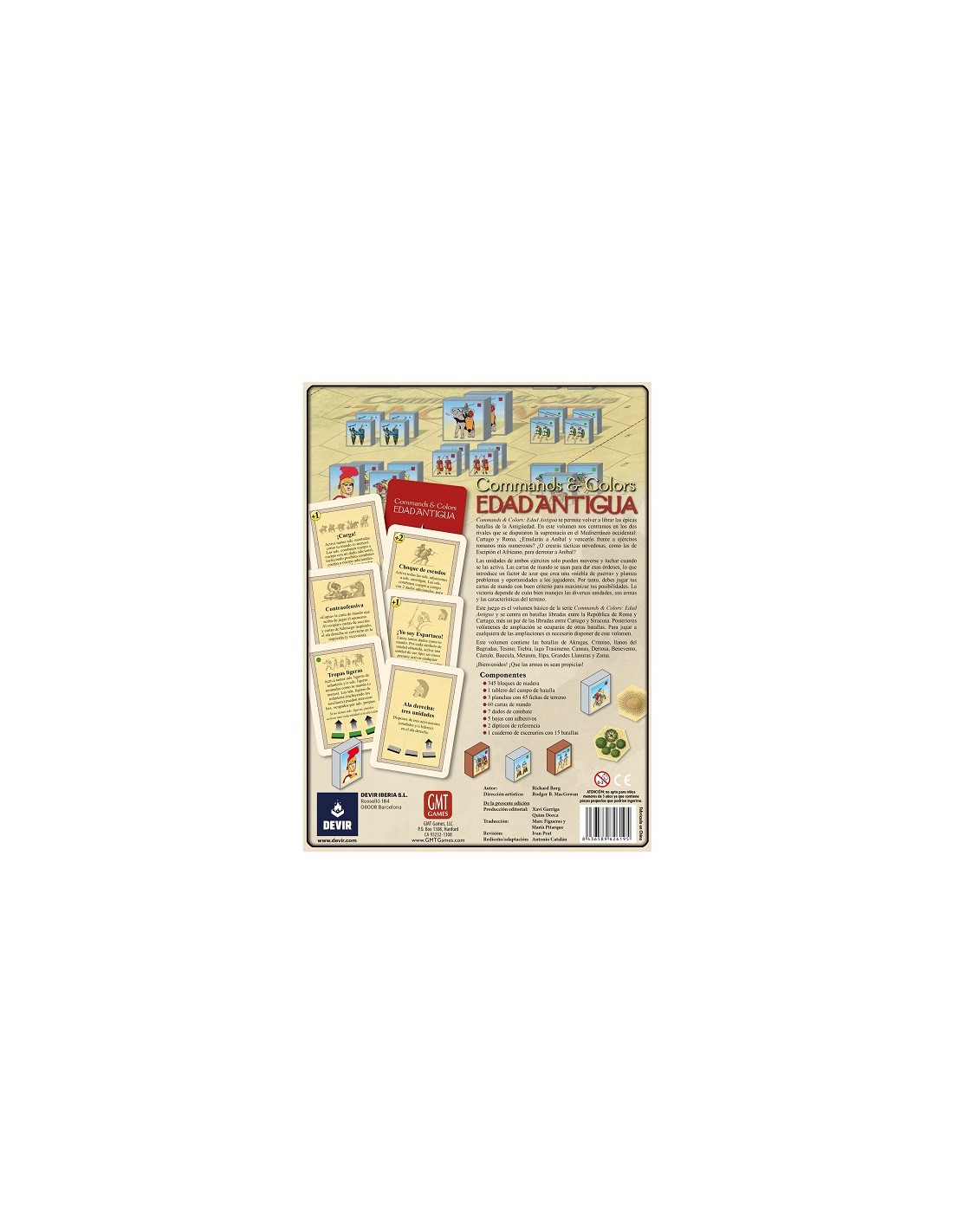Commands and Colors Edad Antigua es un juego de guerra táctico para dos jugadores en el que se recrean épicas batallas de la antigüedad. A través de un sistema de motor de cartas que van guiando los acontecimientos, las batallan evolucionan de formas insospechadas. Este juego es más ligero y corto que otros wargames con mayoría de escenarios que se juegan a lo largo de una hora.