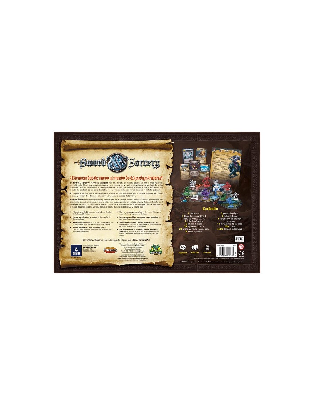 Vuelven las aventuras de fantasía épica... ¡En caja grande! Crónicas Antiguas es una nueva aventura de Sword & Sorcery, independiente pero compatible con su predecesora, Almas Inmortales. Este dungeon crawler cooperativo diseñado por Simone Romano y Nunzio Surace se puede disfrutar en solitario o con grupos de hasta 5 héroes, a partir de 12 años, que se enfrentarán a las hordas oscuras en una campaña con múltiples escenarios o en aventuras sueltas.