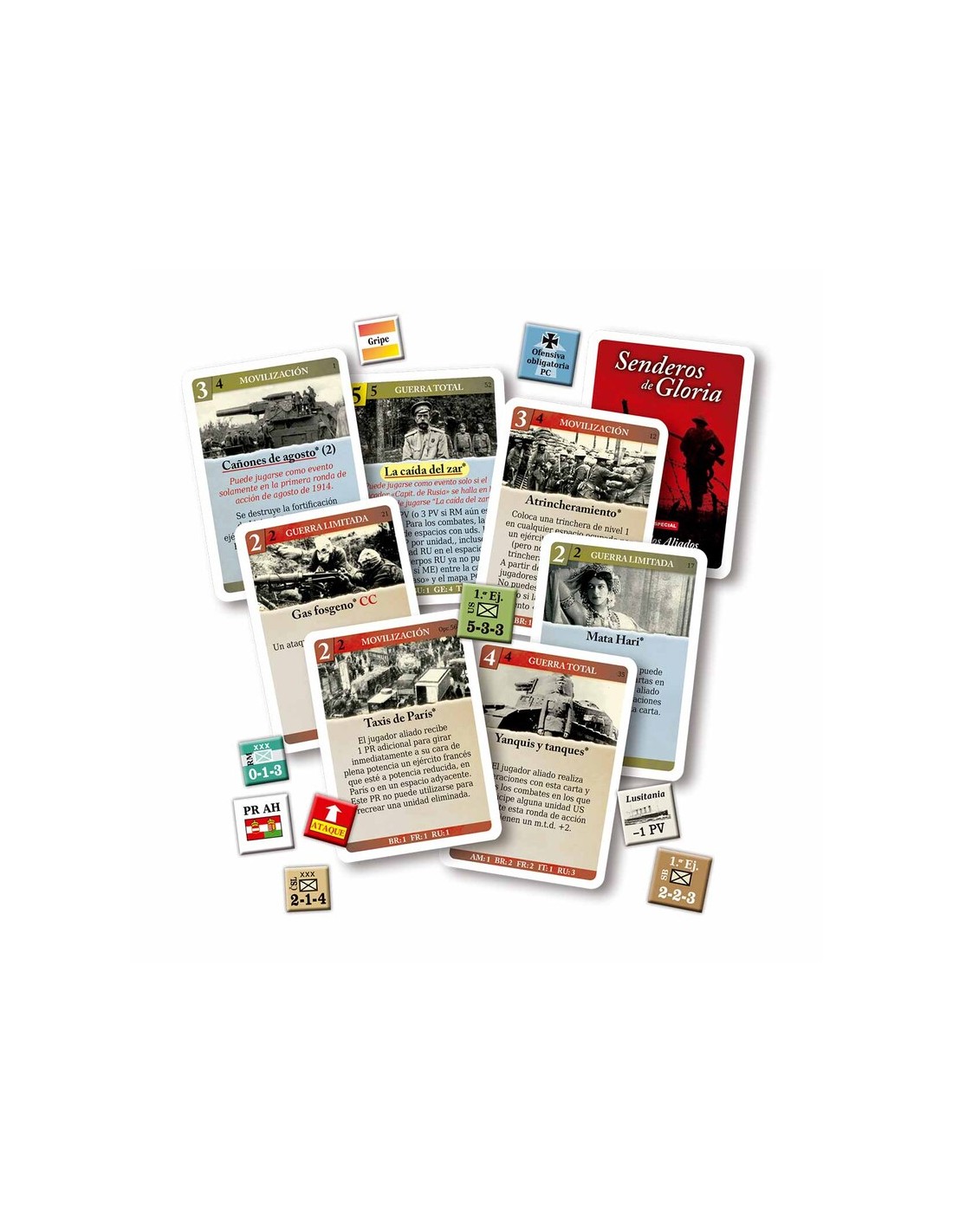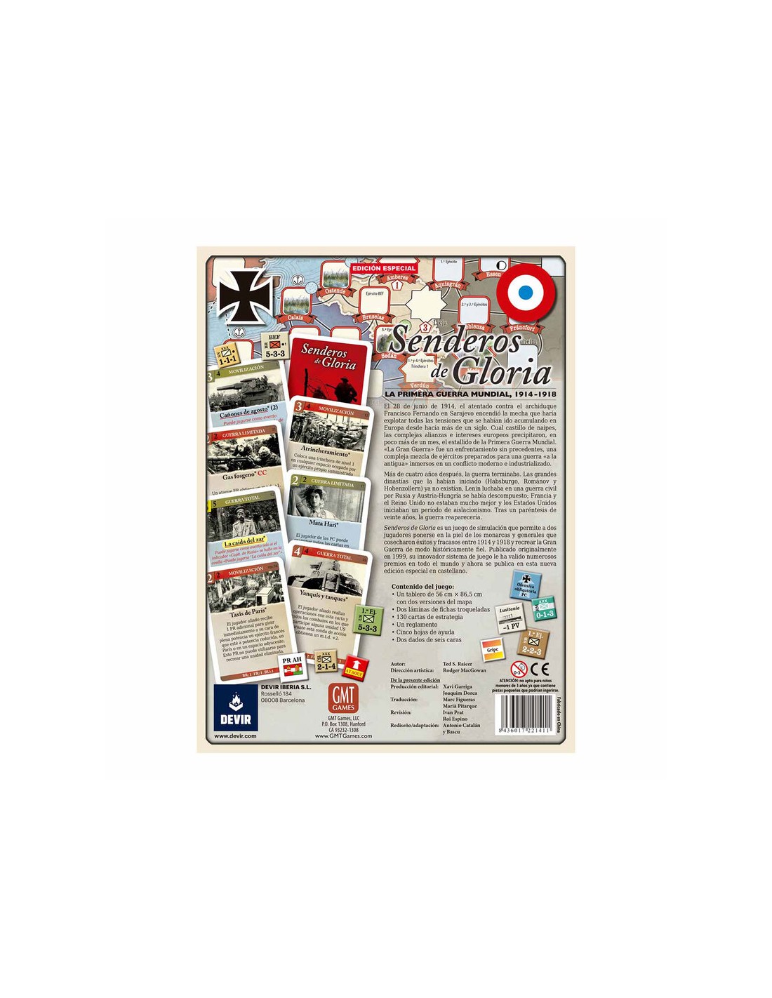Senderos de Gloria es un juego en el que dos contrincantes se enfrentan en una fiel recreación de la Gran Guerra. La primera edición de este juego es de 1999. Esta nueva edición trae un tablero a doble cara, por un lado el clásico de Mark Simonitch y uno nuevo de Terry Leeds que cambia la estética, adecua los espacios y corrige pequeños errores de topónimos y fronteras nacionales de ese momento histórico.