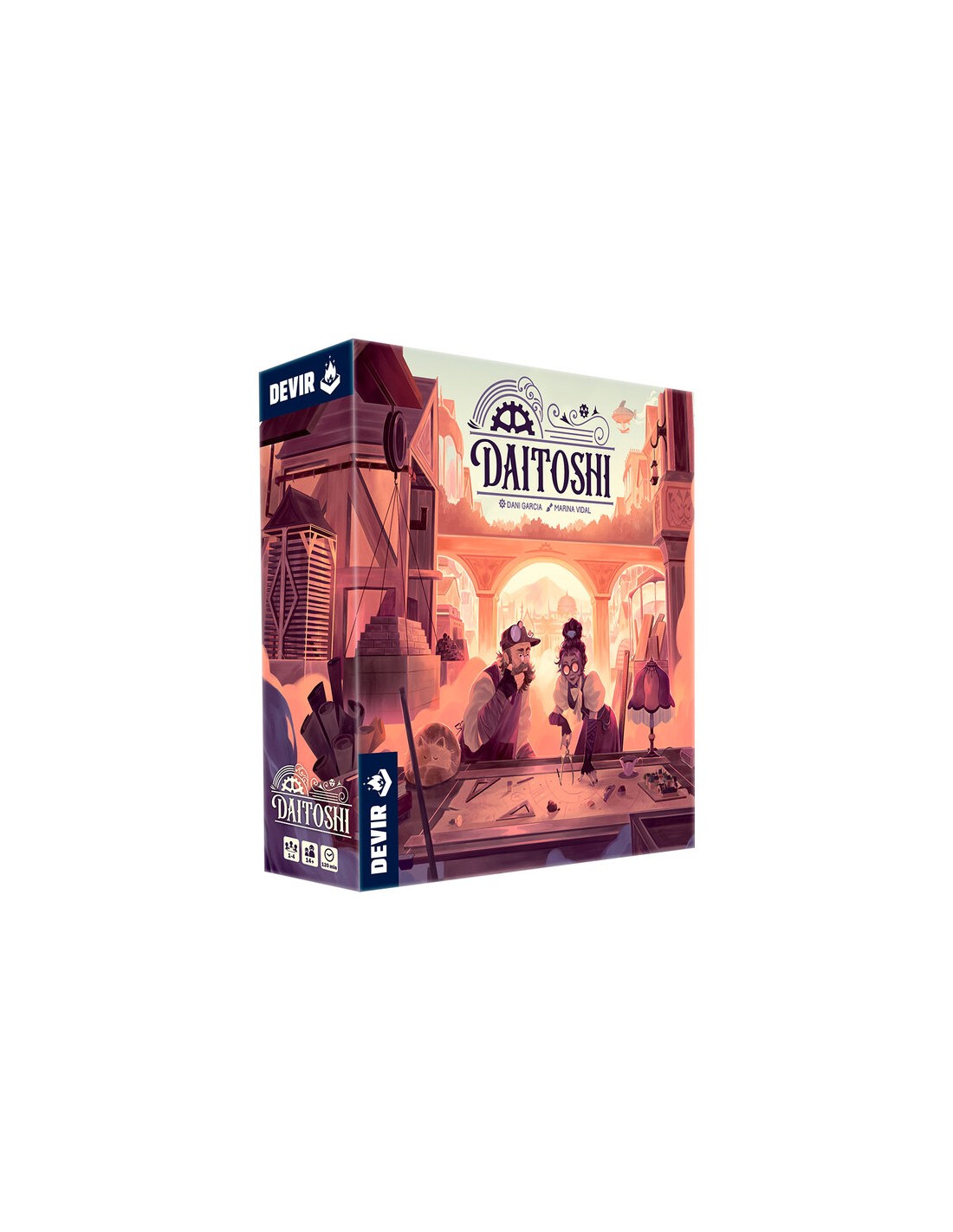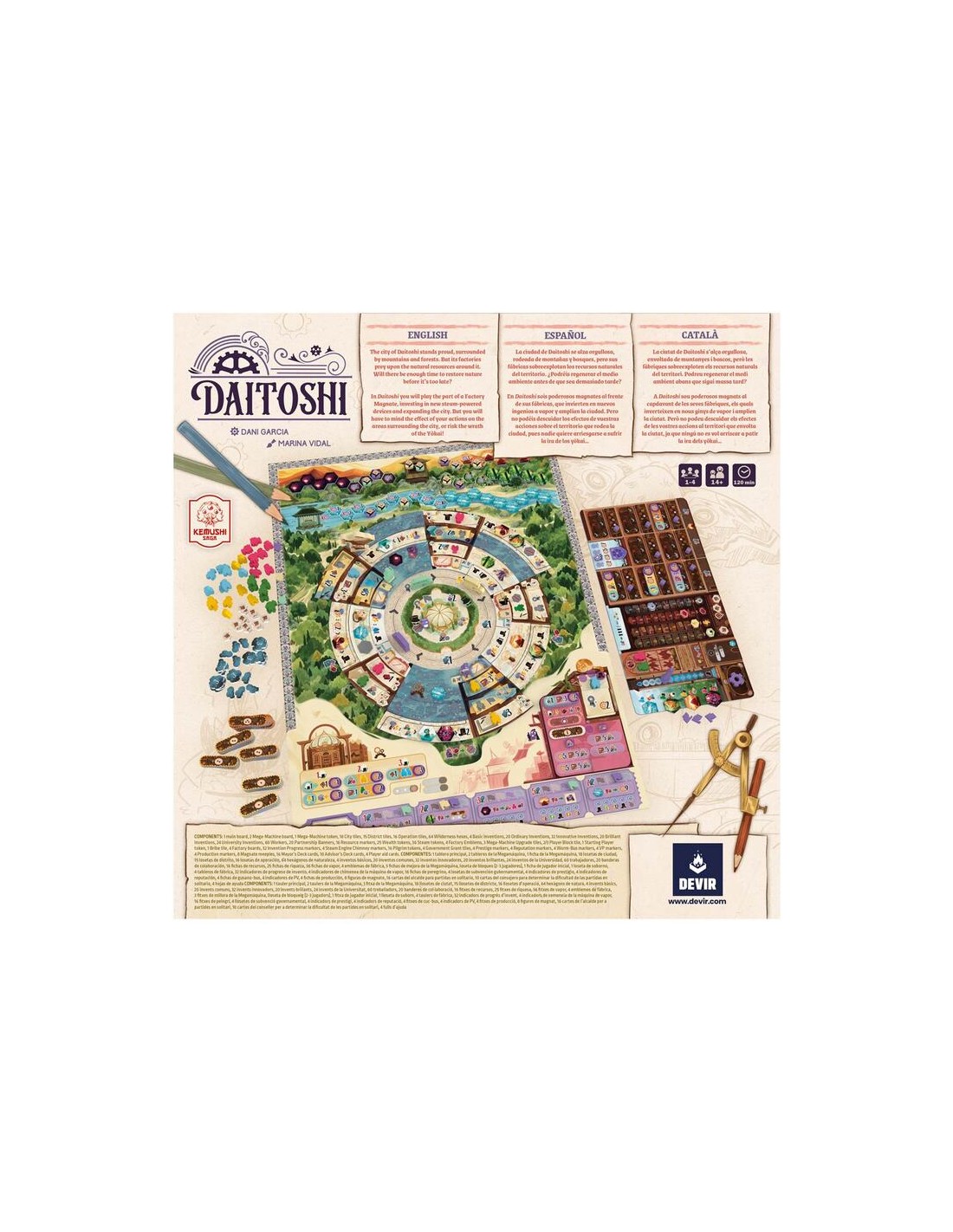 Diseñado por Dani García (autor de juegazos como Barcelona o Arborea) e ilustrado por Marina Vidal, Daitoshi se puede disfrutar solo o en grupos de hasta 4 jugadores, a partir de 14 años, en partidas de unas 2 horas de duración. Los jugadores competirán para sumar el máximo número de puntos de victoria a lo largo de una serie de rondas.