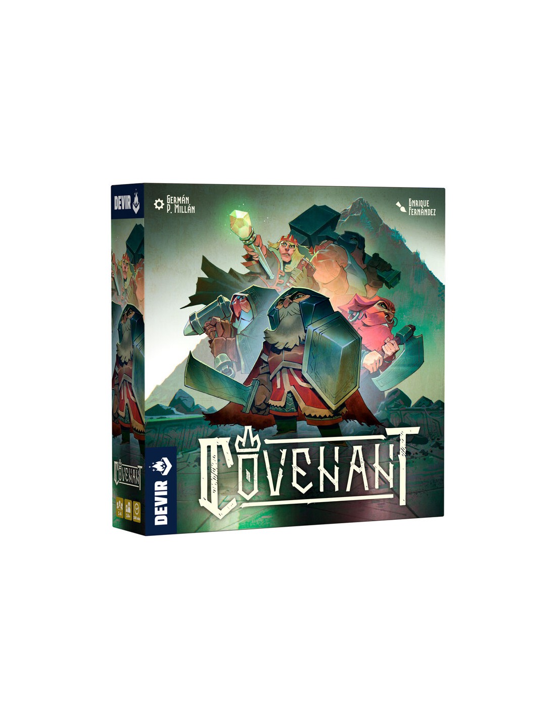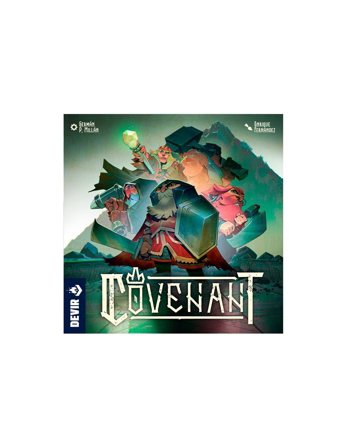 Diseñado por Germán P. Millán (autor de Bitoku, Sabika o Men Nefer) e ilustrado por Enrique Fernández, Covenant se puede disfrutar en solitario o en partidas de hasta 4 jugadores, a partir de 14 años, en sesiones de unos 100 minutos de duración. En Covenant, cada jugador es el jefe de un clan enano que ha aceptado el pacto para recuperar el hogar ancestral de los enanos. A lo largo de 3 rondas, denominadas eras, cada clan contribuirá a la reconstrucción de la ciudad perdida, conquistada y arrasada por fuerzas oscuras hace siglos.