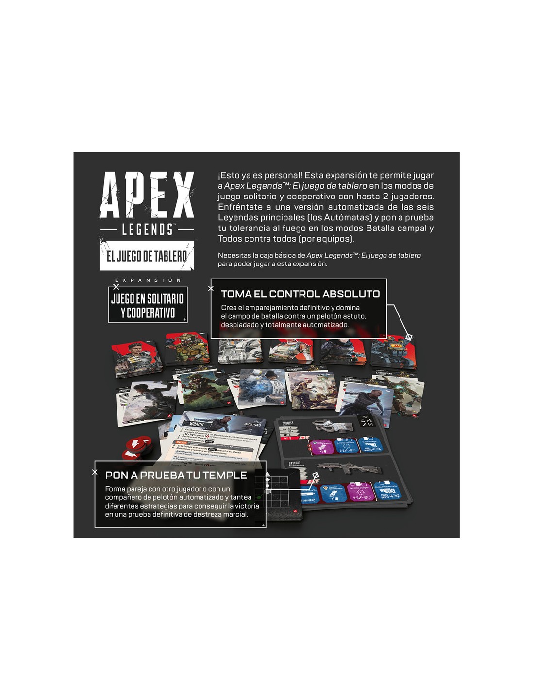 Apex Legends: Expansión en solitario y cooperativo amplía el juego de mesa oficial permitiendo jugar en solitario o en modo cooperativo para 2 jugadores, enfrentándote a los Autómatas, versiones automatizadas de las seis Leyendas principales. Esta IA introduce un desafío realista y exigente que simula la agresividad y la imprevisibilidad del videojuego