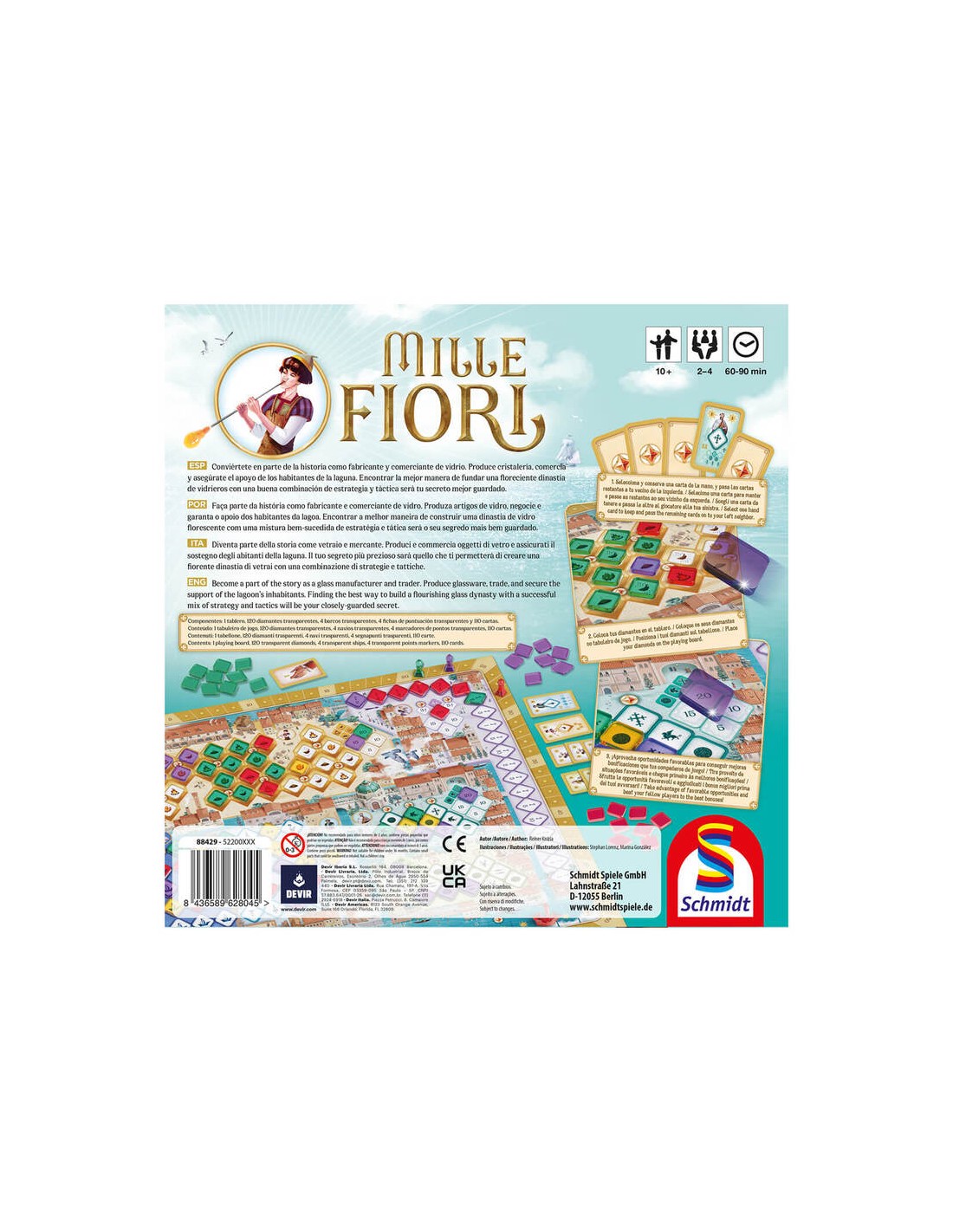 Mille fiori es un juego del prestigioso y prolífico diseñador Reiner Knizia, autor de infinidad de juegos. Ilustrado por Stephan Lorenz y Marina González, ofrece partidas de entre 60 y 90 minutos de duración para entre 2 y 4 jugadores, a partir de 10 años. En Mille fiori los participantes encarnan a un artesano y comerciante del vidrio y tratarán de sumar más puntos que el resto.