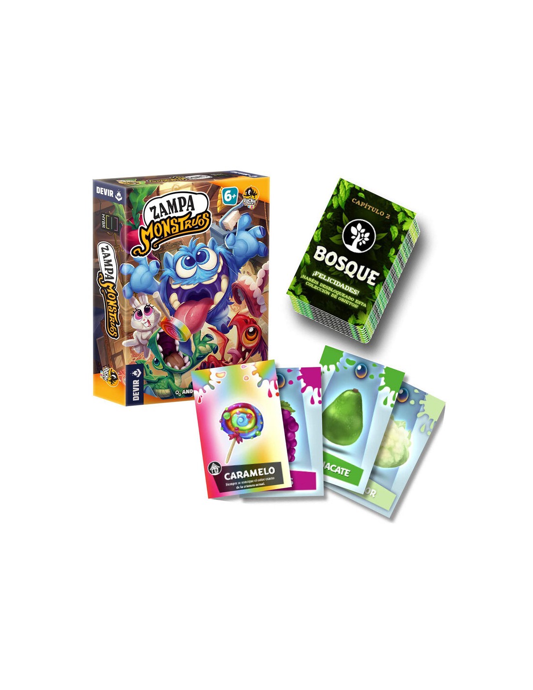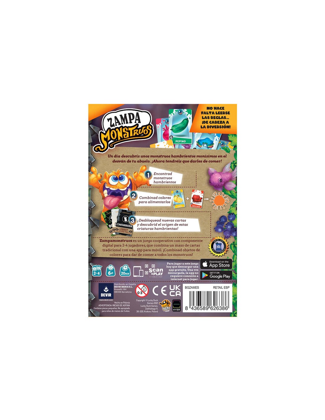 Palabras clave relevantes para búsquedas: Zampa Monstruos, juego de cartas, juego cooperativo, juego familiar, juego niños, monstruos, alimentar monstruos, combinación de colores, app juego, Devir.