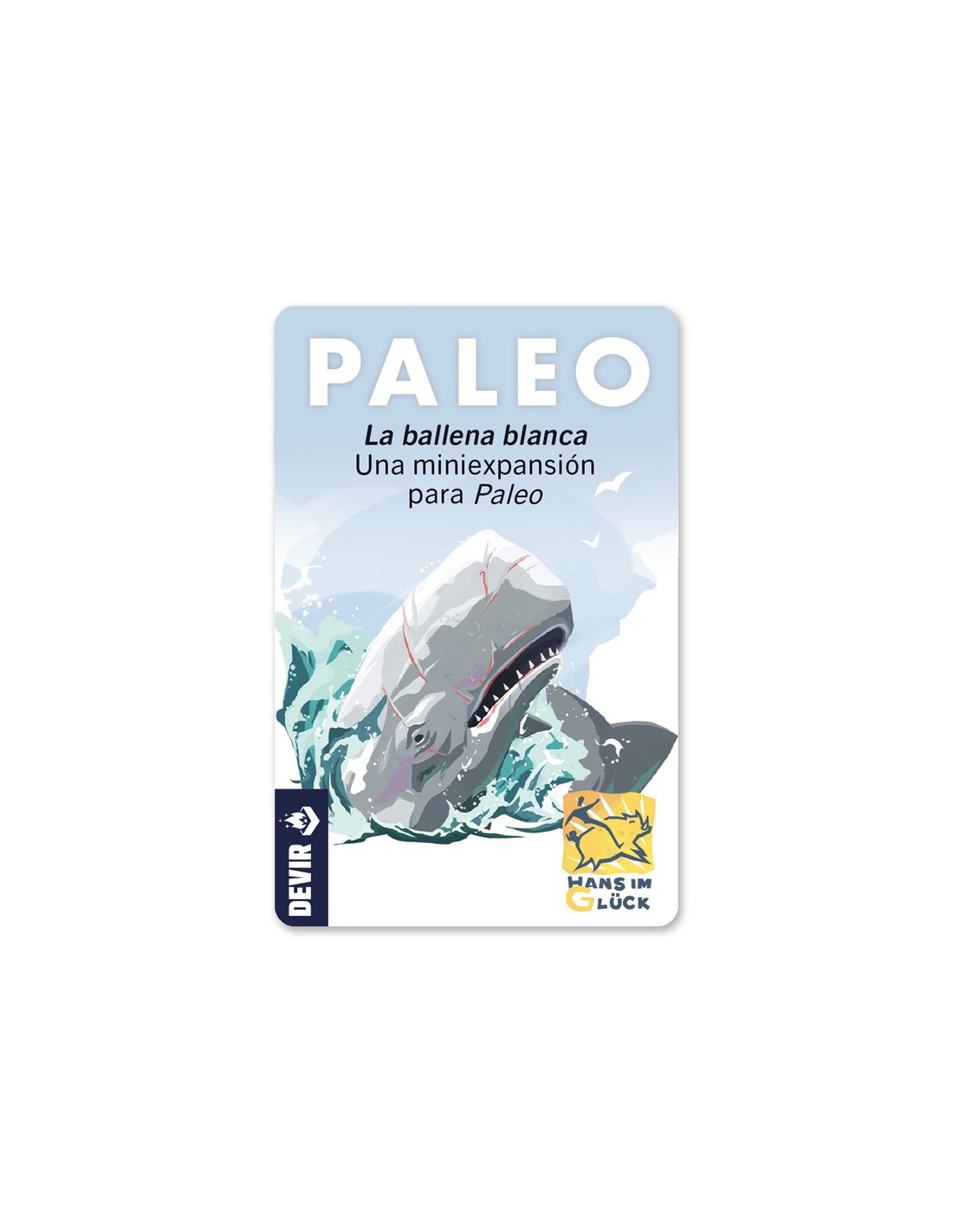 Paleo: la Ballena Blanca es una miniexpansión del afamado juego Paleo. Nos trae 13 cartas de mar que usaremos cuando salgamos a navegar con el objetivo de buscar a la Ballena Blanca. Deberemos ser rápidos en encontrarla porque por cada noche que no la encontremos, recibiremos una ficha de craneo. Esta mini expansión aumenta de dificultad con el número de jugadores.