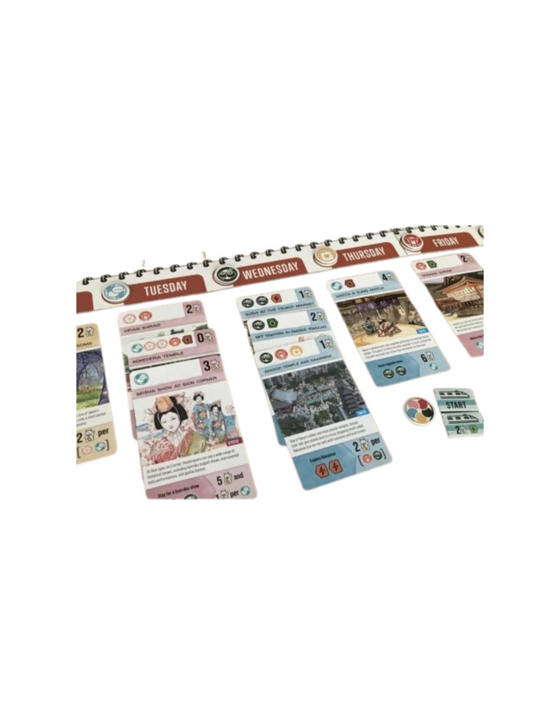 Con 160 cartas bellamente ilustradas, descubrirás actividades y las colocarás estratégicamente para crear tu itinerariode una semana. Elige las más óptimas para maximizar tu experiencia y equilibrar tus recursos. Juega en modo competitivo o en solitario y obtén puntos de victoria recorriendo las ciudades, aprovechando al máximo tus actividades favoritas y cumpliendo tus objetivos personales. Ganará quien más puntos consiga, pero todo el mundo tendrá la oportunidad de crear unas vacaciones memorables