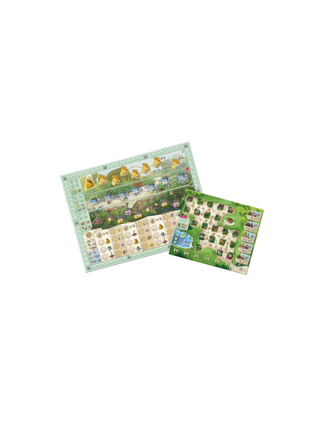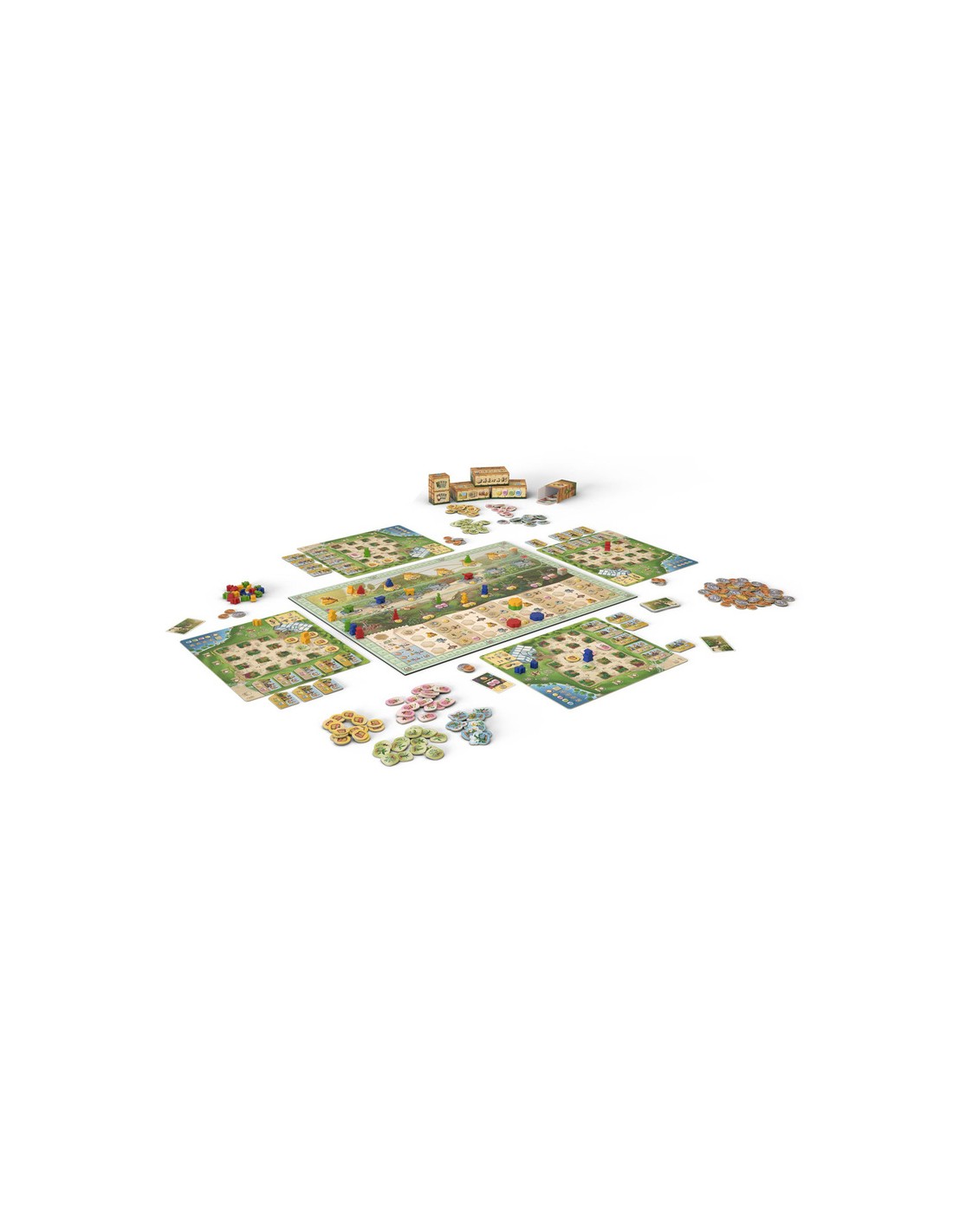 Uno de los puntos fuertes de Botanicus es su producción, mimada al detalle y con un arte claro e intuitivo. Además del tablero central y de los tableros personales de cada jugador, hay un montón de piezas de madera de colores distintos que muestran jardineros, palas, carretillas, bolsas de dinero, flores y animales. También hay varias barajas de cartas, fichas y losetas. Y para organizarlo todo, el juego incluye 5 cajitas plegables de cartón, que también facilitarán la preparación de la siguiente partida.