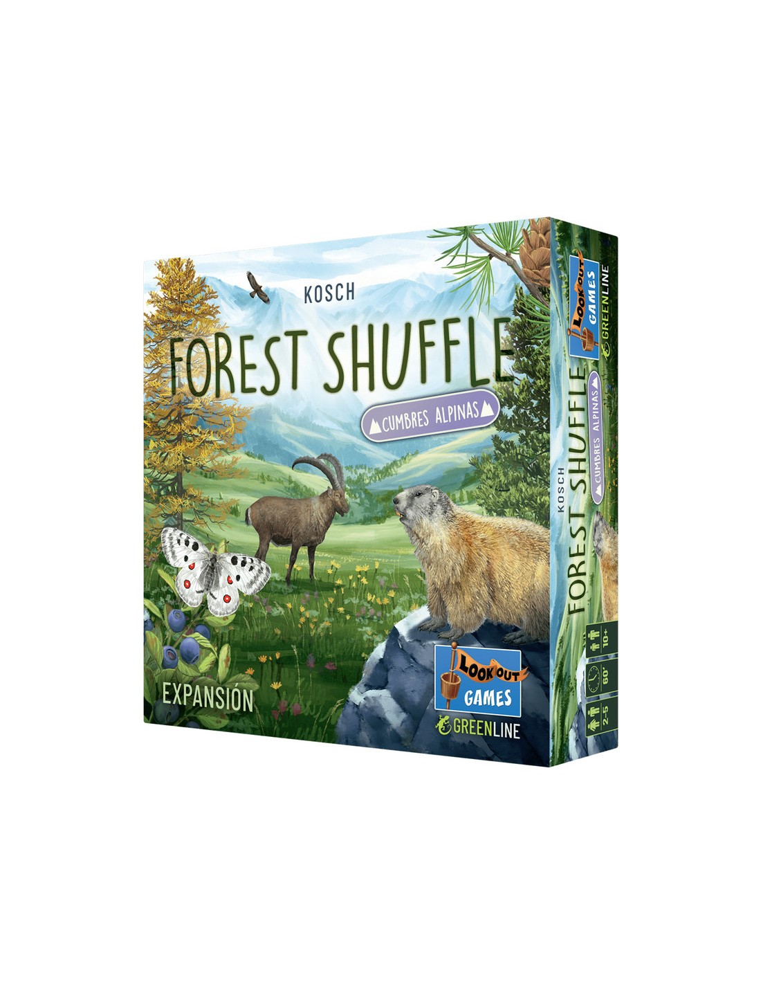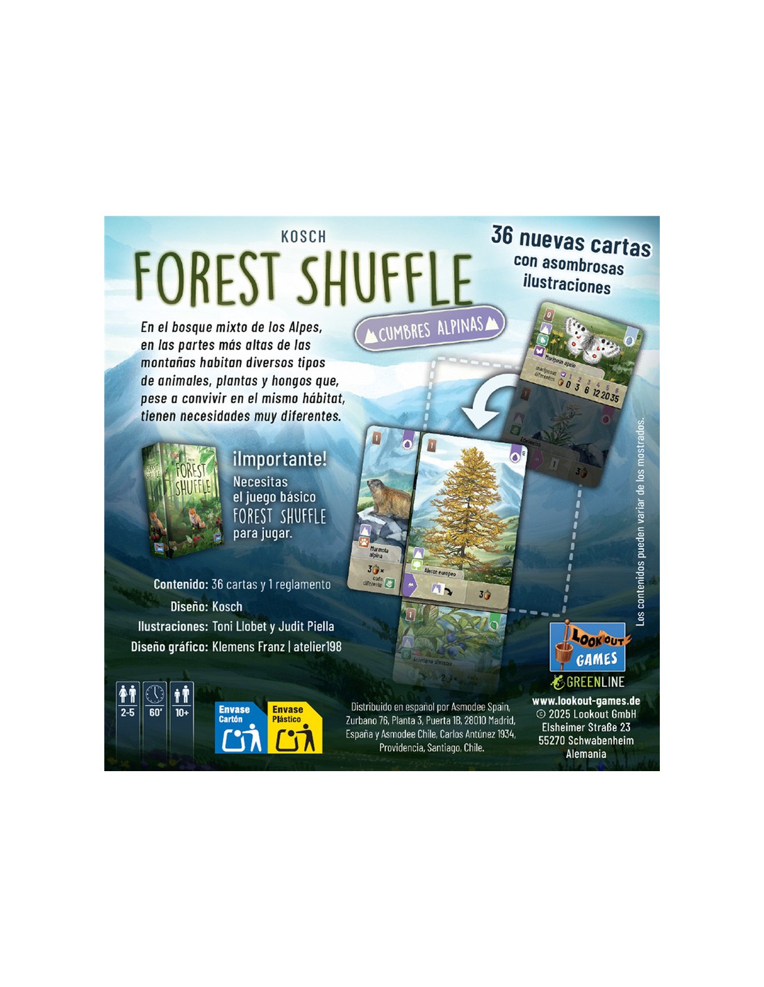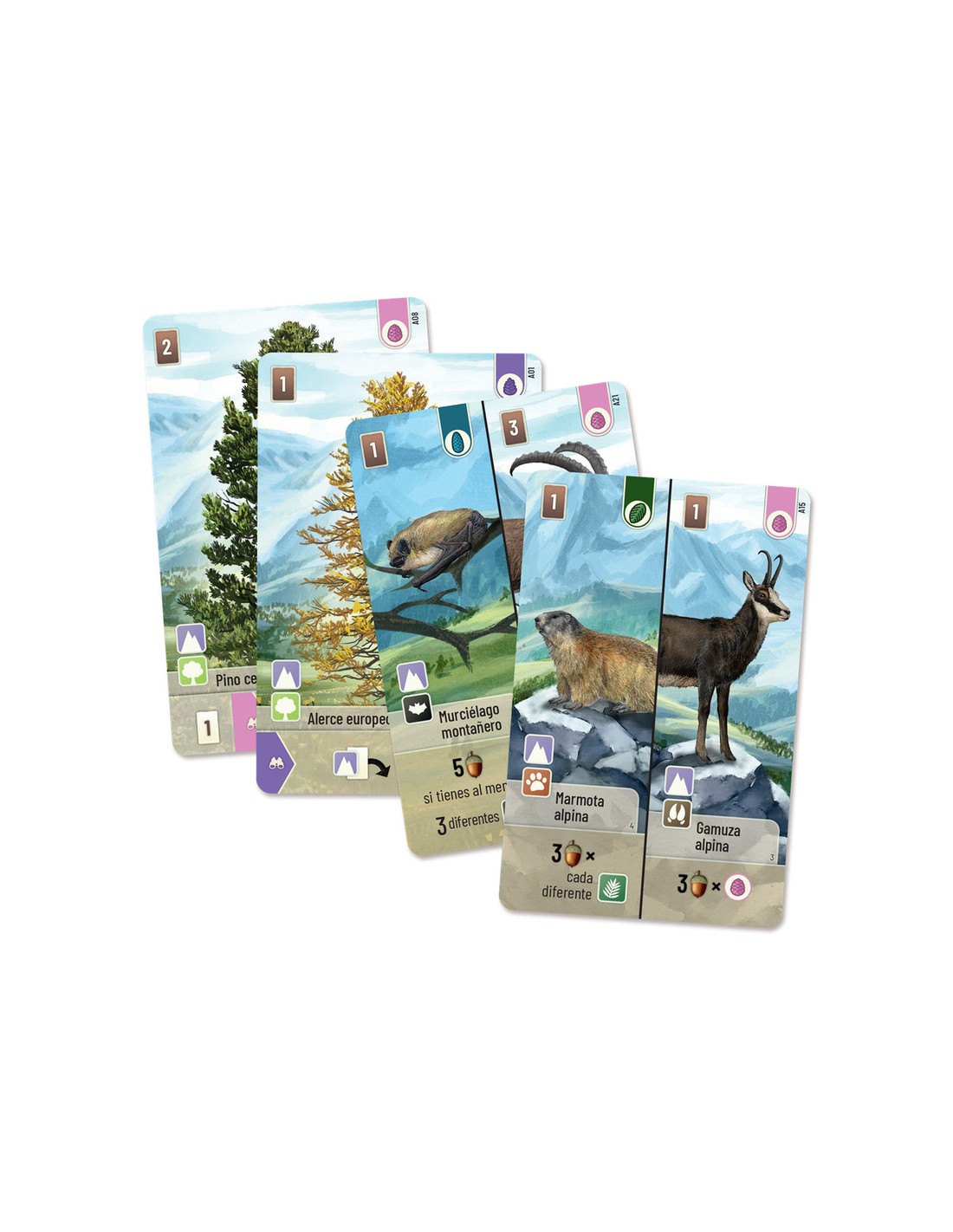 Forest Shuffle Cumbres Alpinas es una expansión para el juego Fores Shuffle que contiene 36 nuevas cartas basadas en la flora y la fauna de las partes más altas de los Alpes.